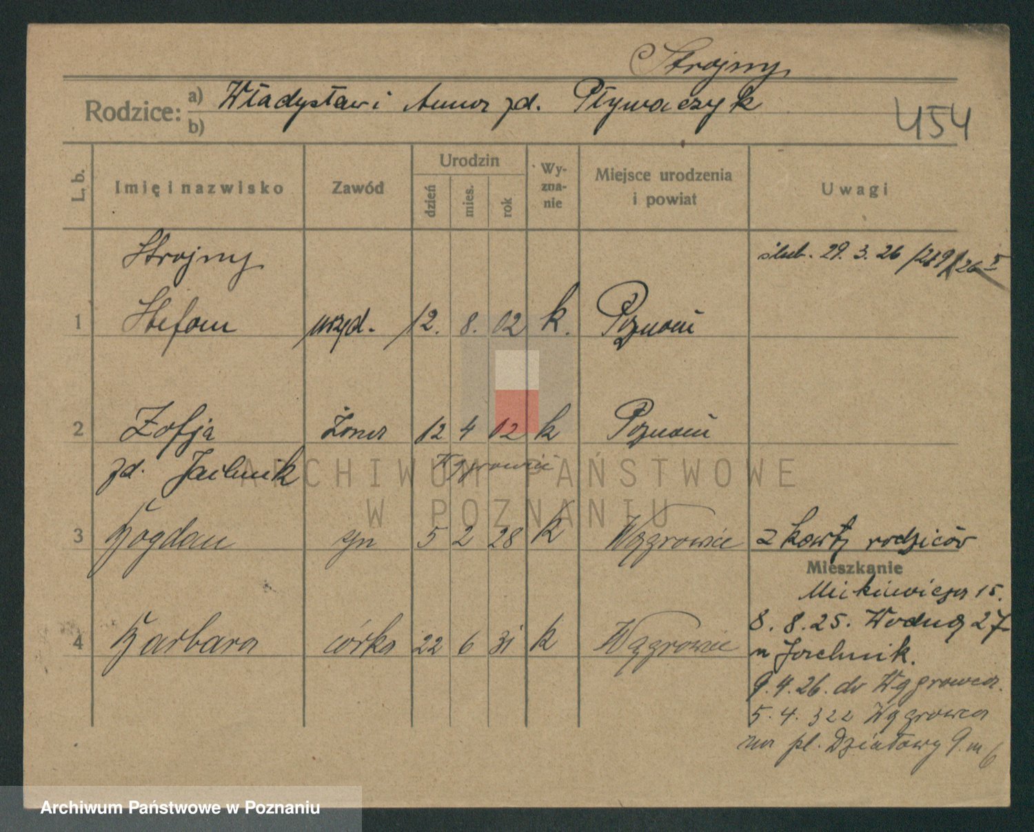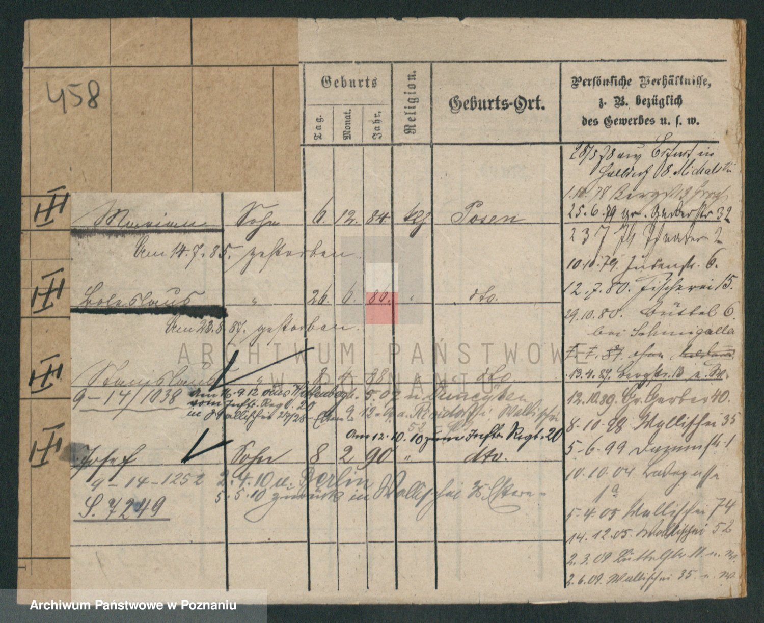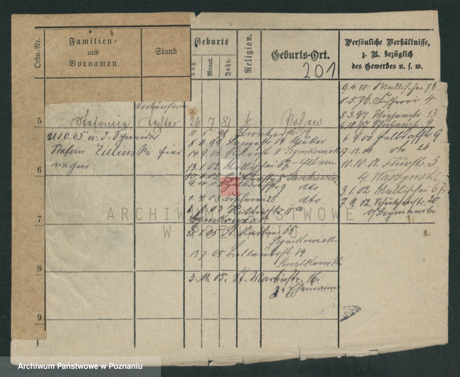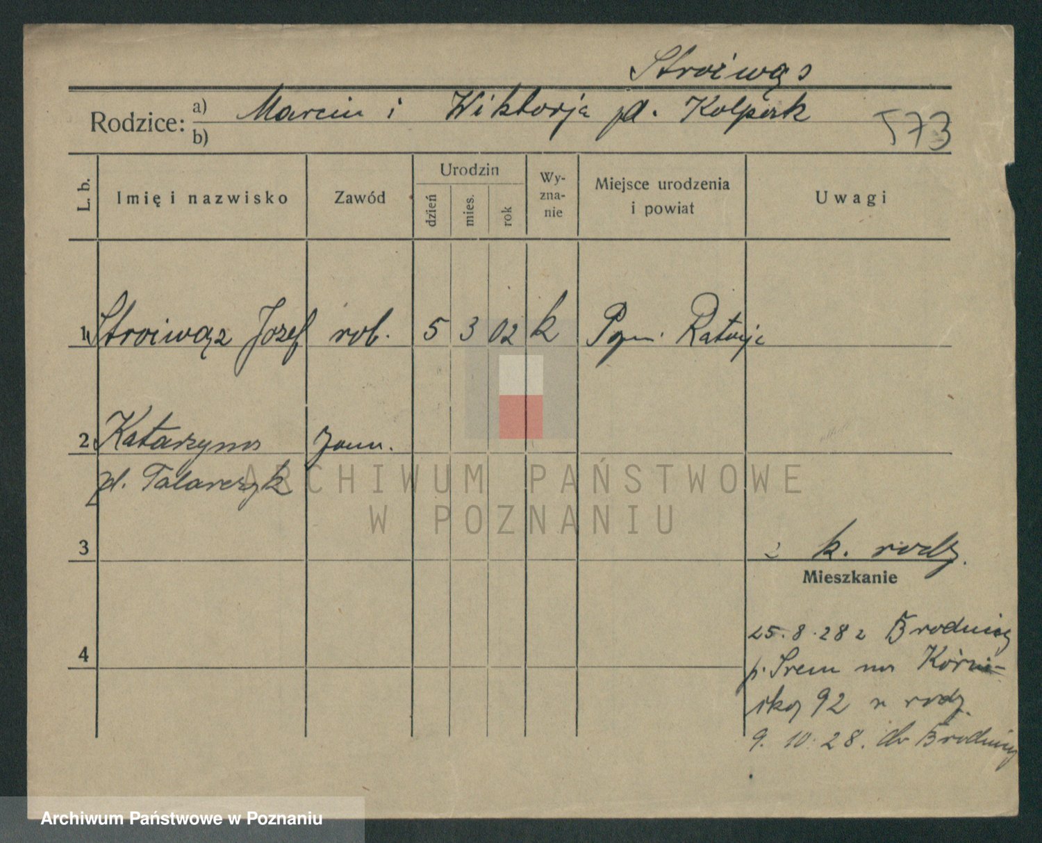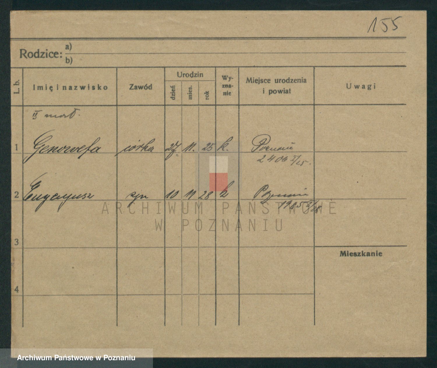 Podgląd karty osobowej dostępny jest po kliknięciu na nazwisko lub ikonkę karty. Można dokonywać powiększenia (ikony na górze) lub przechodzić między kolejnymi skanami (strzałki po bokach).