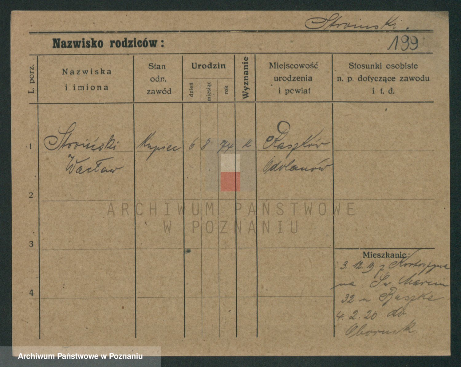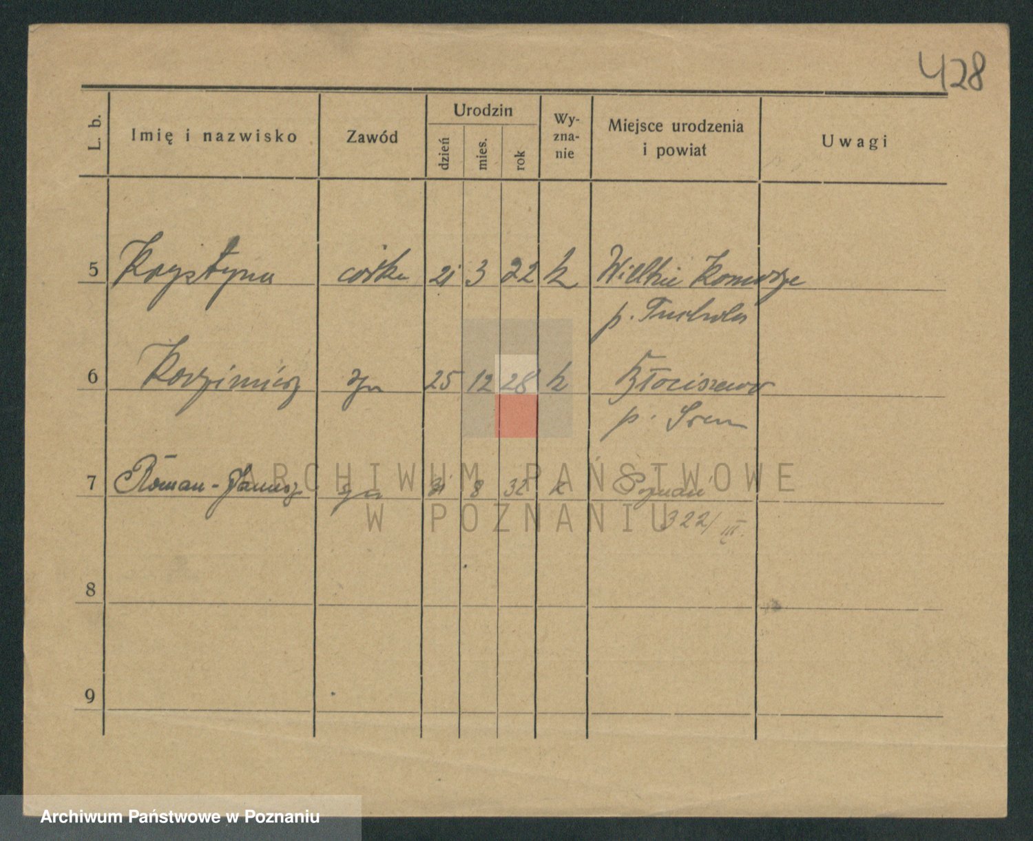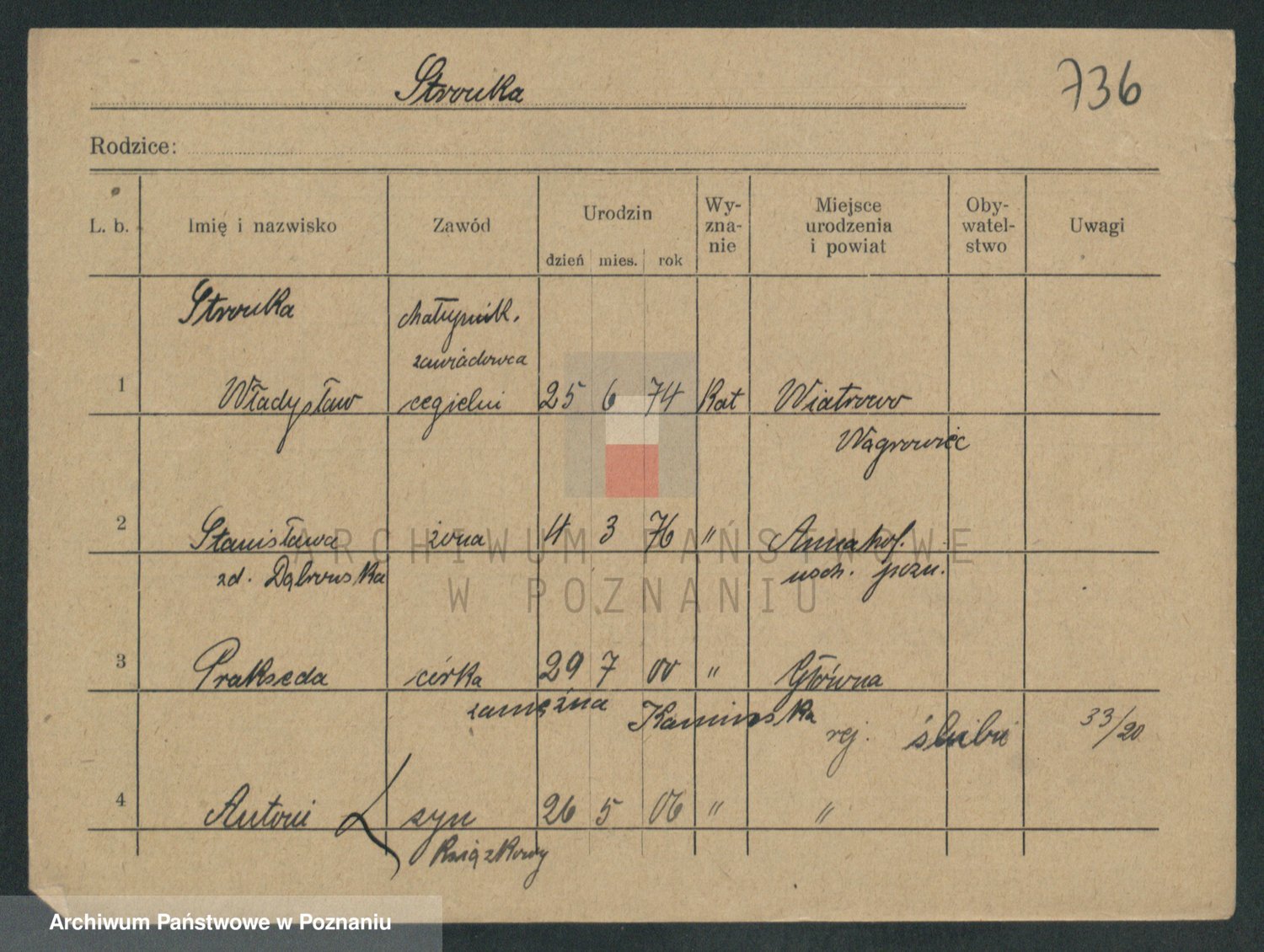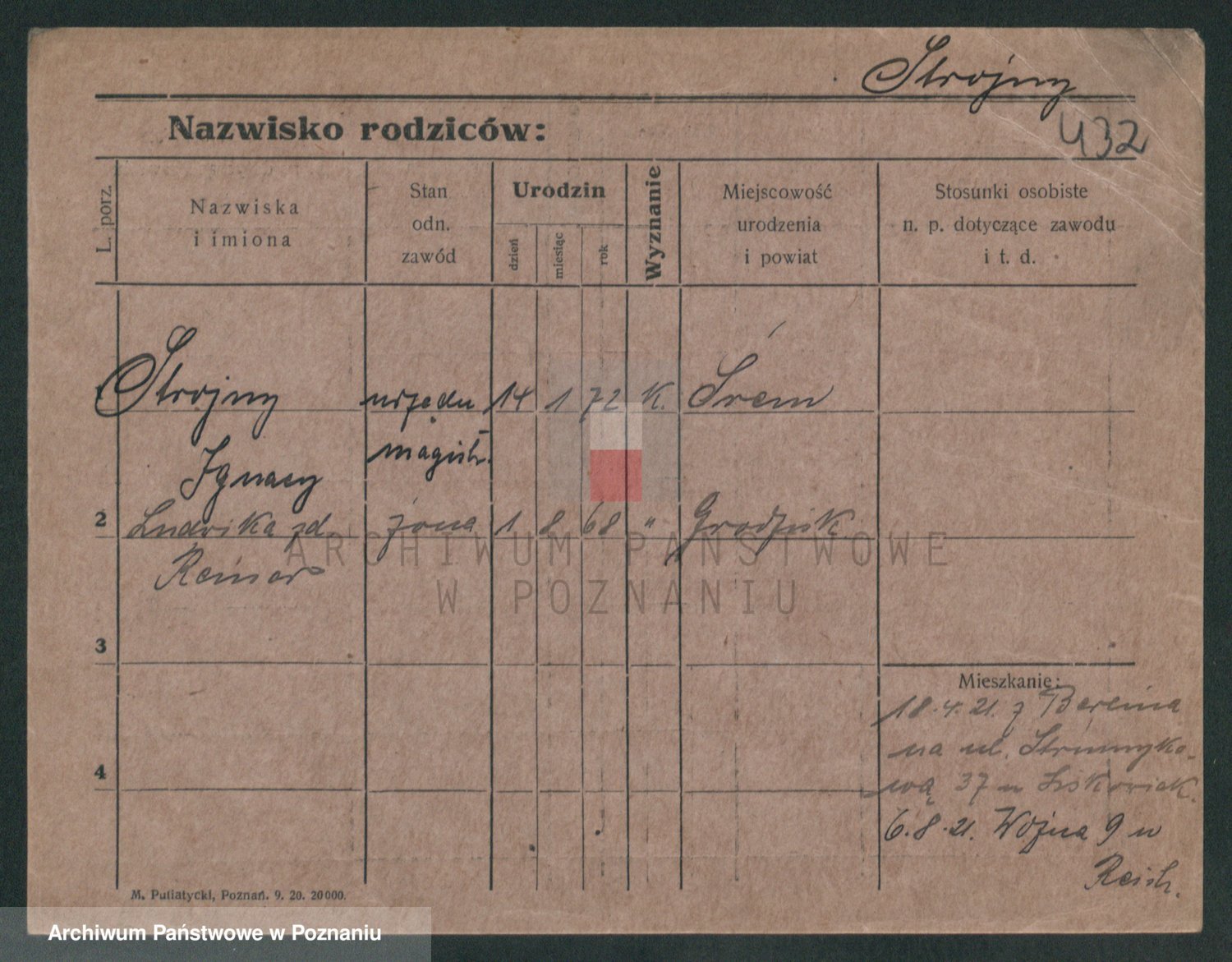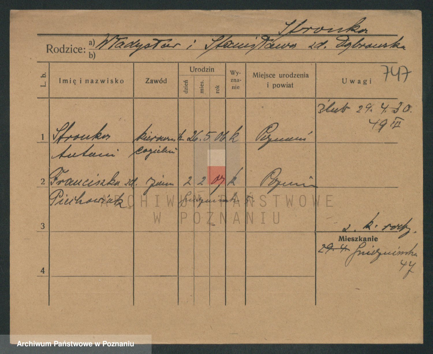 Podgląd karty osobowej dostępny jest po kliknięciu na nazwisko lub ikonkę karty. Można dokonywać powiększenia (ikony na górze) lub przechodzić między kolejnymi skanami (strzałki po bokach).