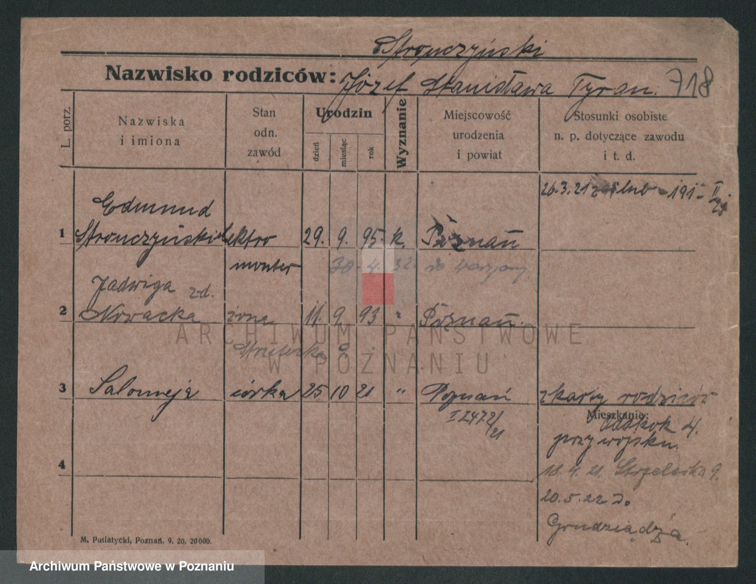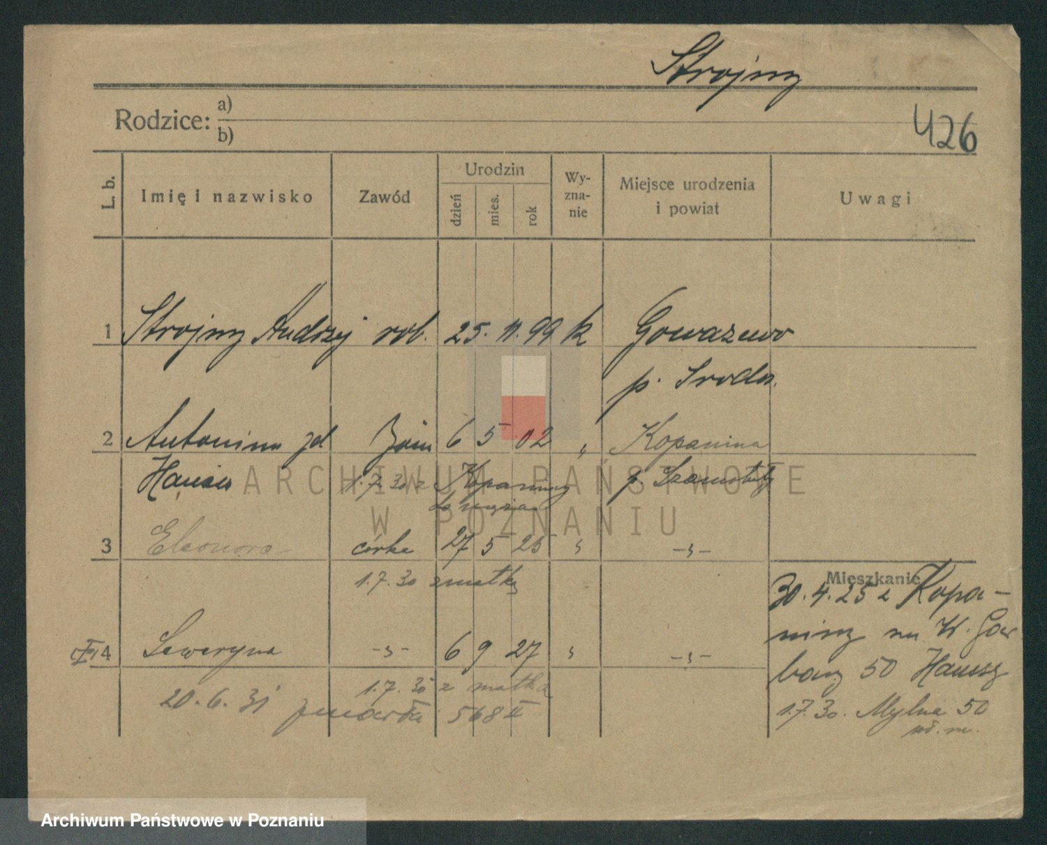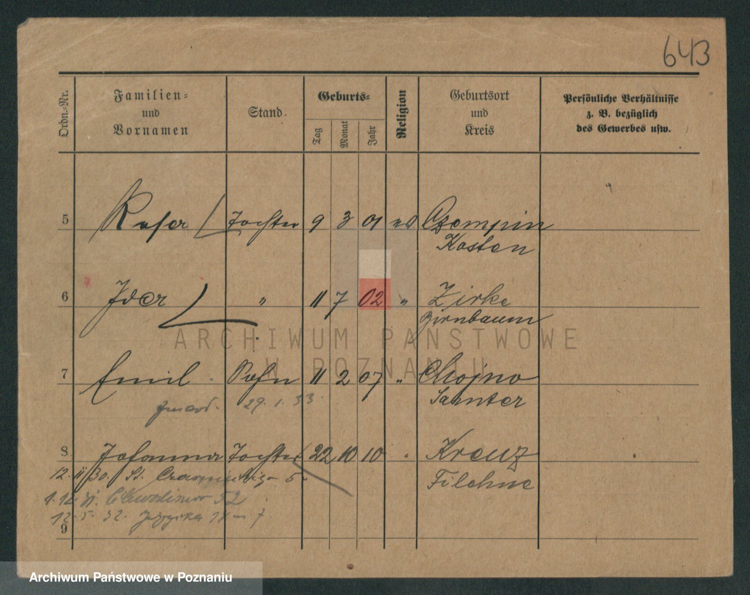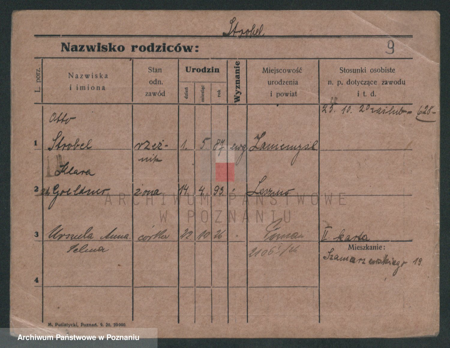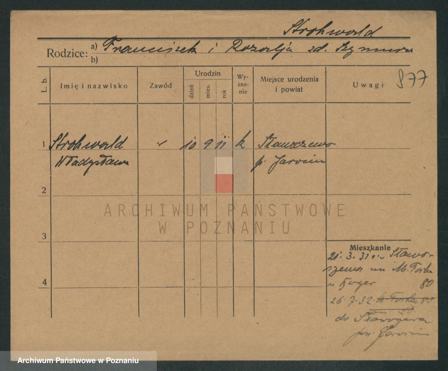 Podgląd karty osobowej dostępny jest po kliknięciu na nazwisko lub ikonkę karty. Można dokonywać powiększenia (ikony na górze) lub przechodzić między kolejnymi skanami (strzałki po bokach).