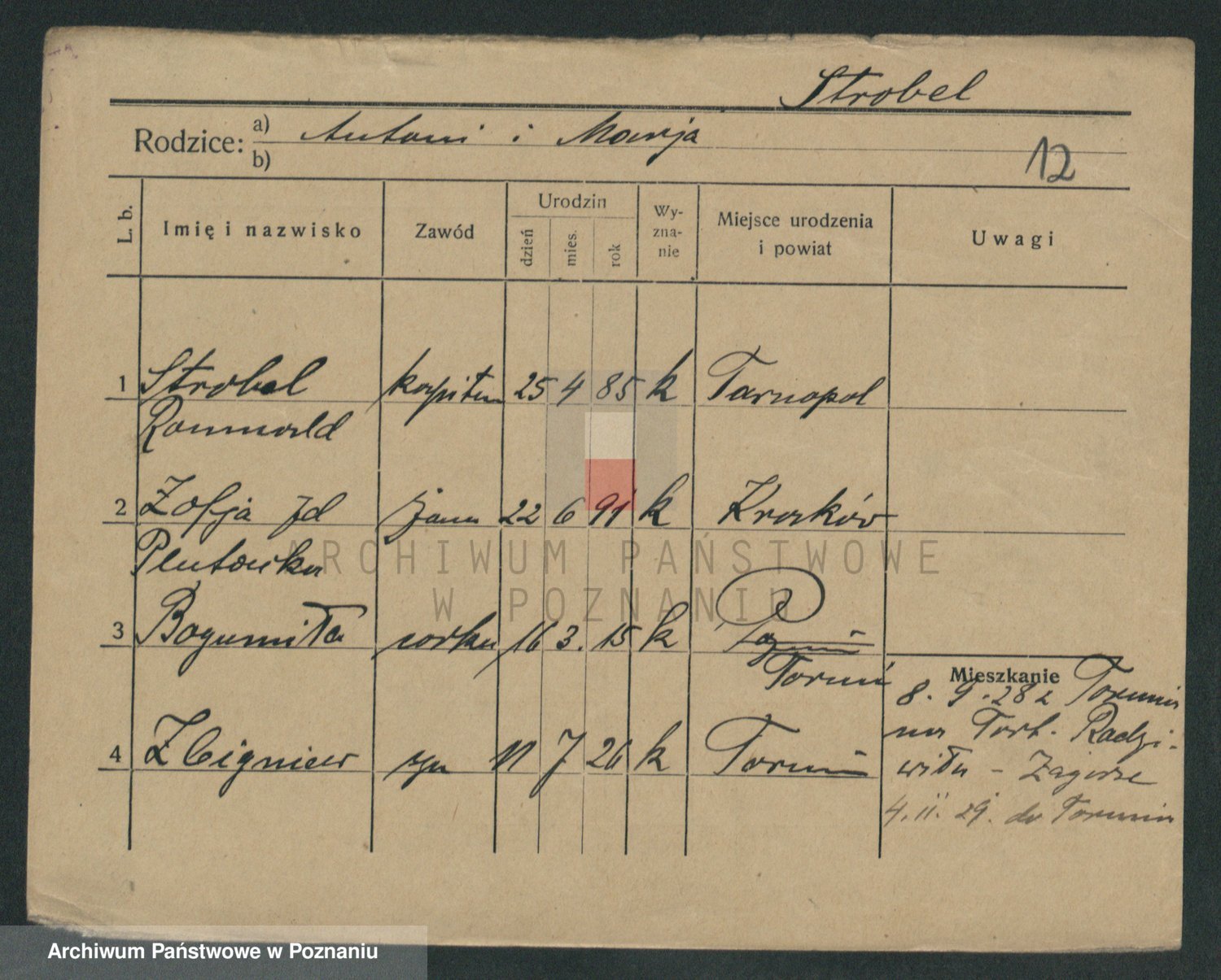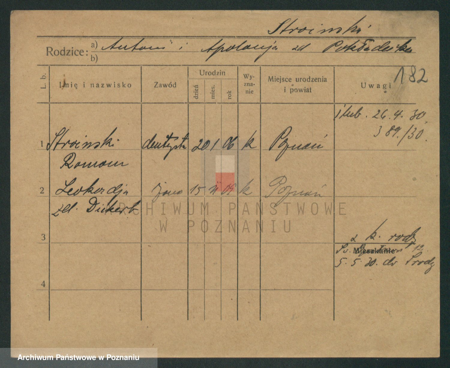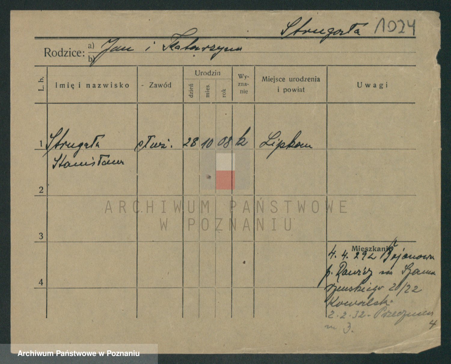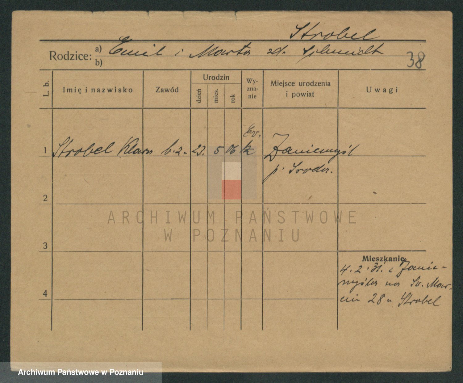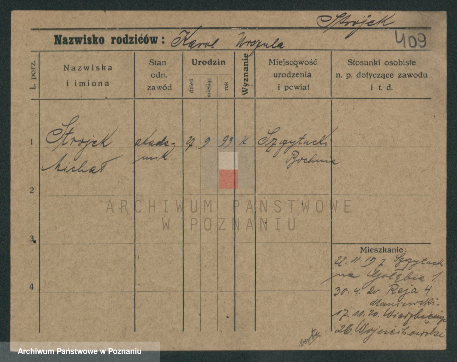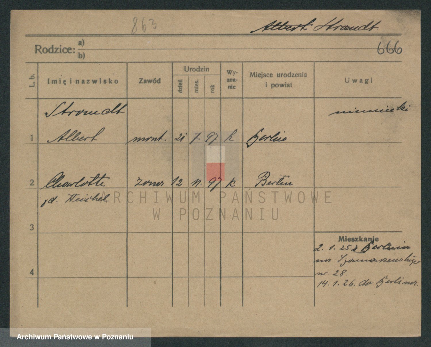 Podgląd karty osobowej dostępny jest po kliknięciu na nazwisko lub ikonkę karty. Można dokonywać powiększenia (ikony na górze) lub przechodzić między kolejnymi skanami (strzałki po bokach).