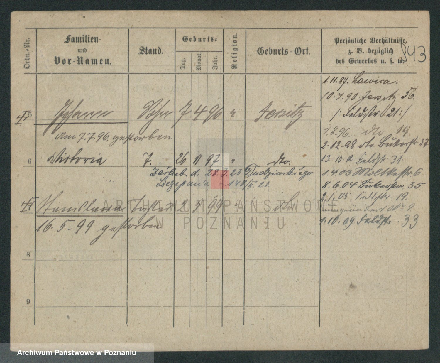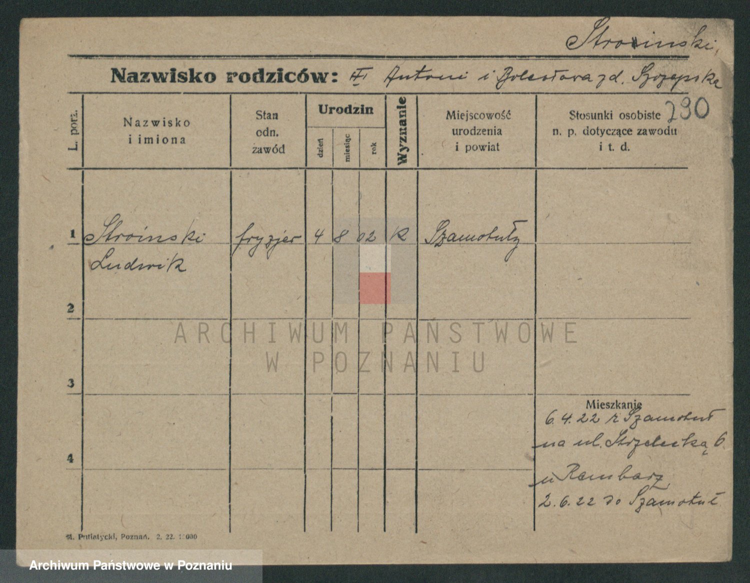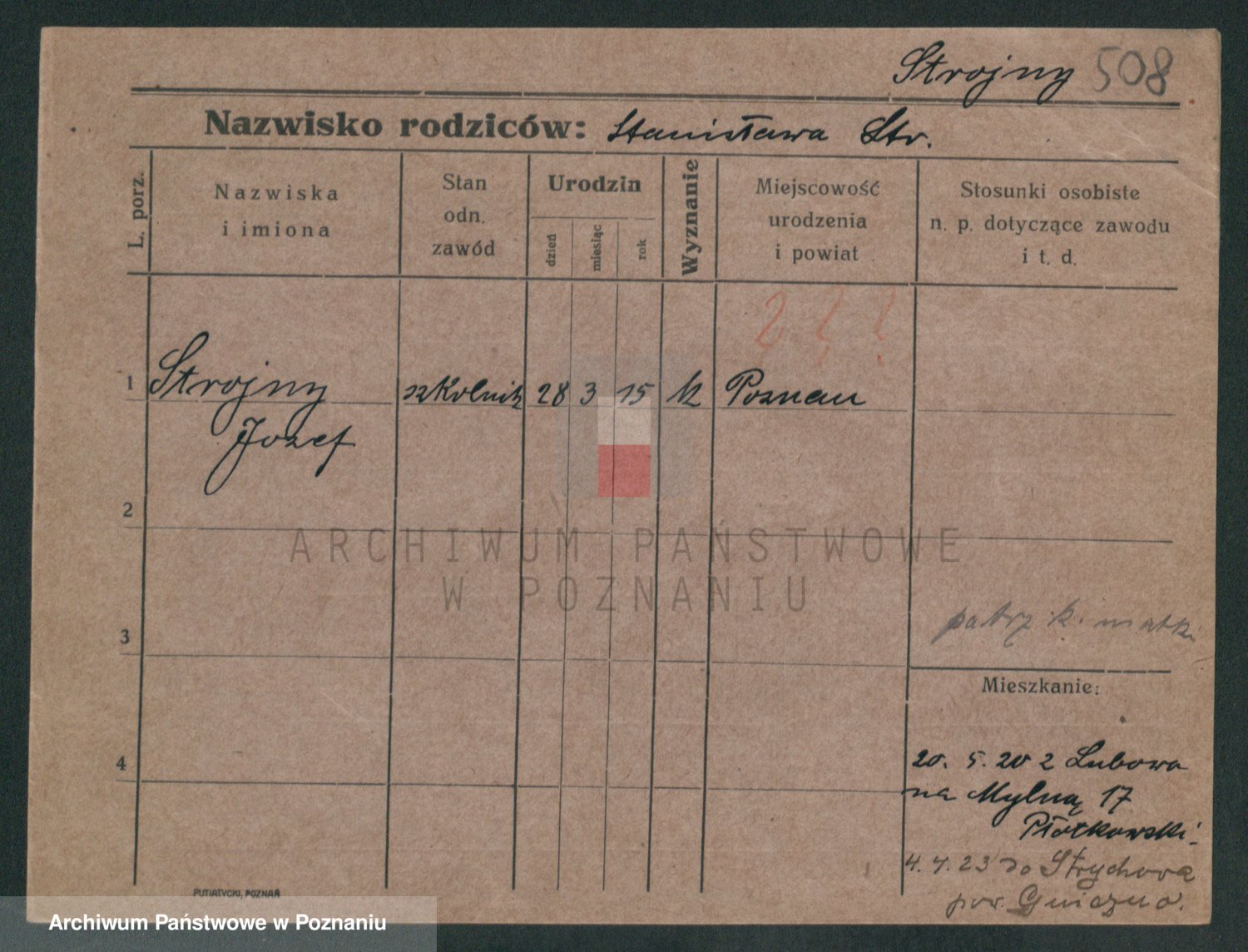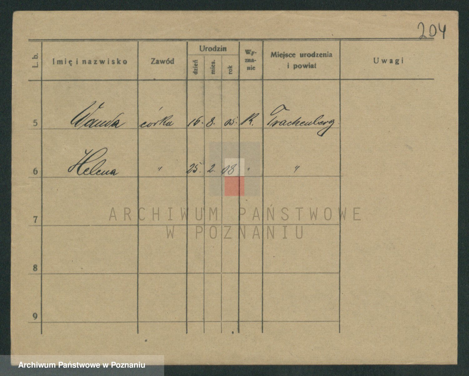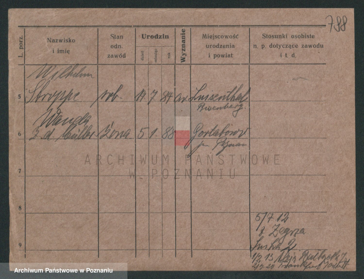Podgląd karty osobowej dostępny jest po kliknięciu na nazwisko lub ikonkę karty. Można dokonywać powiększenia (ikony na górze) lub przechodzić między kolejnymi skanami (strzałki po bokach).