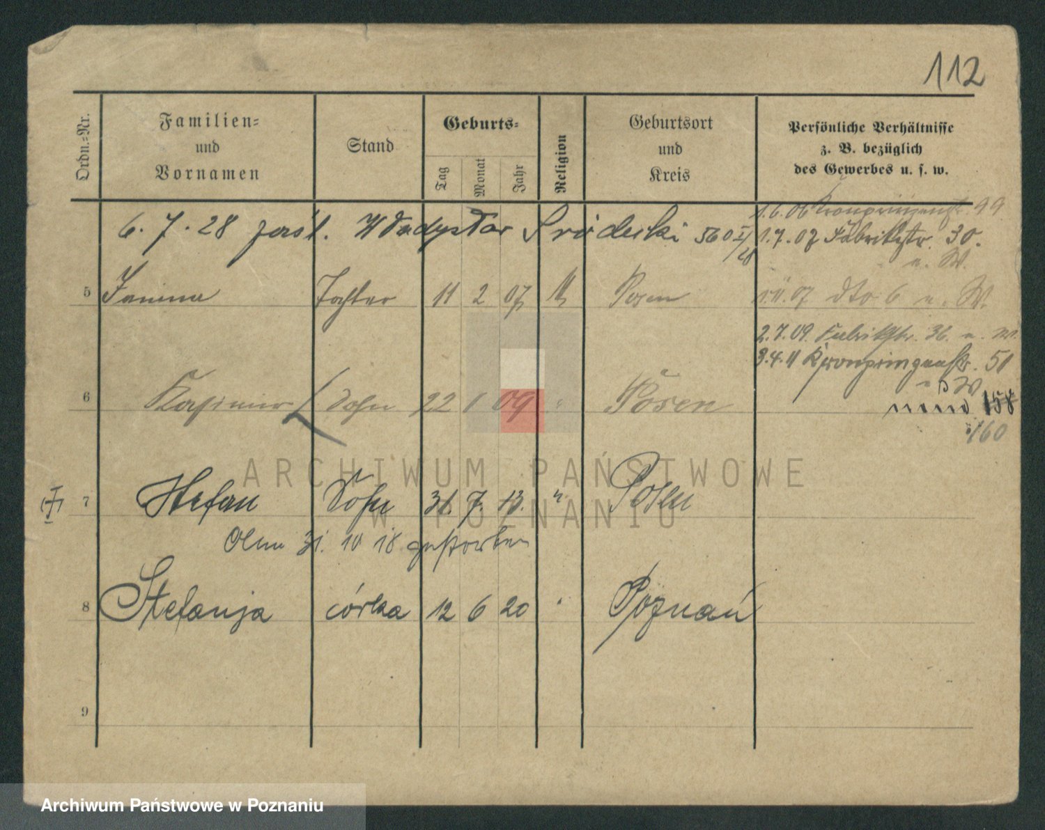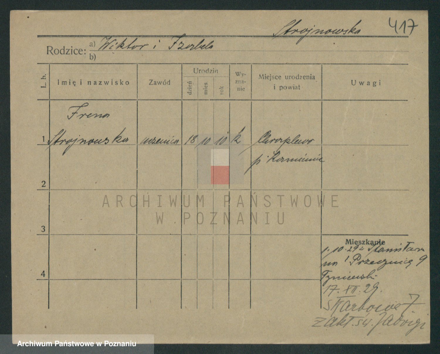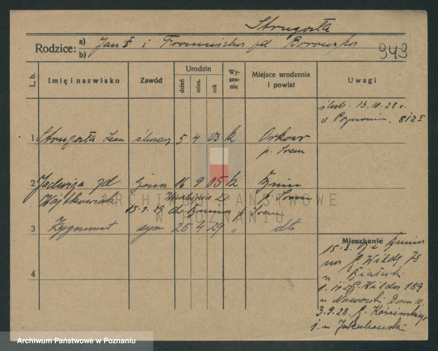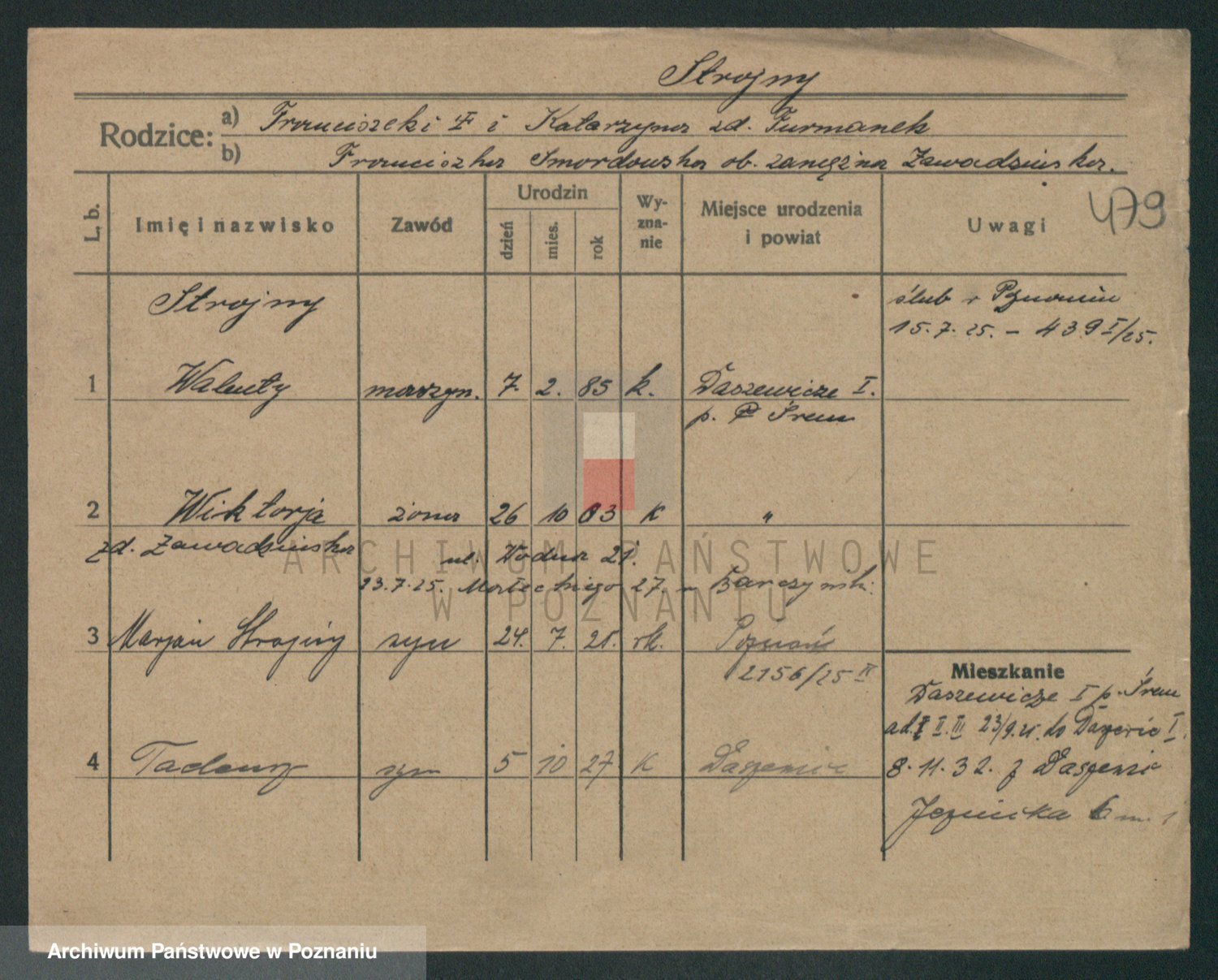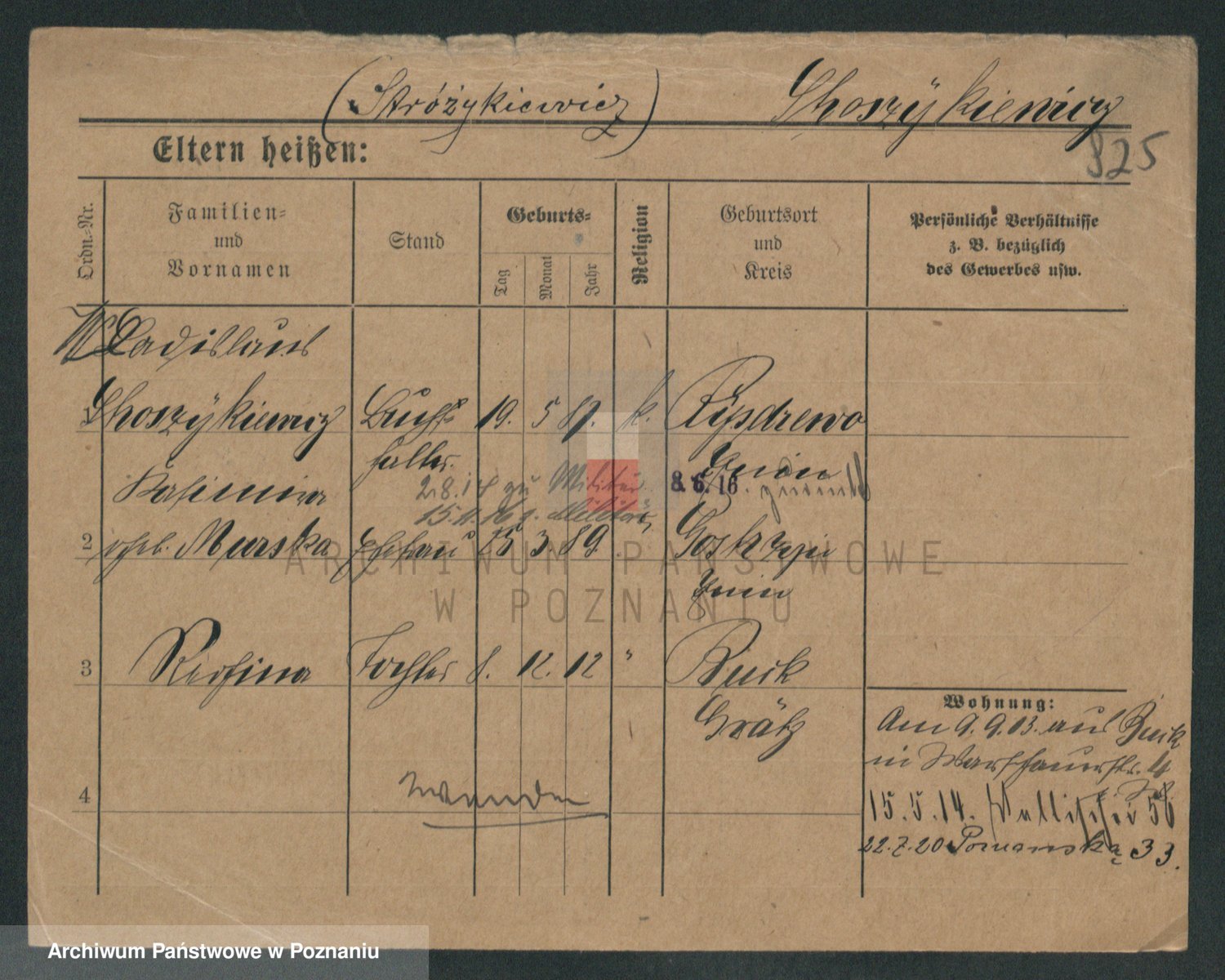 Podgląd karty osobowej dostępny jest po kliknięciu na nazwisko lub ikonkę karty. Można dokonywać powiększenia (ikony na górze) lub przechodzić między kolejnymi skanami (strzałki po bokach).