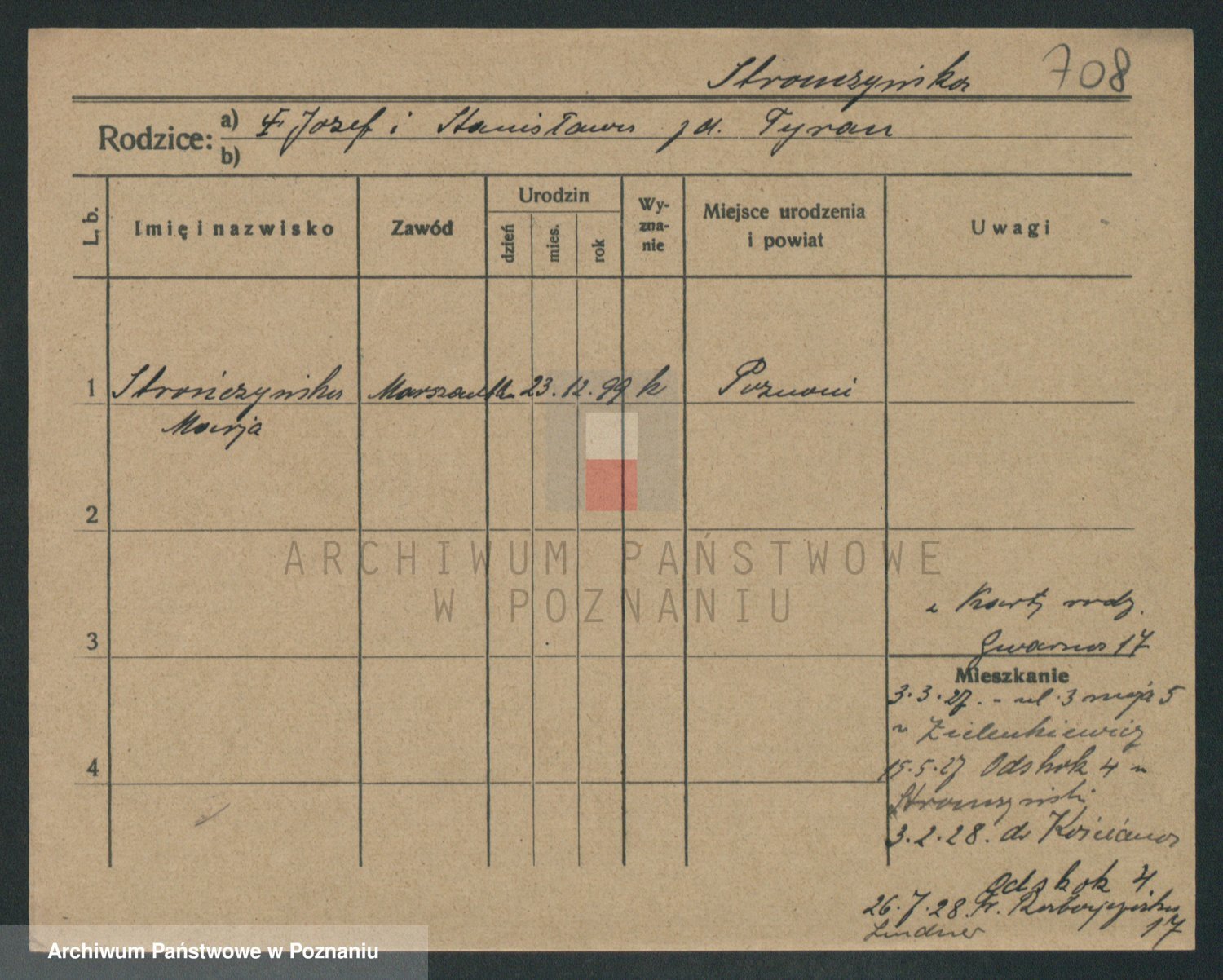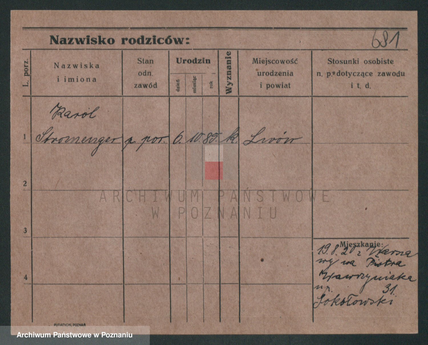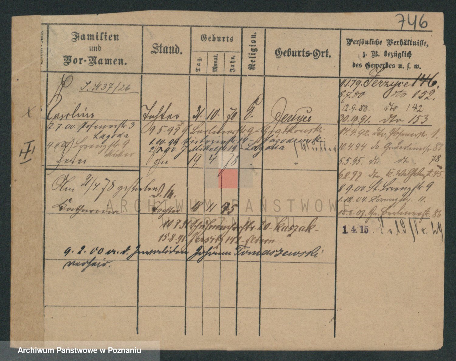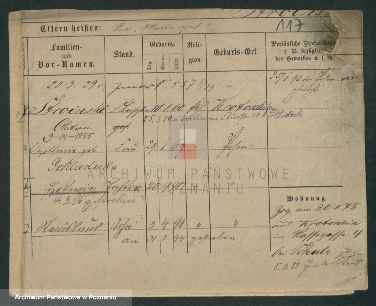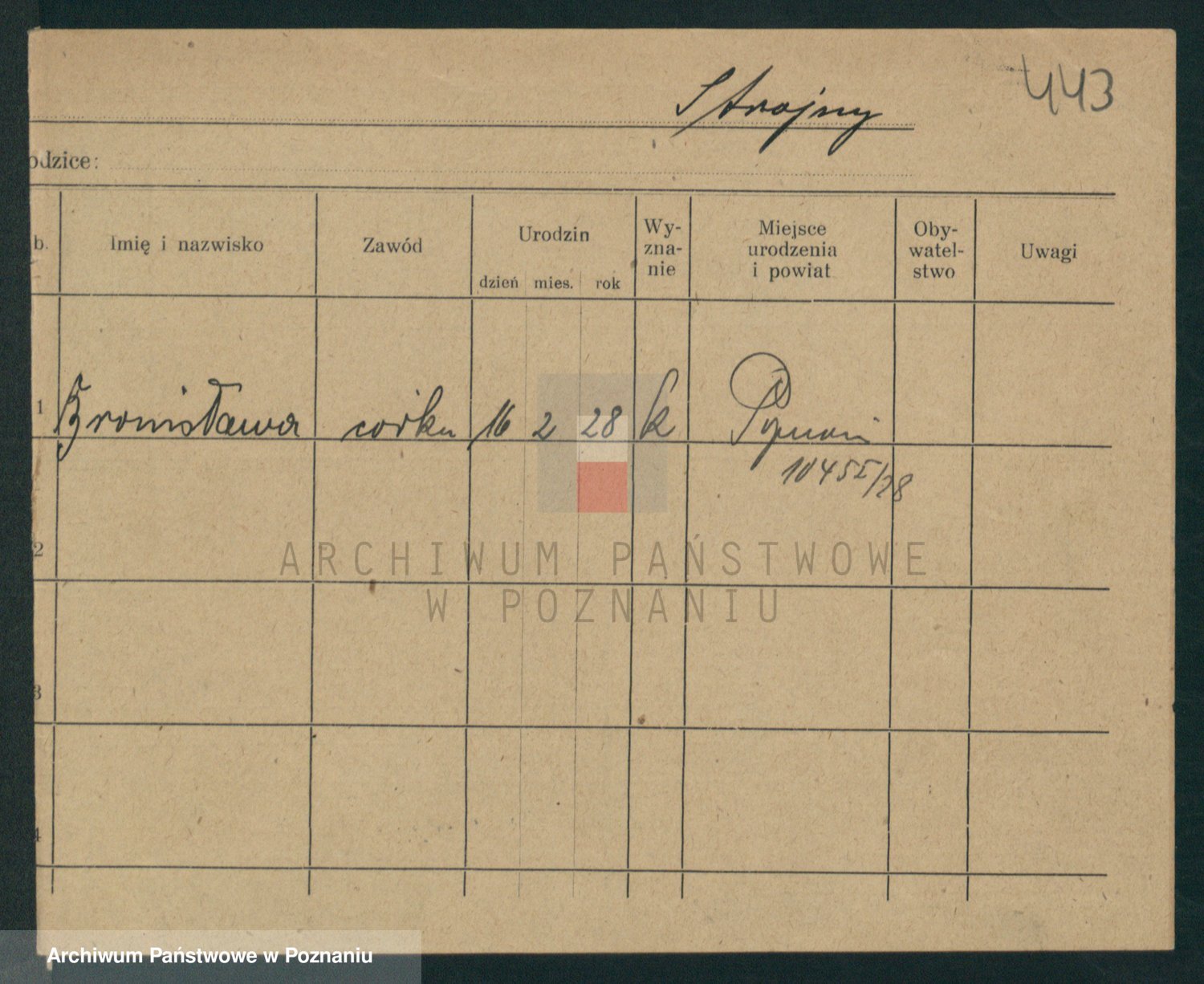 Podgląd karty osobowej dostępny jest po kliknięciu na nazwisko lub ikonkę karty. Można dokonywać powiększenia (ikony na górze) lub przechodzić między kolejnymi skanami (strzałki po bokach).
