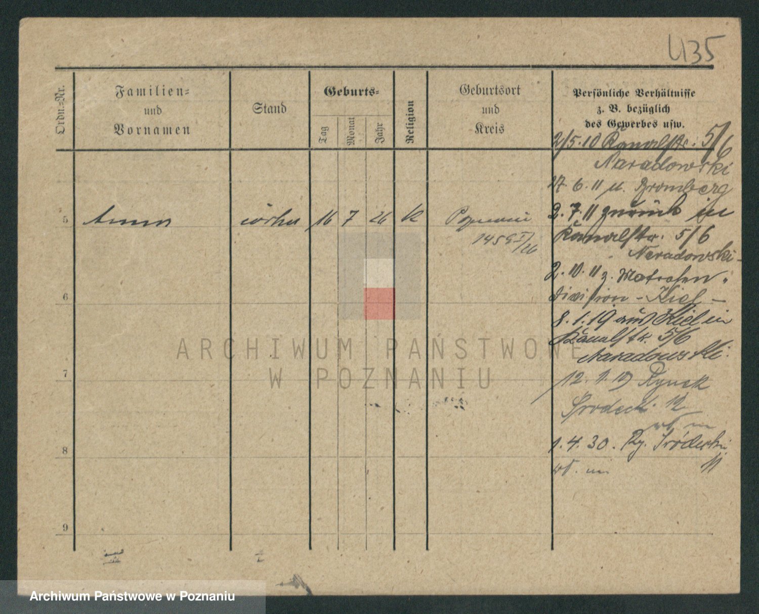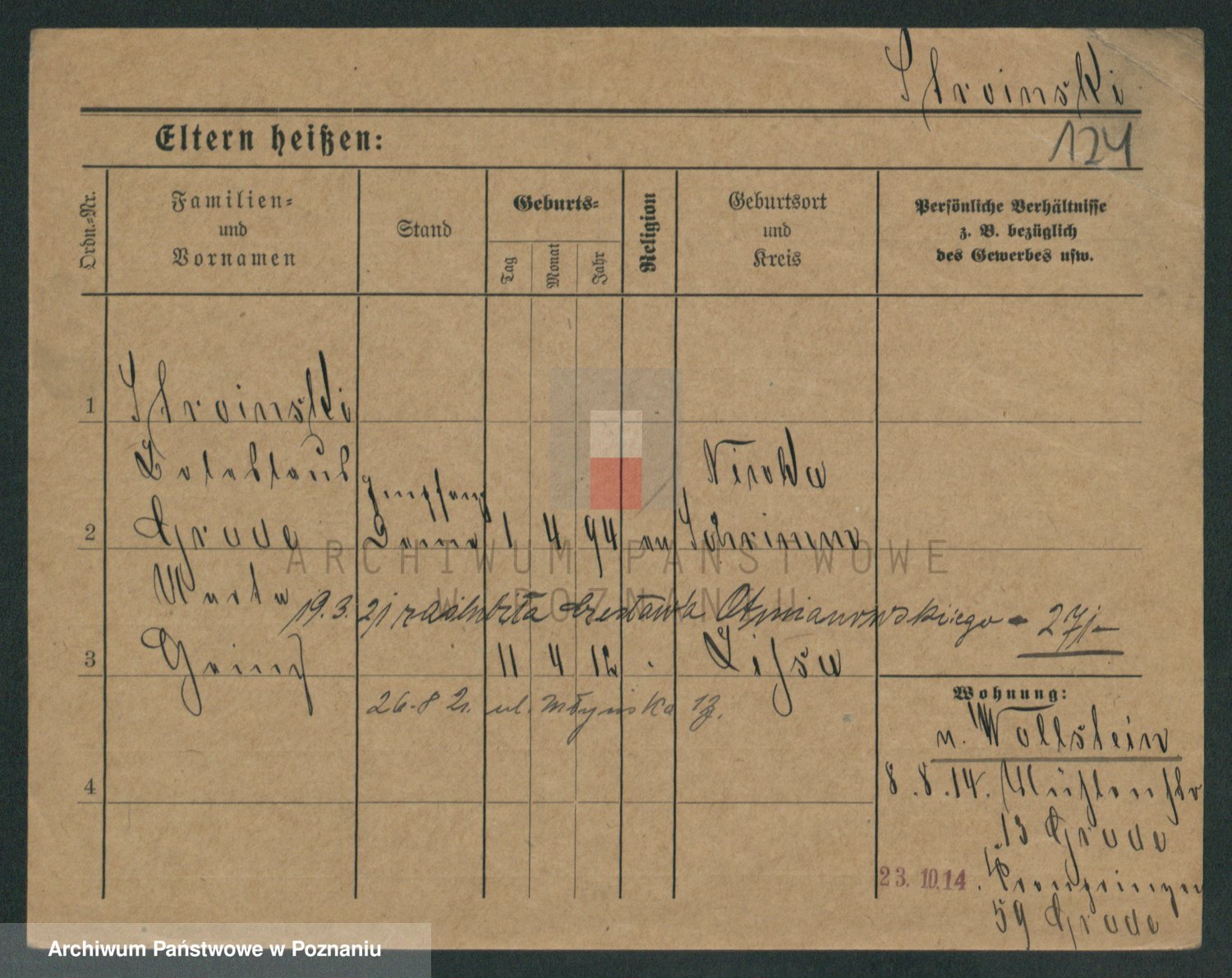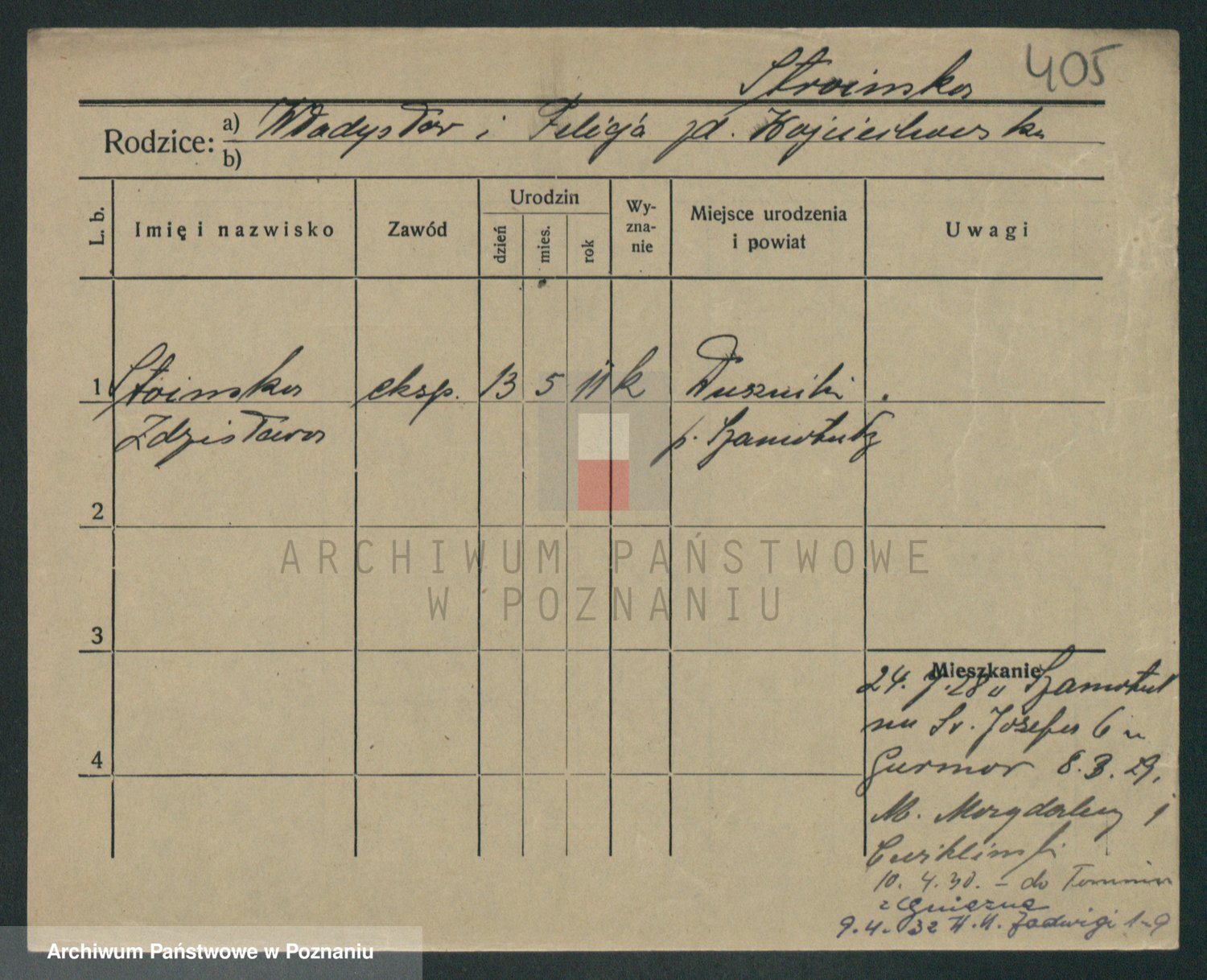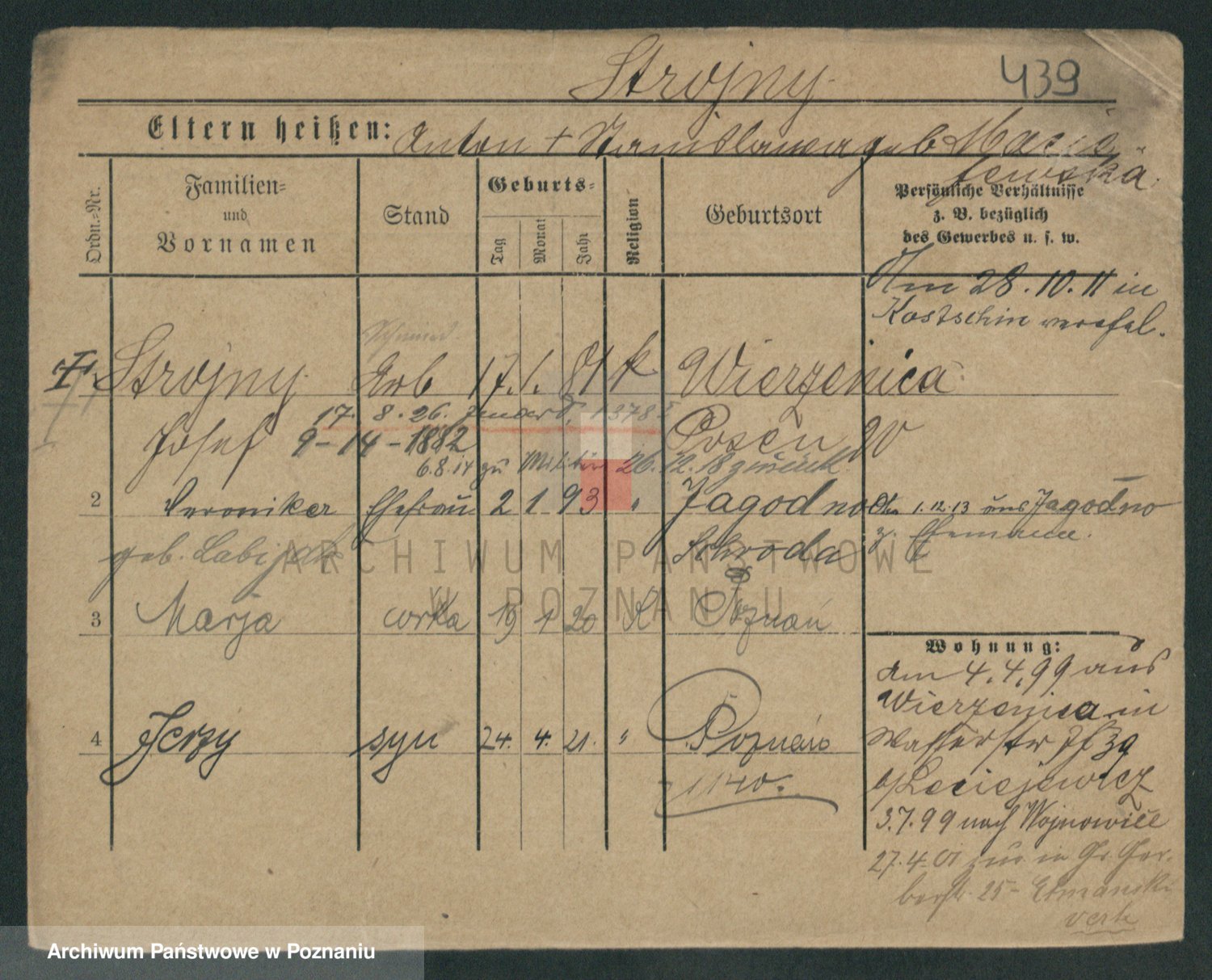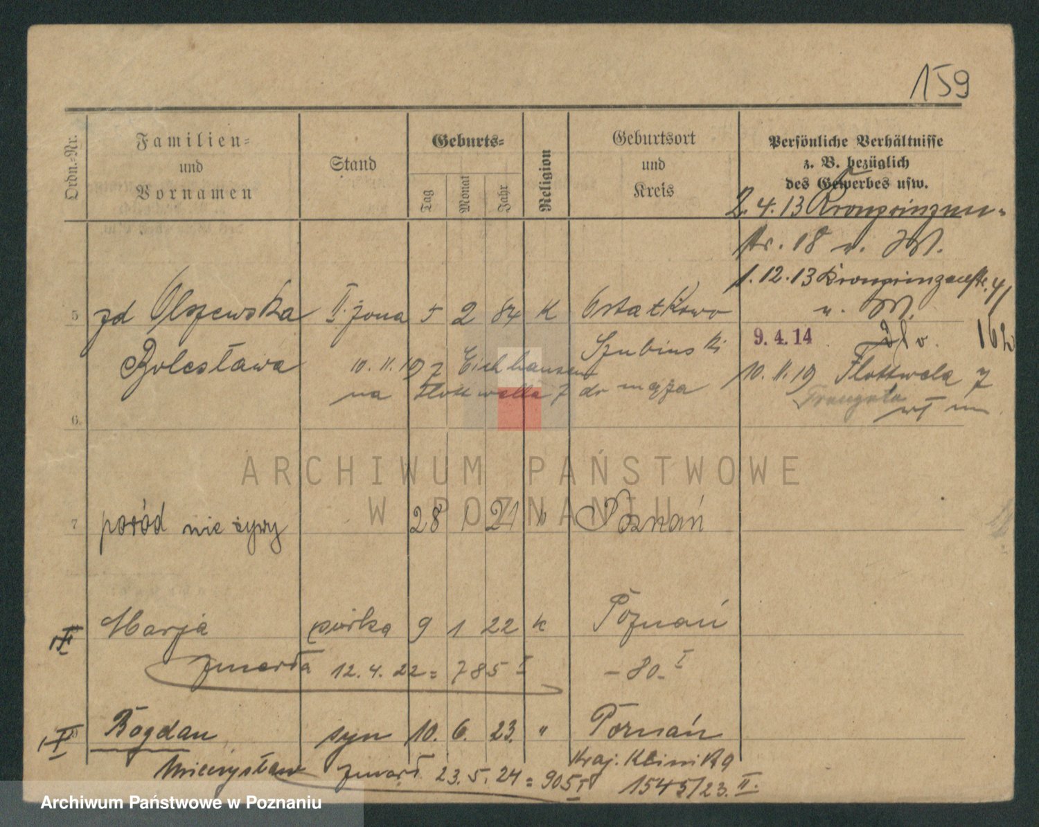 Podgląd karty osobowej dostępny jest po kliknięciu na nazwisko lub ikonkę karty. Można dokonywać powiększenia (ikony na górze) lub przechodzić między kolejnymi skanami (strzałki po bokach).