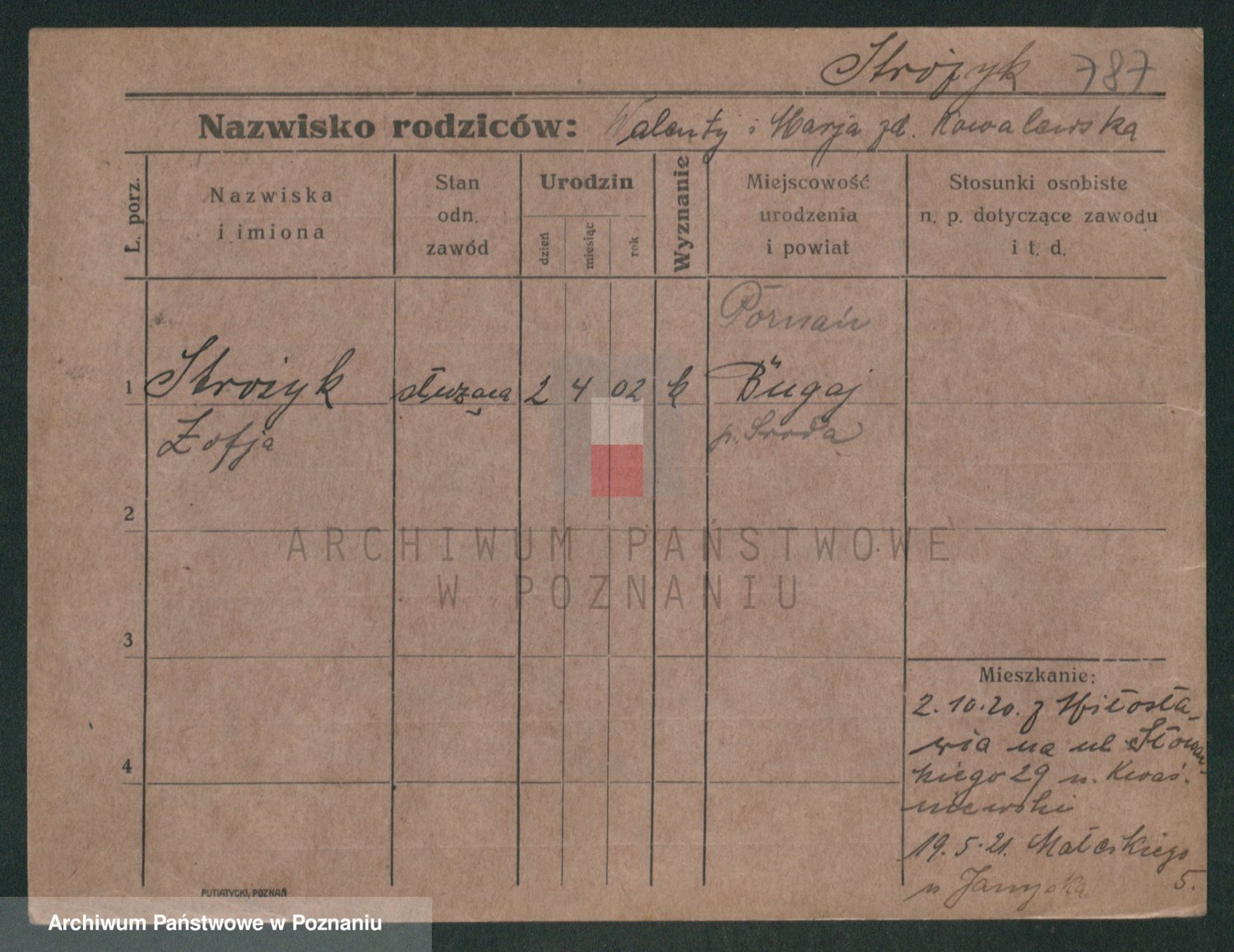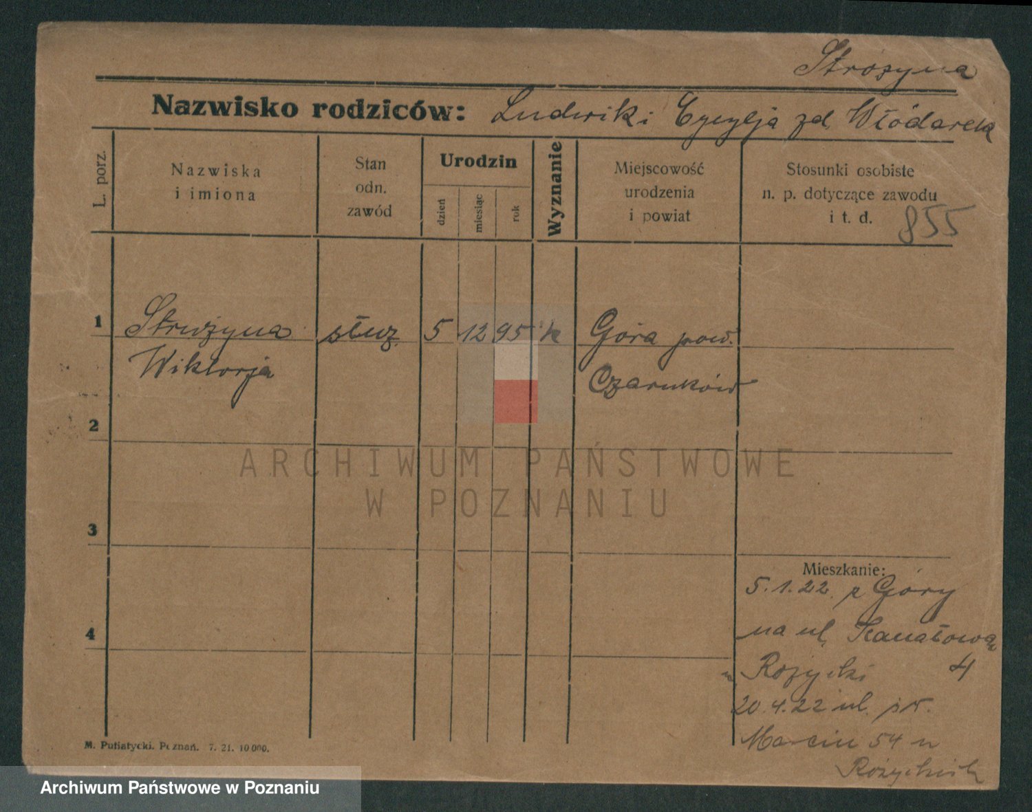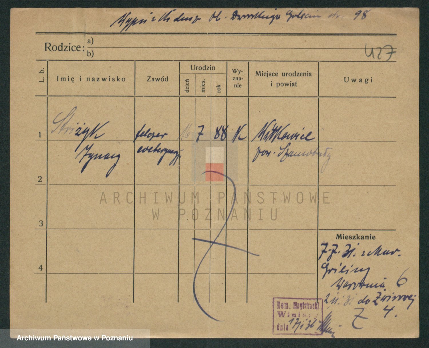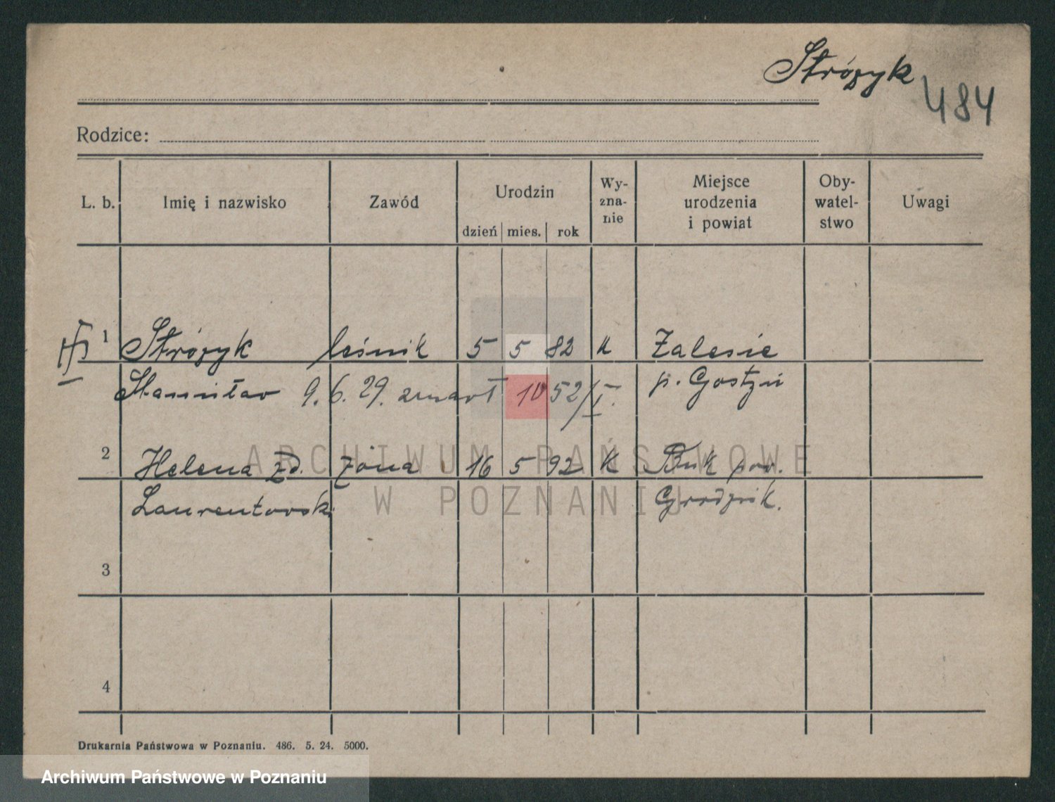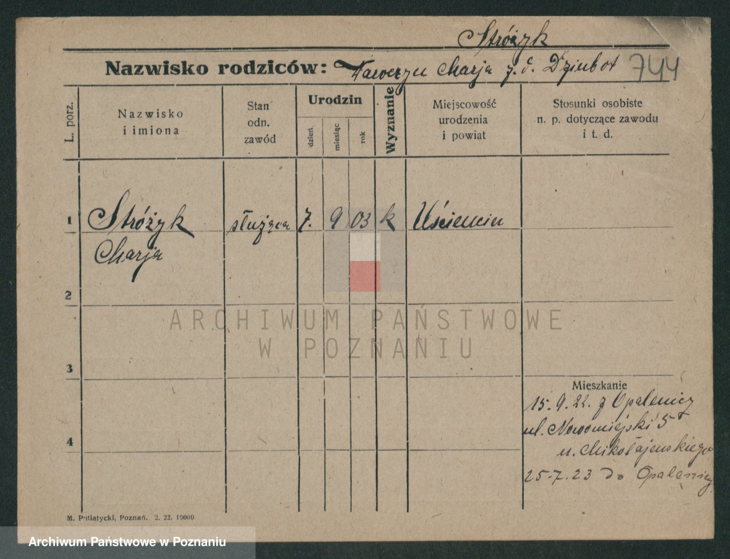 Podgląd karty osobowej dostępny jest po kliknięciu na nazwisko lub ikonkę karty. Można dokonywać powiększenia (ikony na górze) lub przechodzić między kolejnymi skanami (strzałki po bokach).