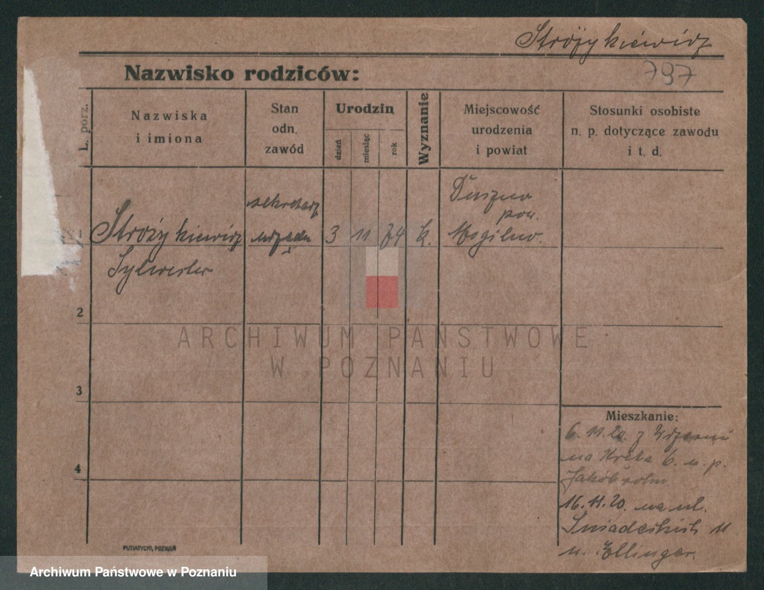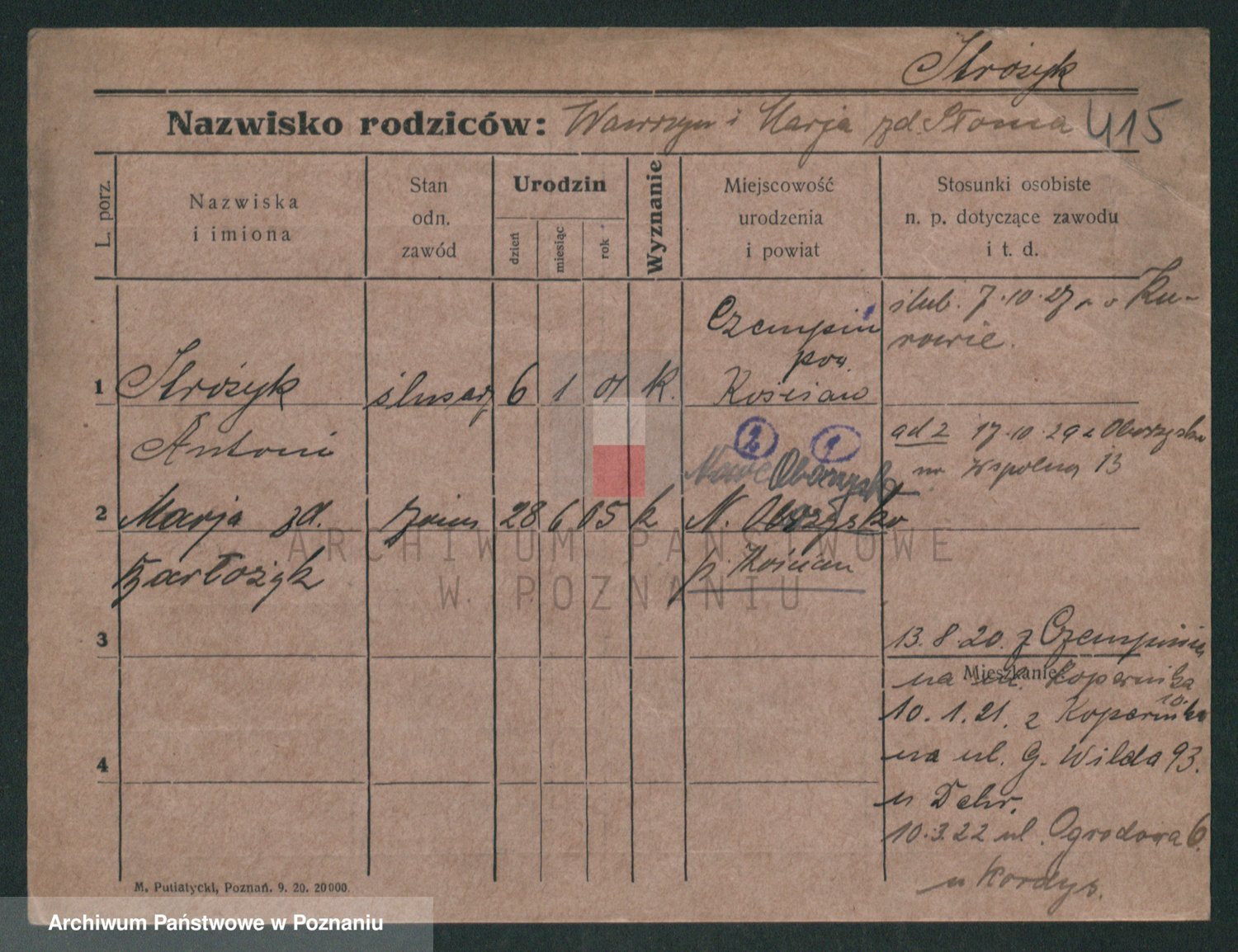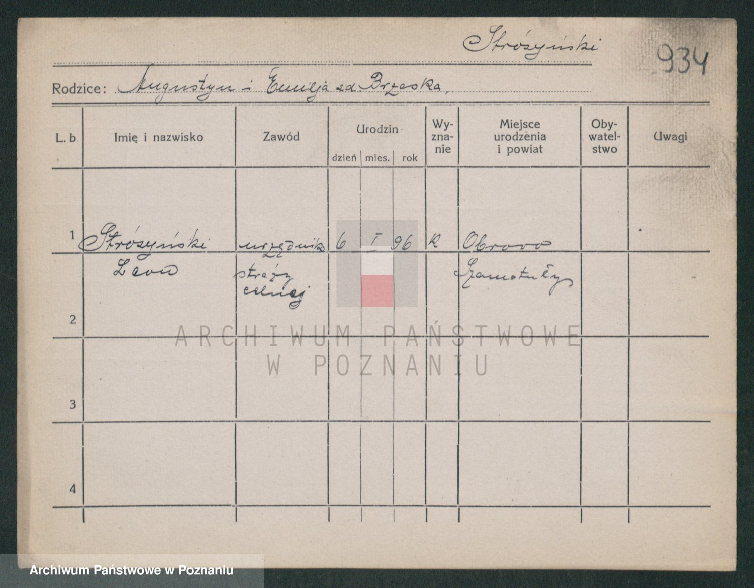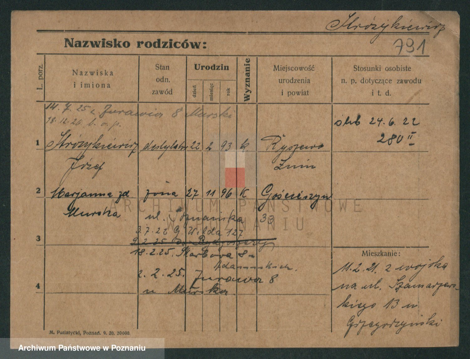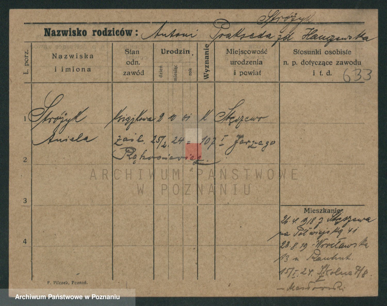 Podgląd karty osobowej dostępny jest po kliknięciu na nazwisko lub ikonkę karty. Można dokonywać powiększenia (ikony na górze) lub przechodzić między kolejnymi skanami (strzałki po bokach).