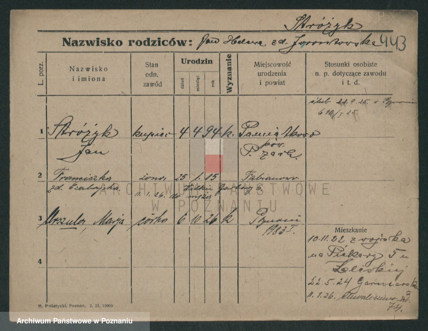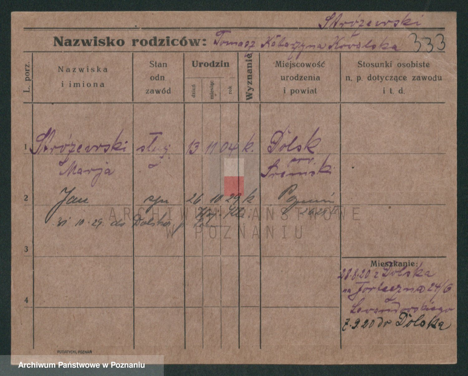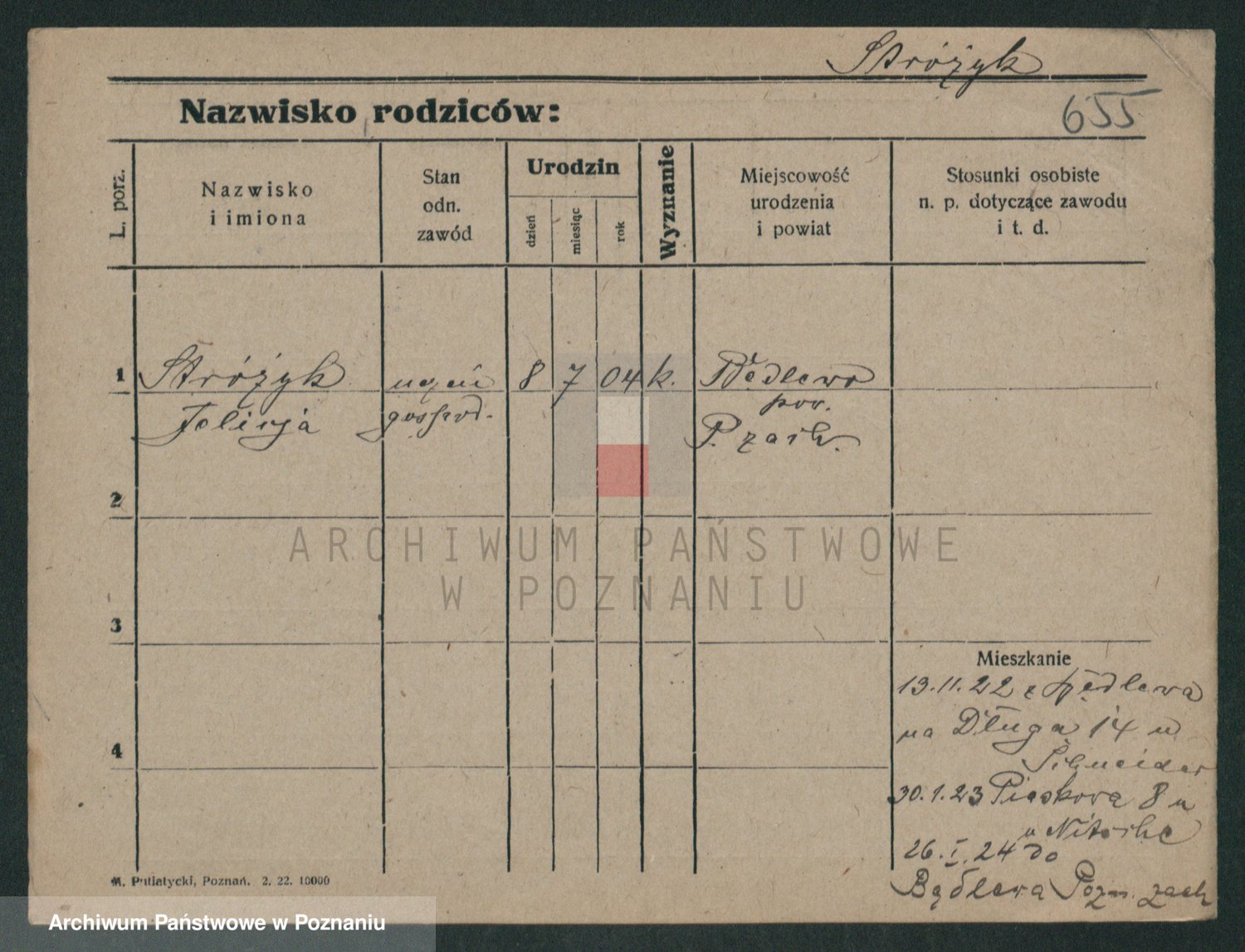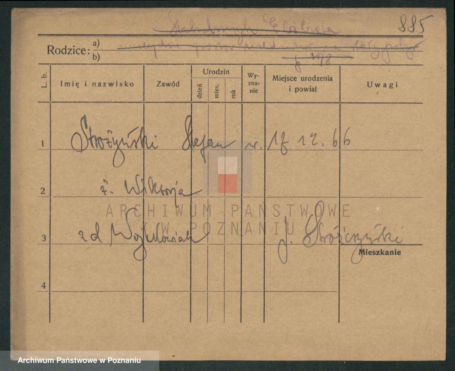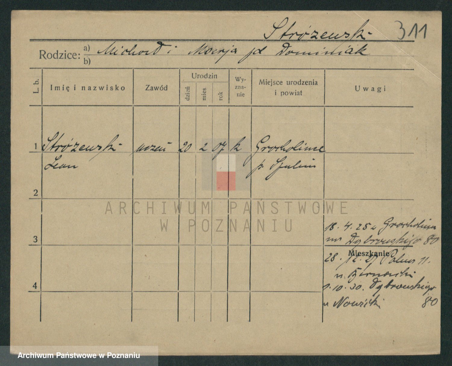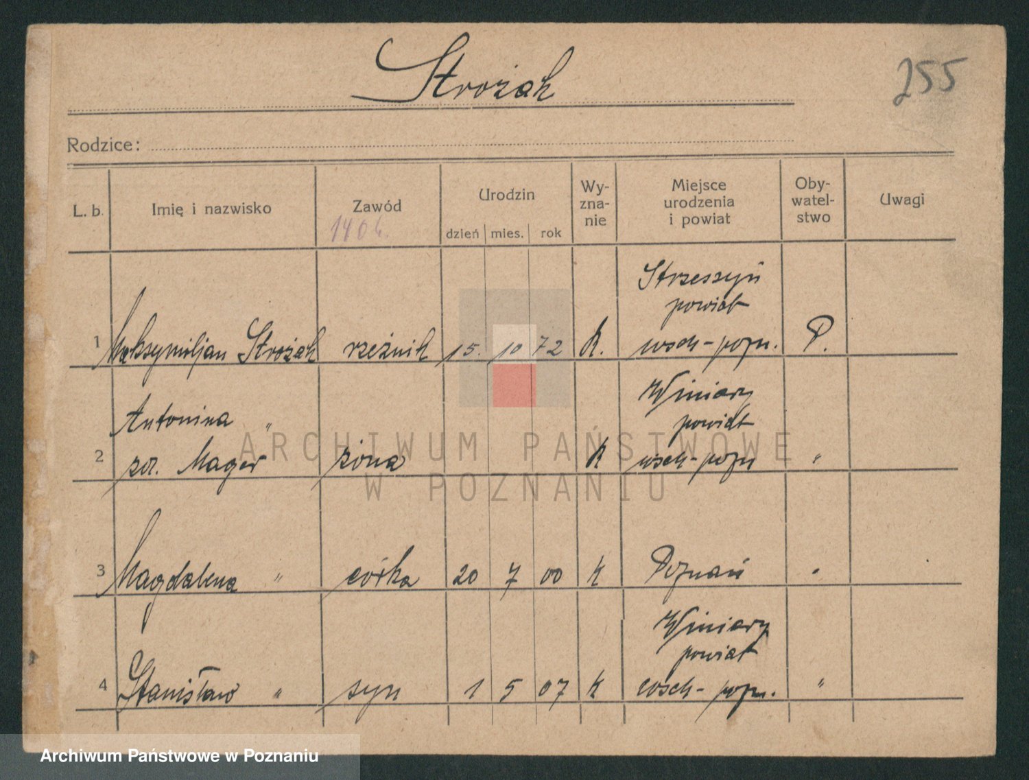 Podgląd karty osobowej dostępny jest po kliknięciu na nazwisko lub ikonkę karty. Można dokonywać powiększenia (ikony na górze) lub przechodzić między kolejnymi skanami (strzałki po bokach).