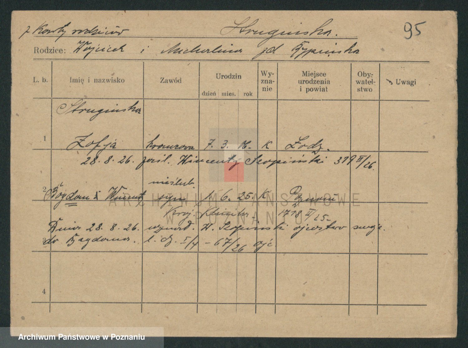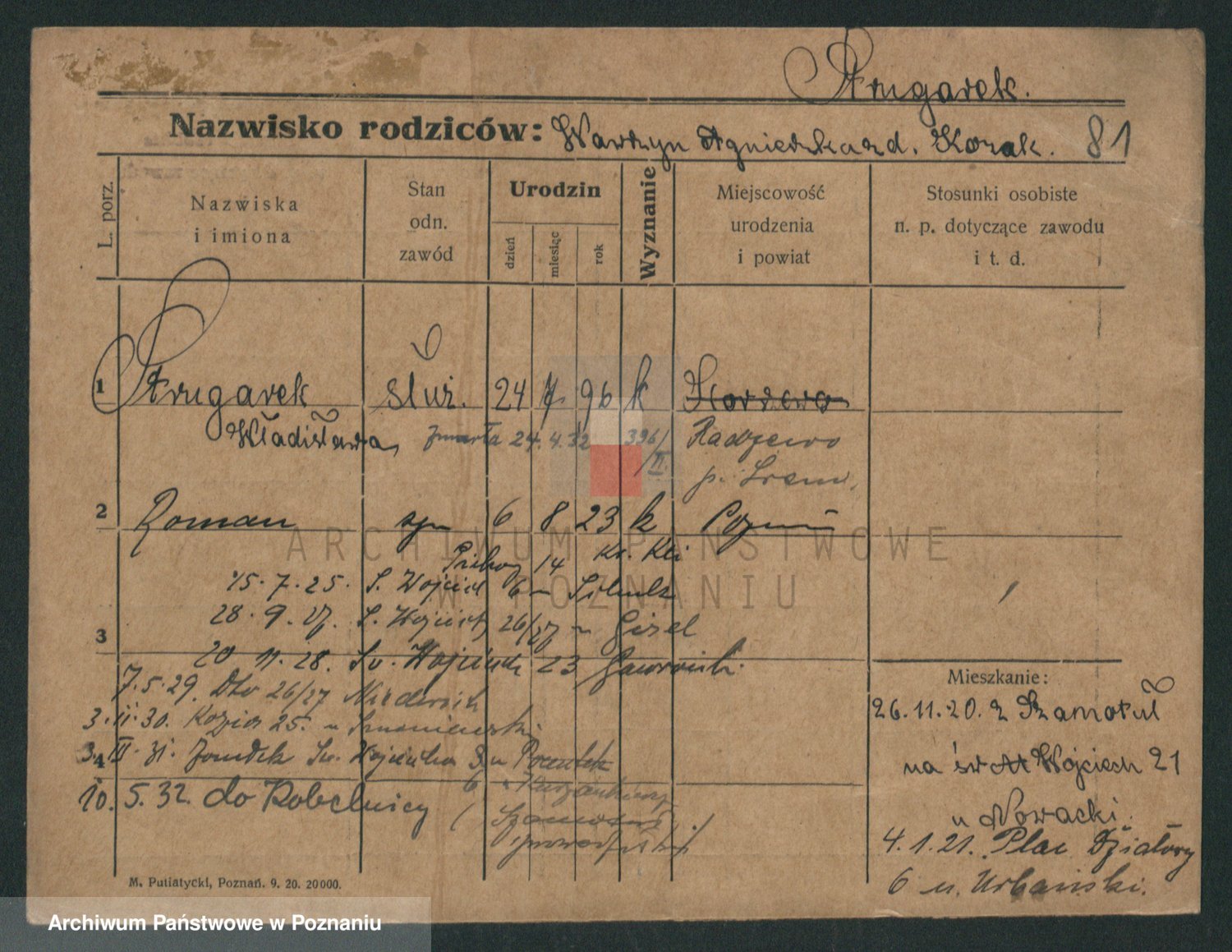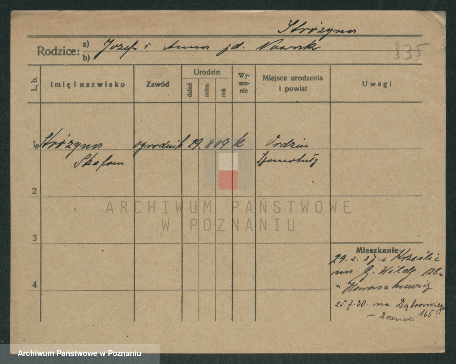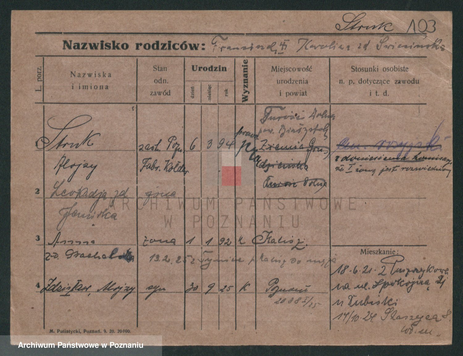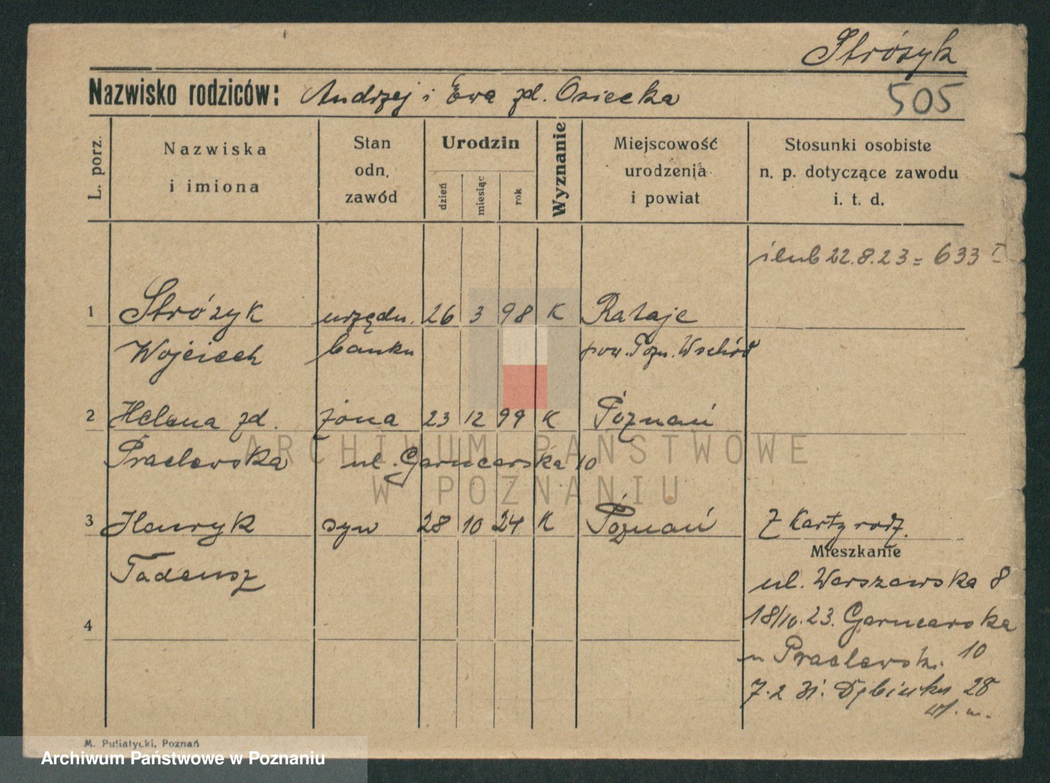 Podgląd karty osobowej dostępny jest po kliknięciu na nazwisko lub ikonkę karty. Można dokonywać powiększenia (ikony na górze) lub przechodzić między kolejnymi skanami (strzałki po bokach).