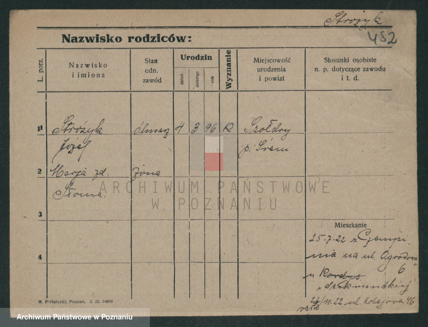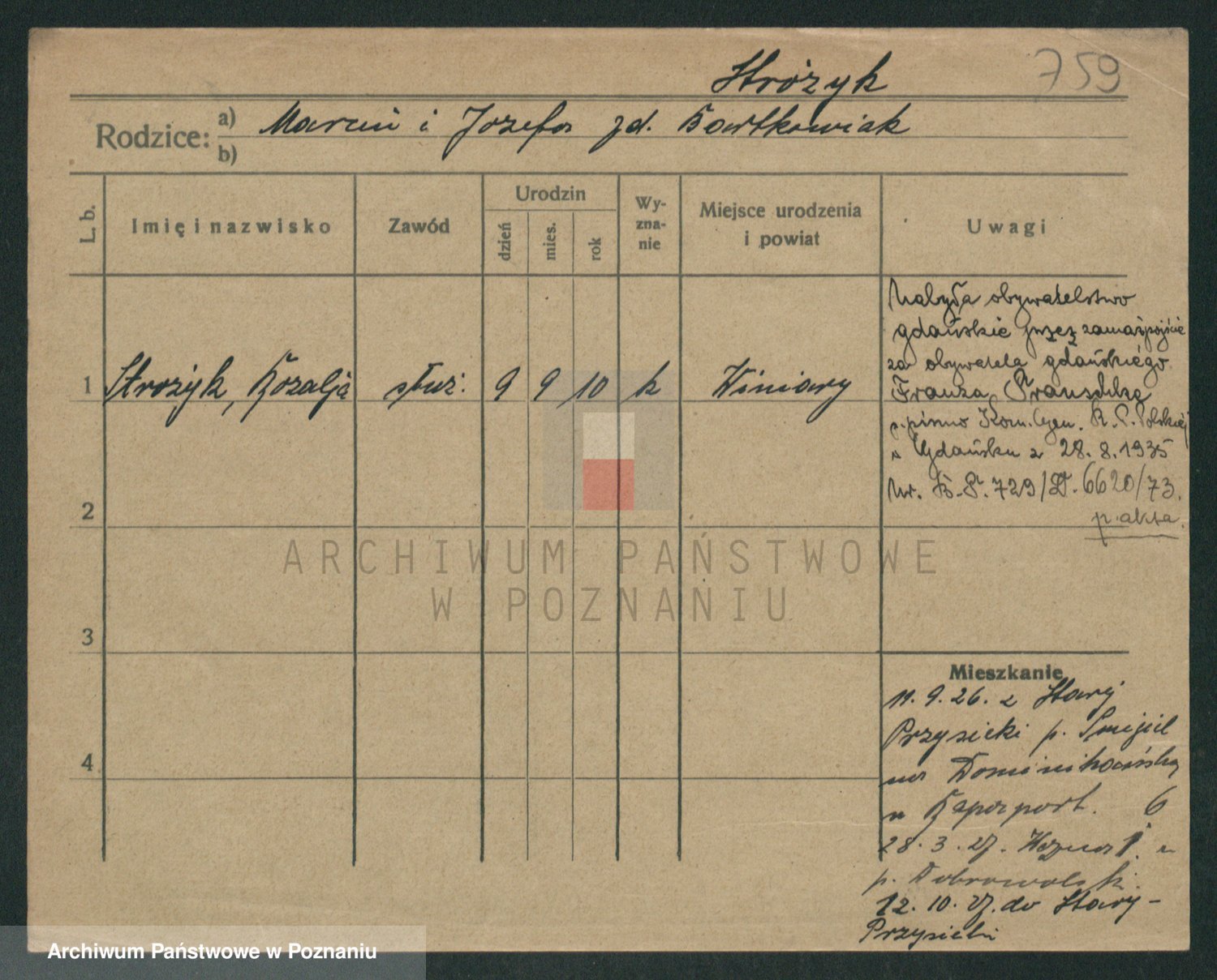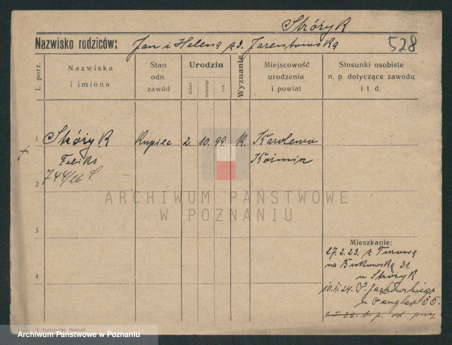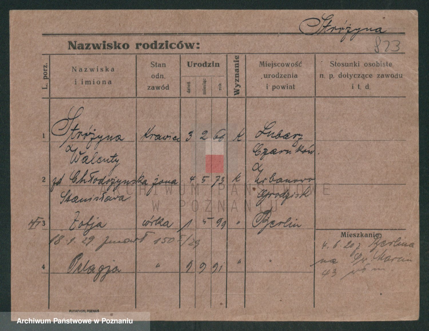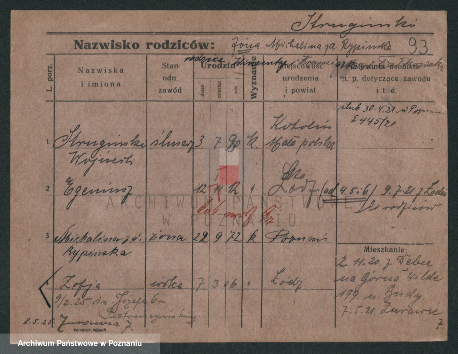 Podgląd karty osobowej dostępny jest po kliknięciu na nazwisko lub ikonkę karty. Można dokonywać powiększenia (ikony na górze) lub przechodzić między kolejnymi skanami (strzałki po bokach).