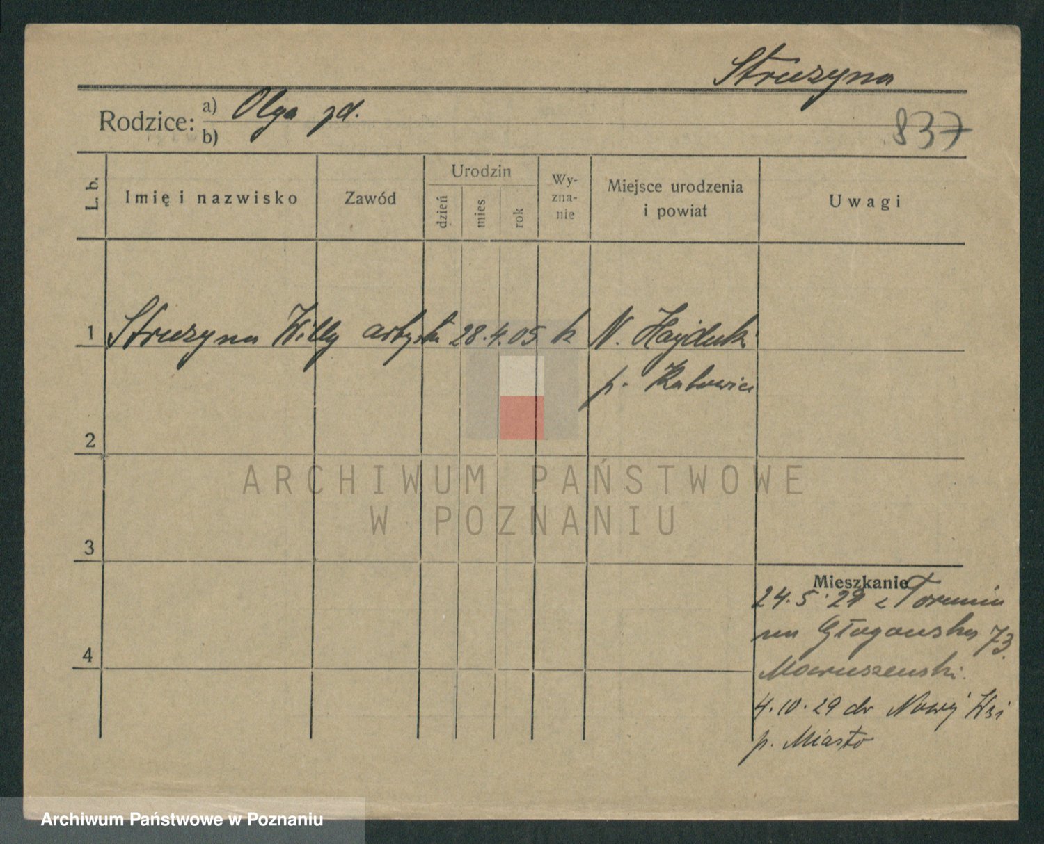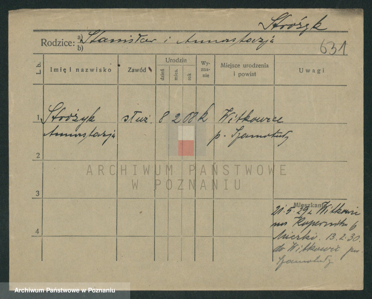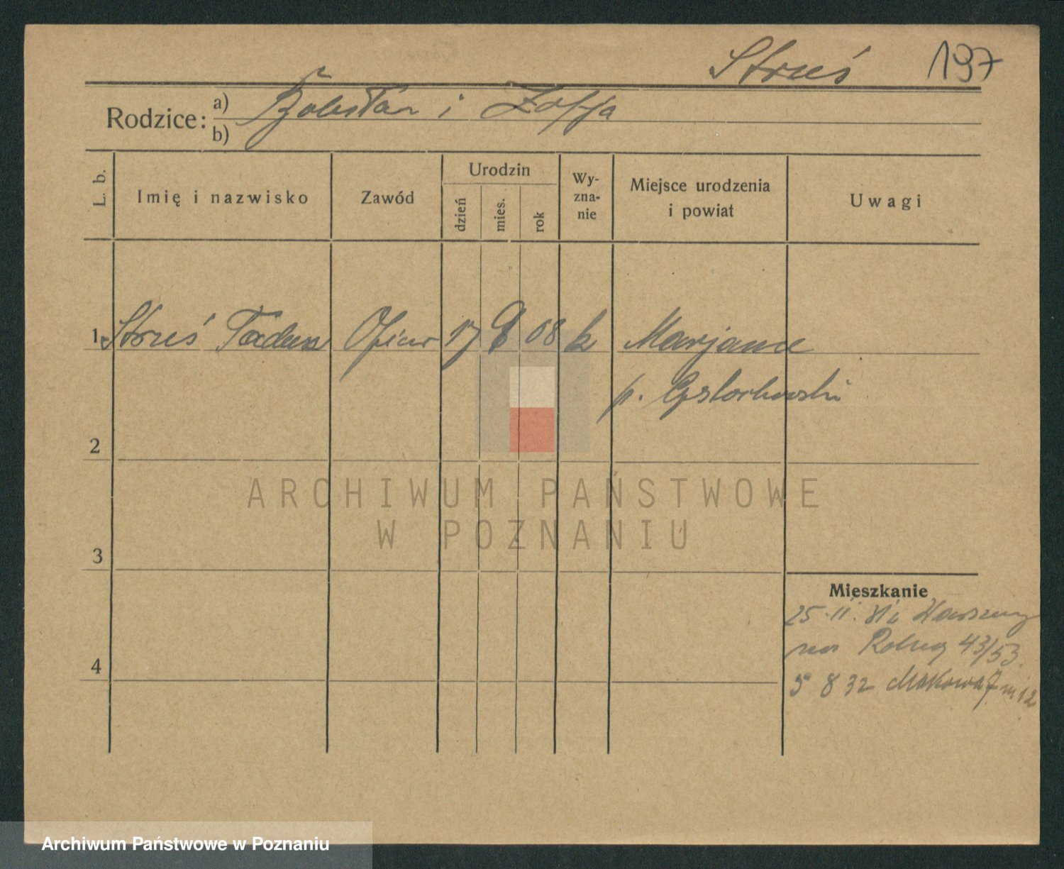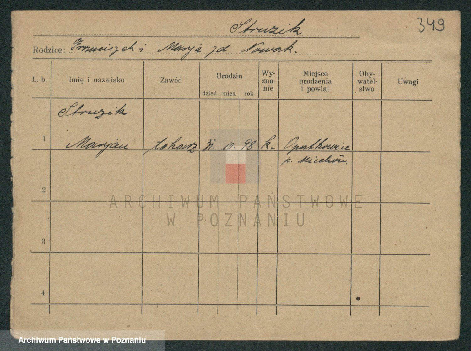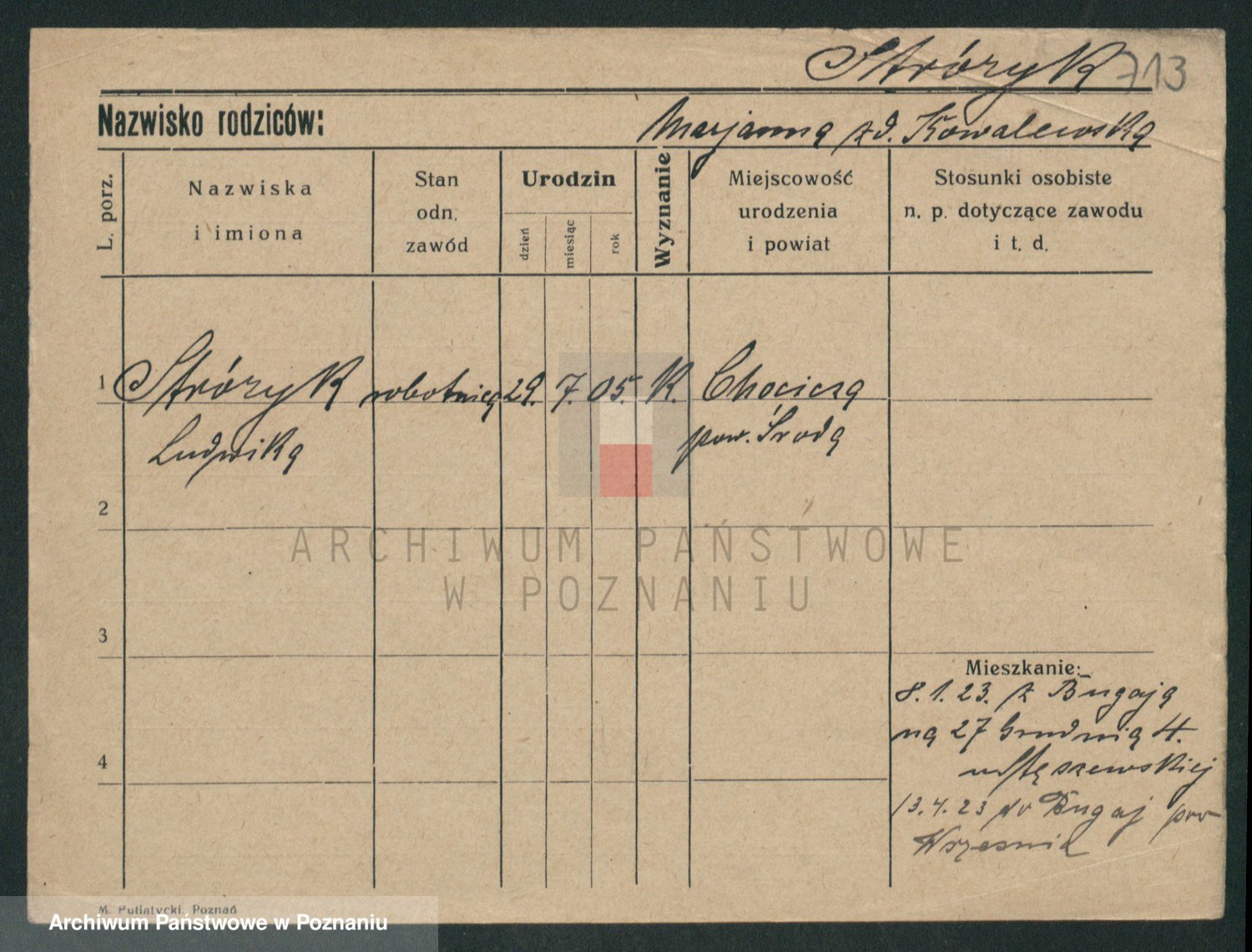 Podgląd karty osobowej dostępny jest po kliknięciu na nazwisko lub ikonkę karty. Można dokonywać powiększenia (ikony na górze) lub przechodzić między kolejnymi skanami (strzałki po bokach).