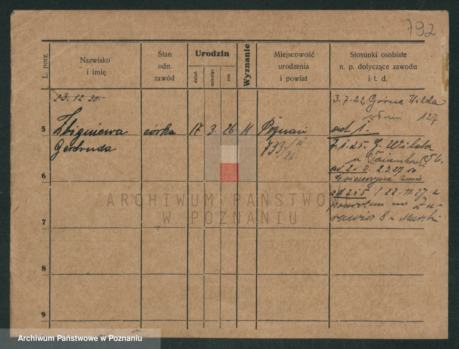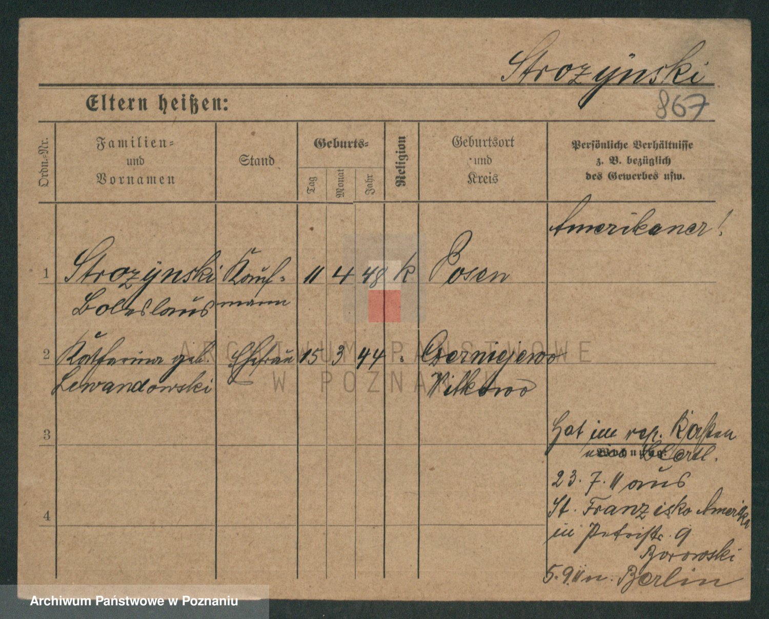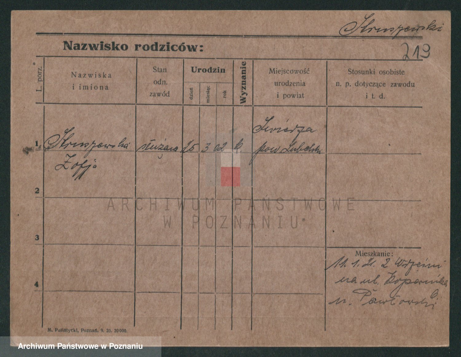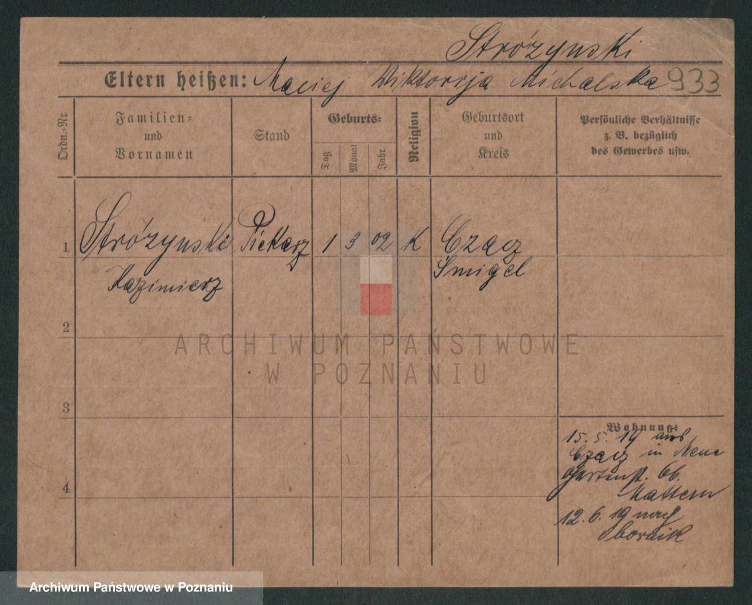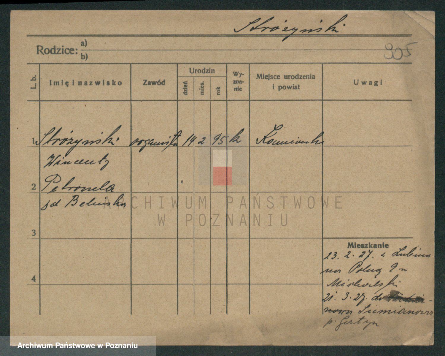 Podgląd karty osobowej dostępny jest po kliknięciu na nazwisko lub ikonkę karty. Można dokonywać powiększenia (ikony na górze) lub przechodzić między kolejnymi skanami (strzałki po bokach).