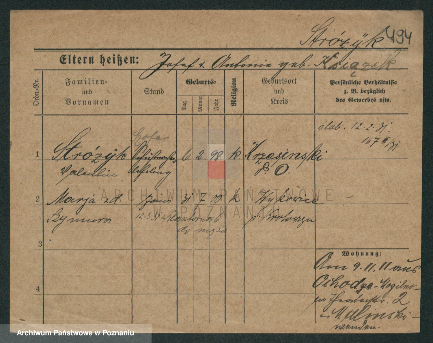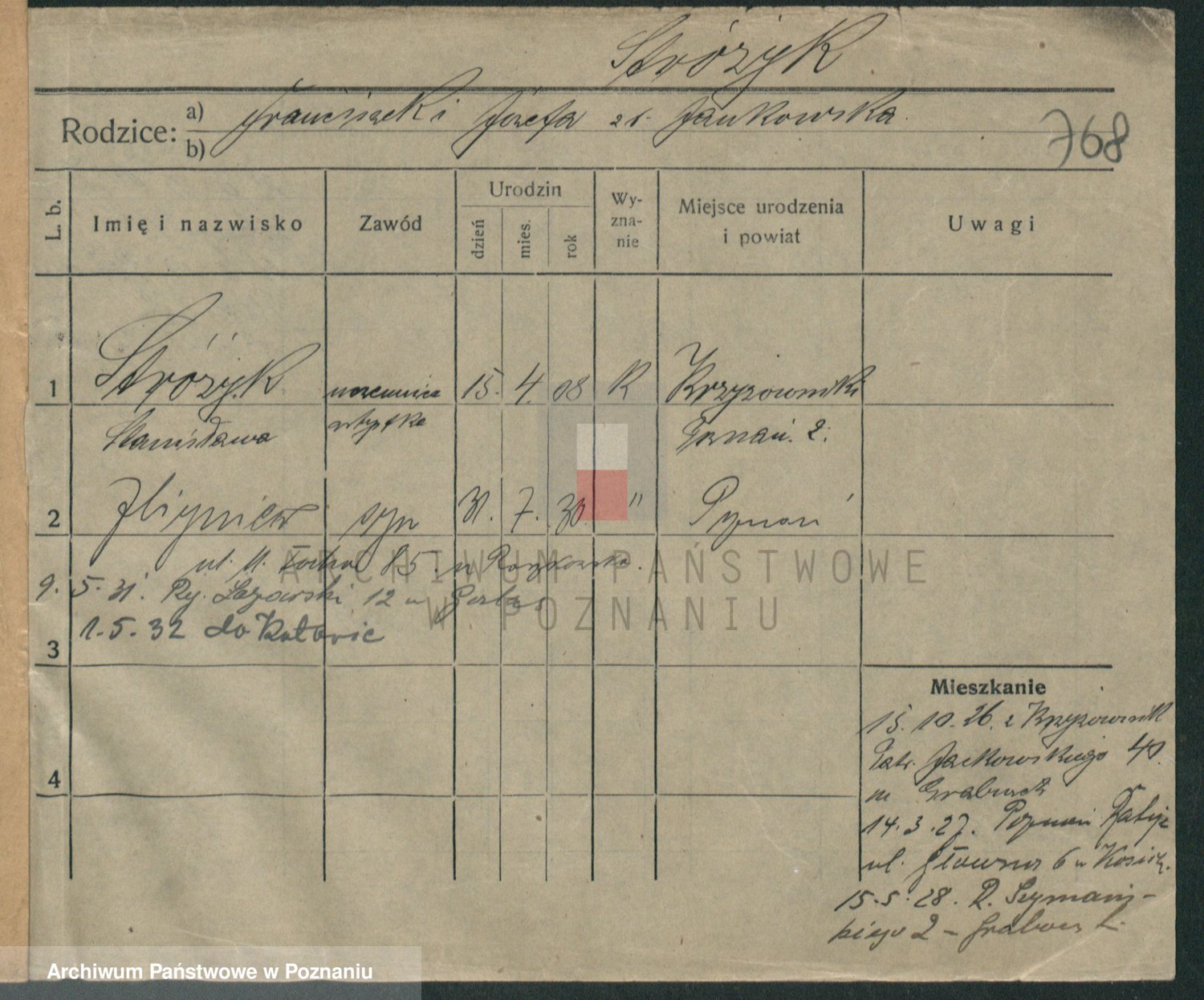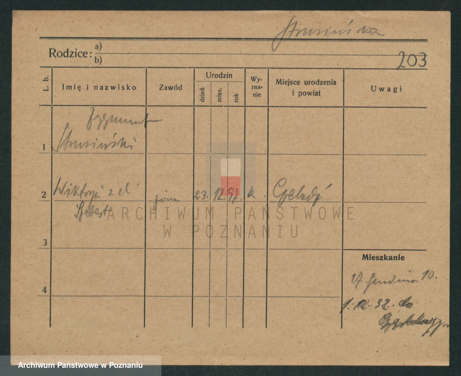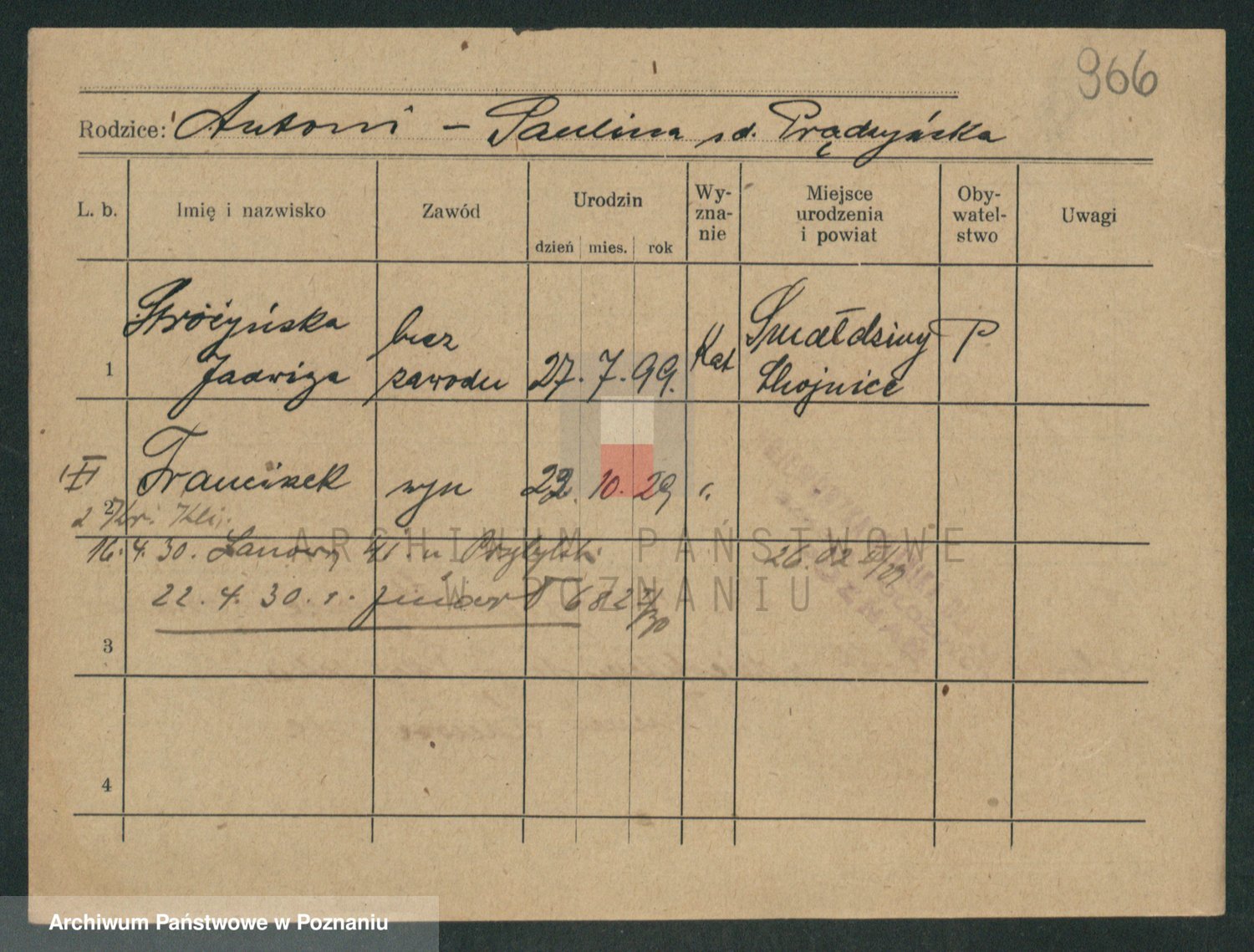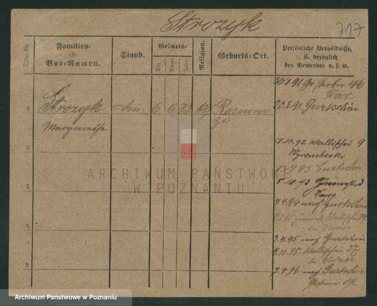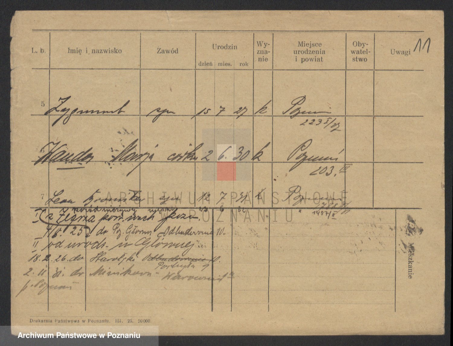 Podgląd karty osobowej dostępny jest po kliknięciu na nazwisko lub ikonkę karty. Można dokonywać powiększenia (ikony na górze) lub przechodzić między kolejnymi skanami (strzałki po bokach).