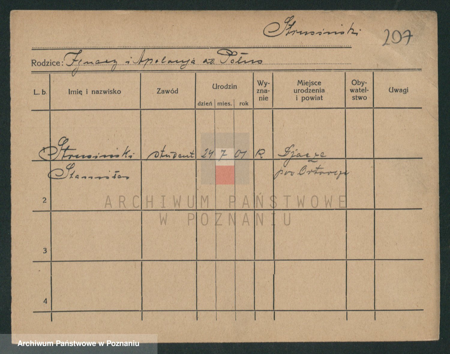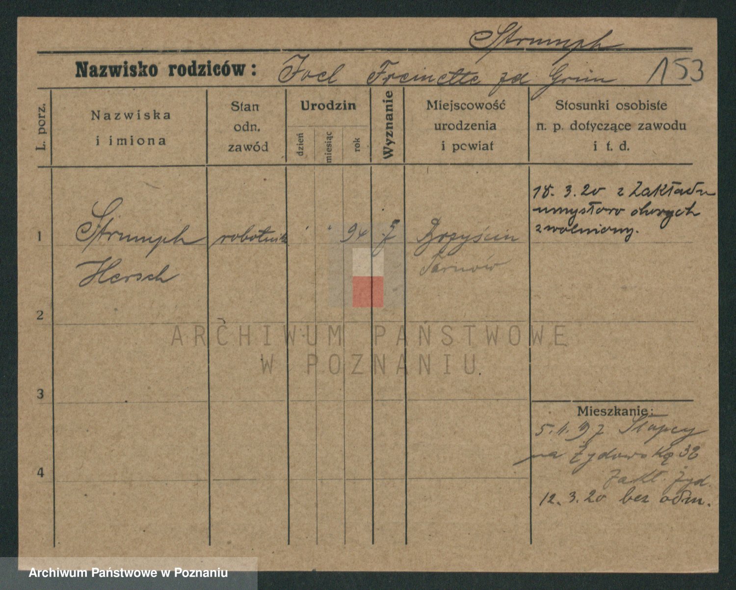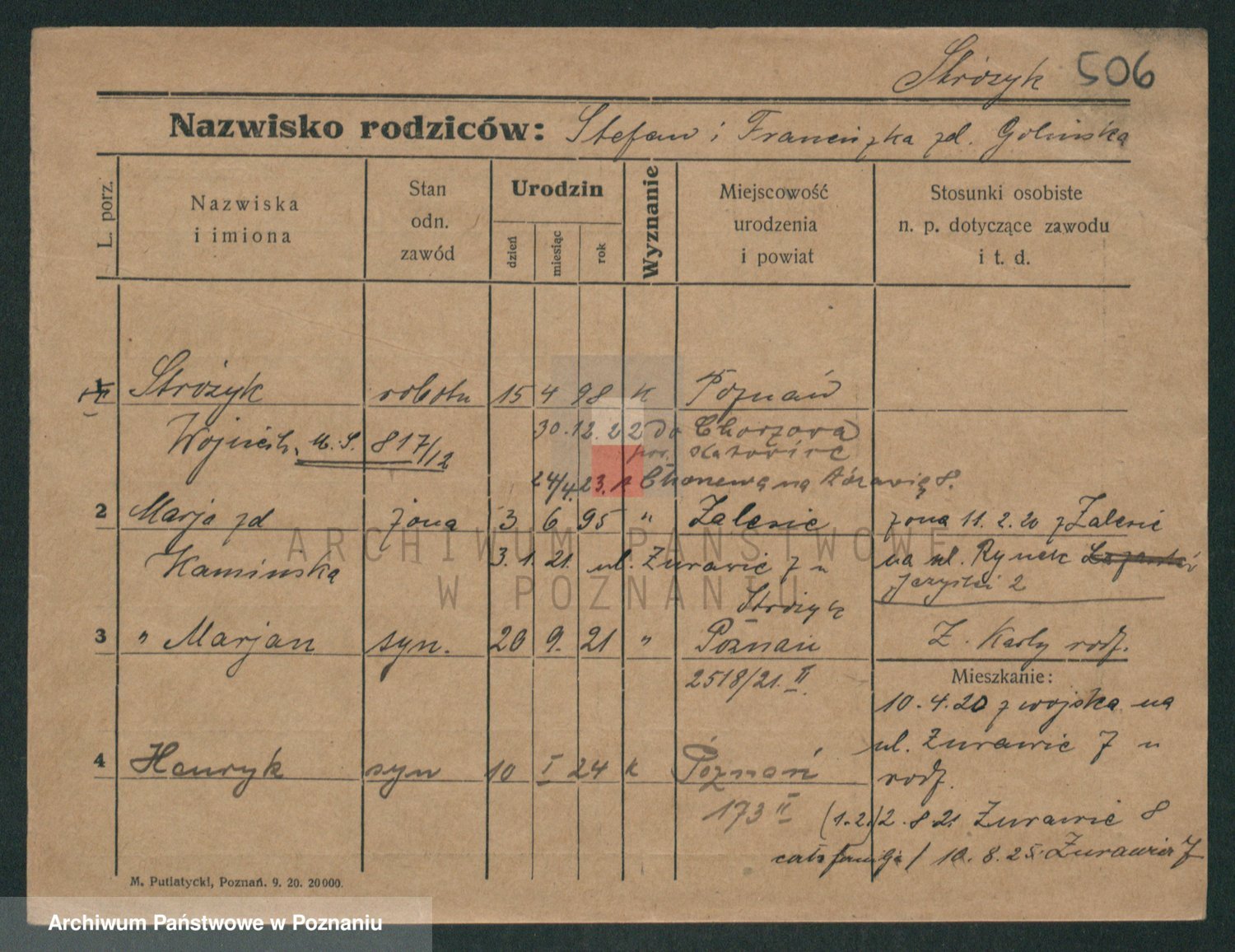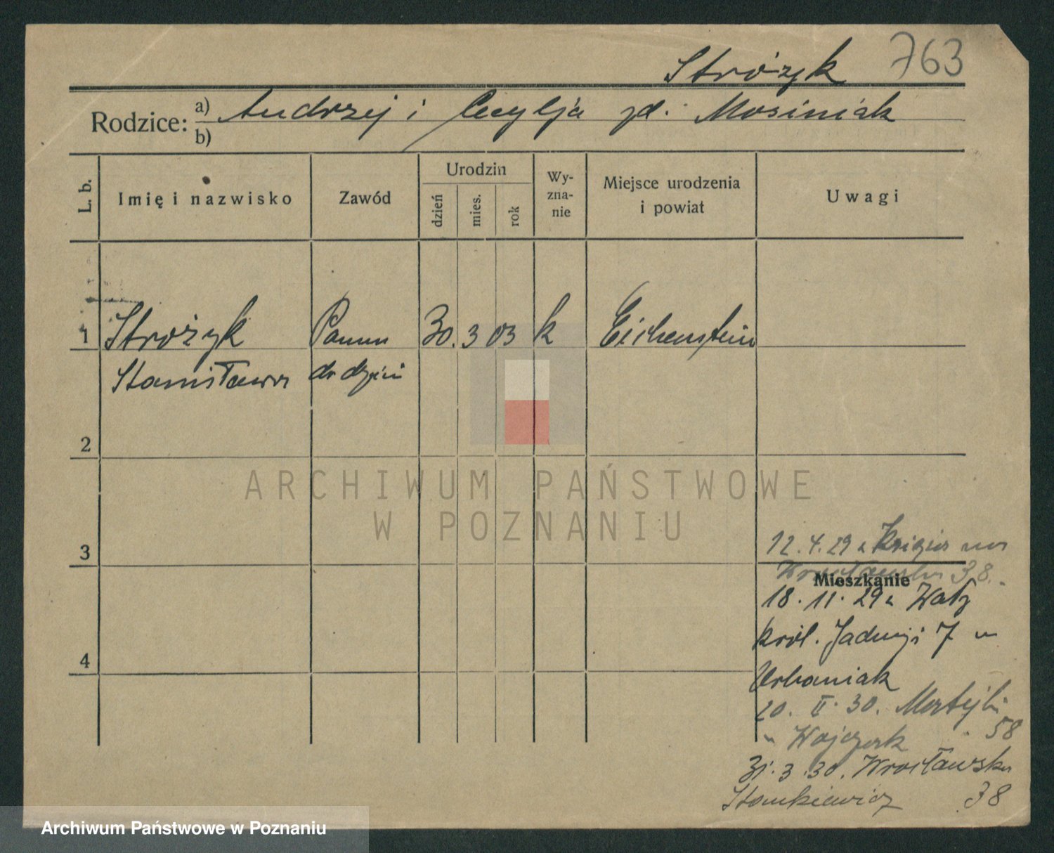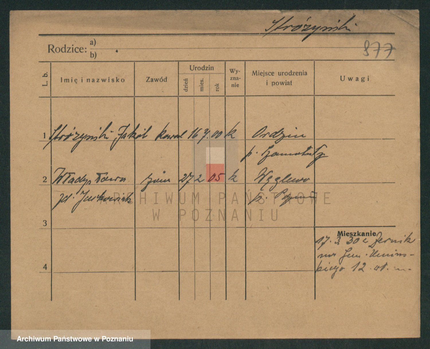 Podgląd karty osobowej dostępny jest po kliknięciu na nazwisko lub ikonkę karty. Można dokonywać powiększenia (ikony na górze) lub przechodzić między kolejnymi skanami (strzałki po bokach).