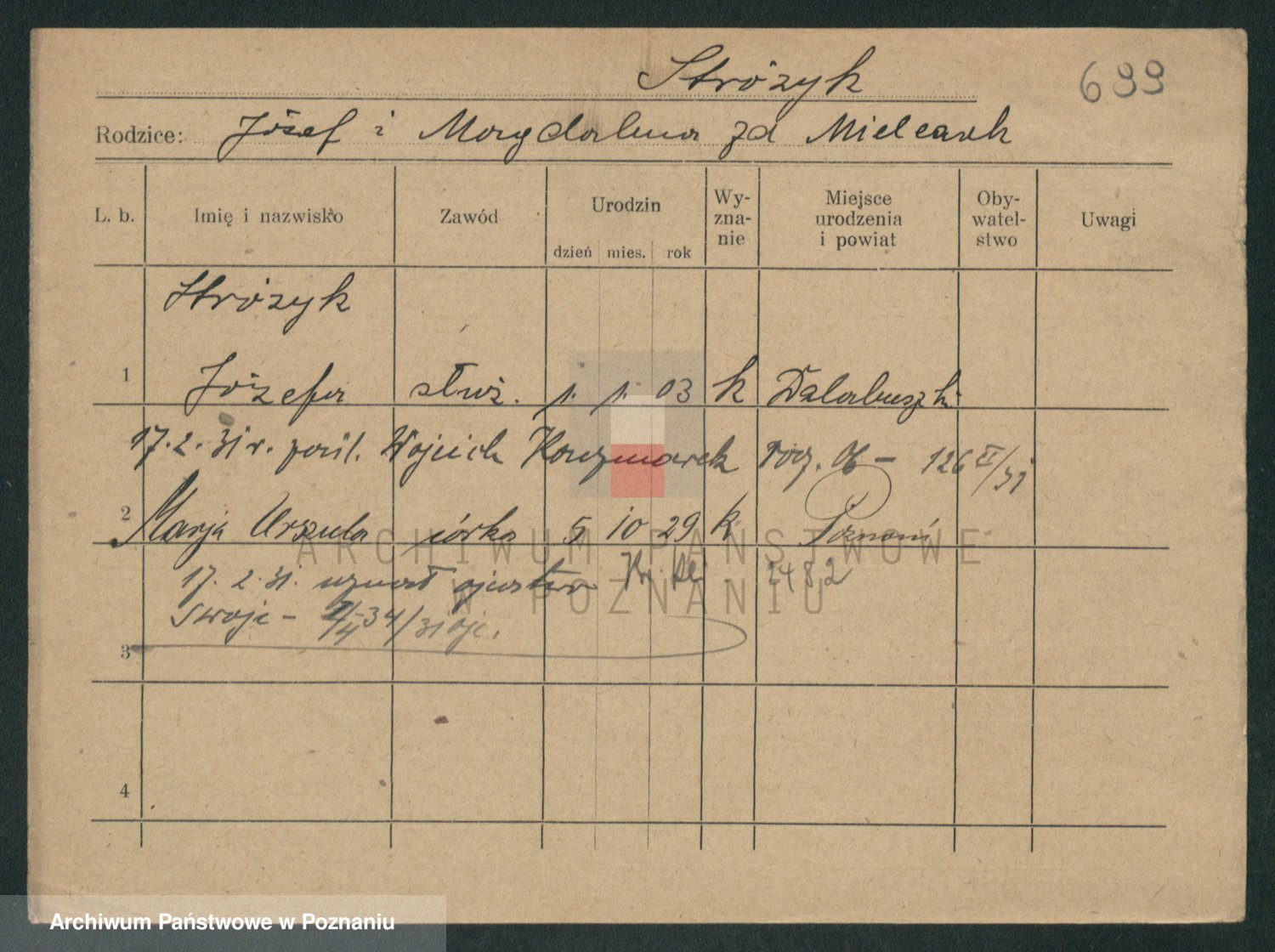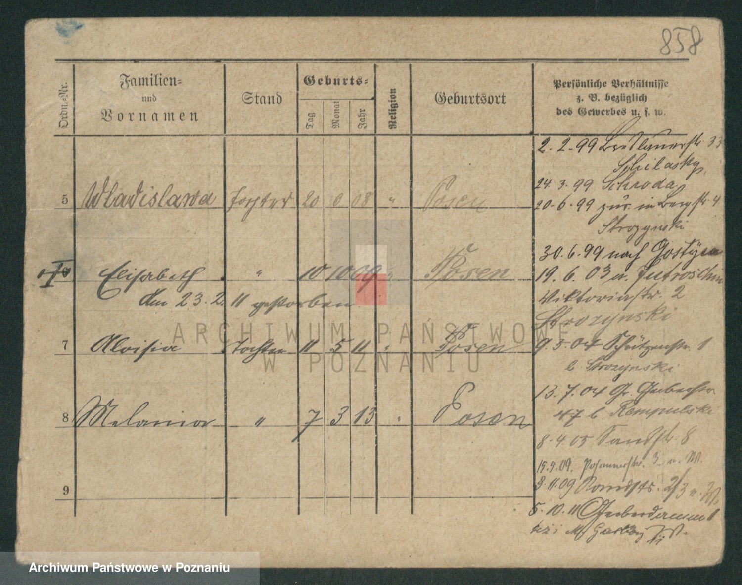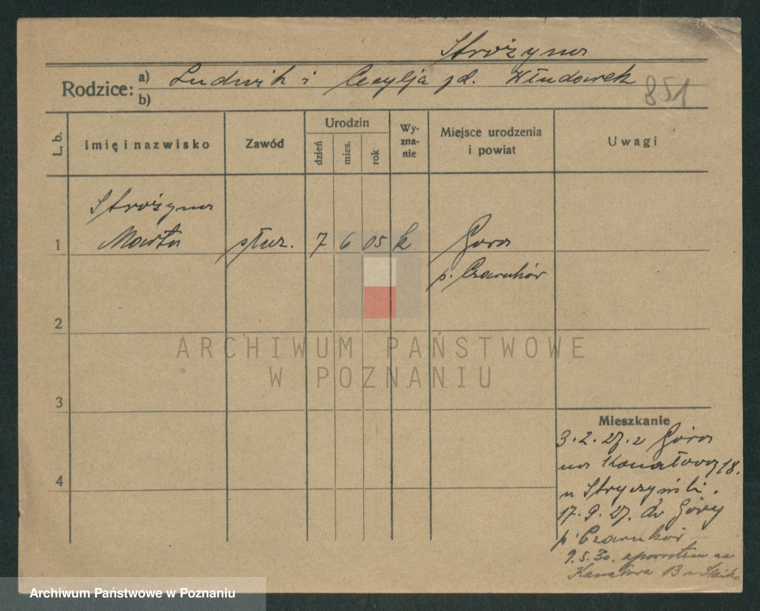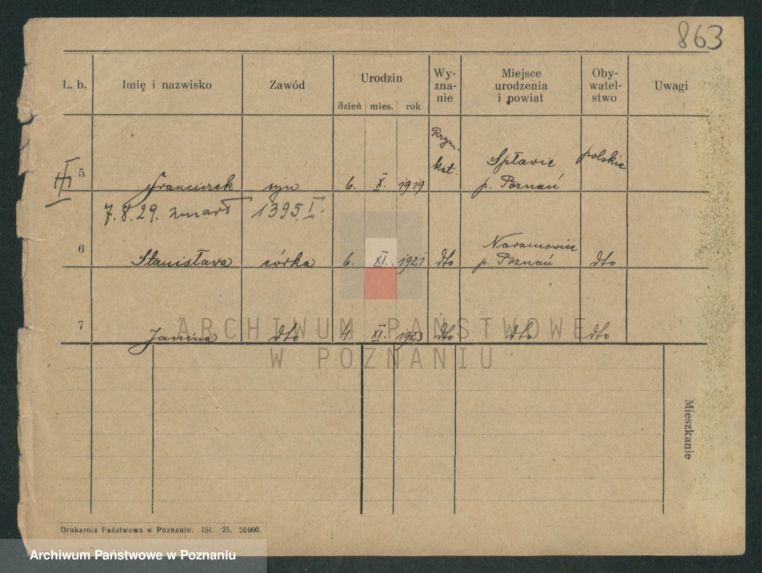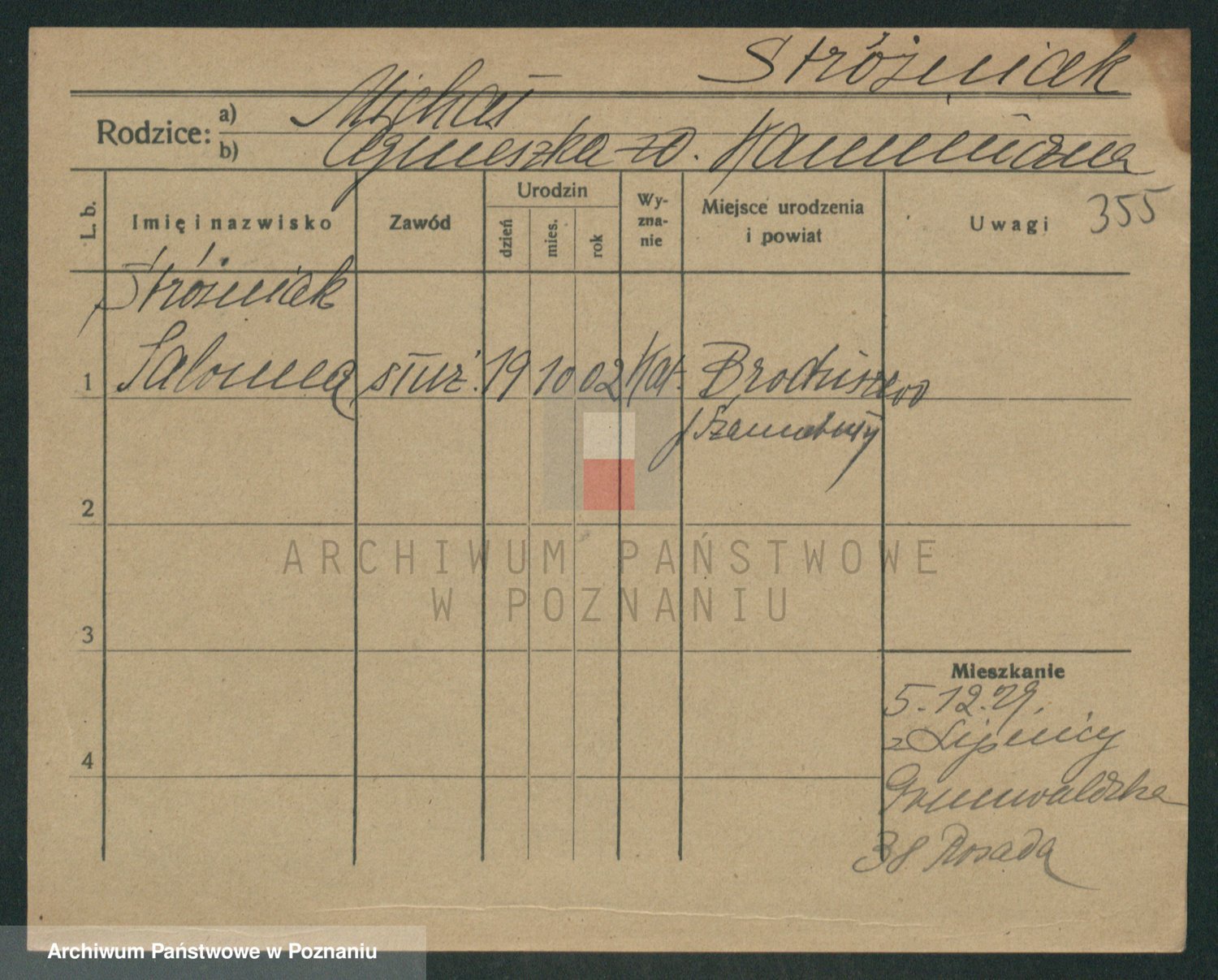 Podgląd karty osobowej dostępny jest po kliknięciu na nazwisko lub ikonkę karty. Można dokonywać powiększenia (ikony na górze) lub przechodzić między kolejnymi skanami (strzałki po bokach).