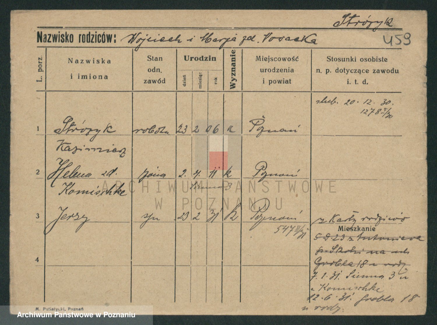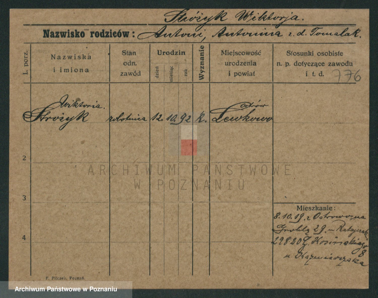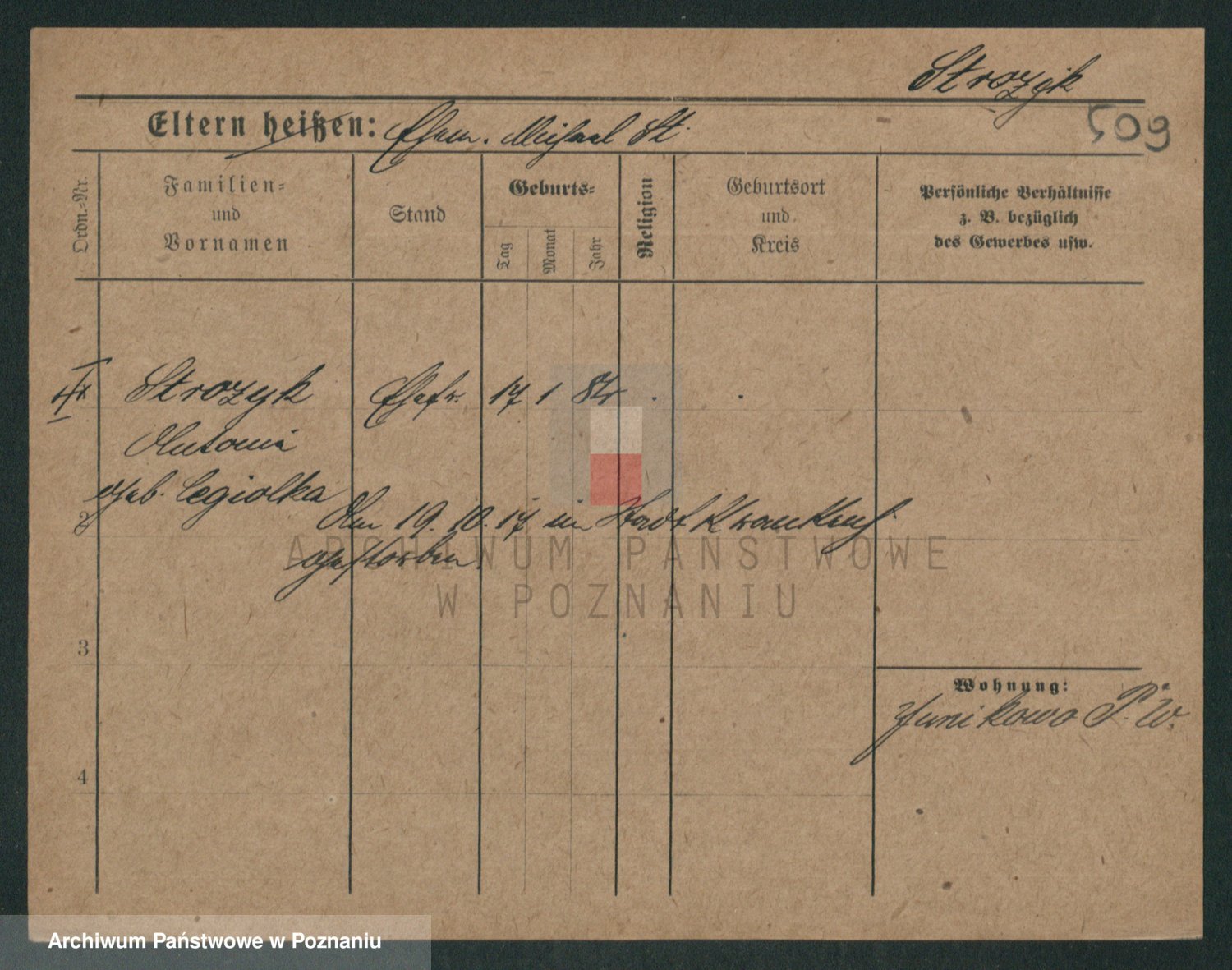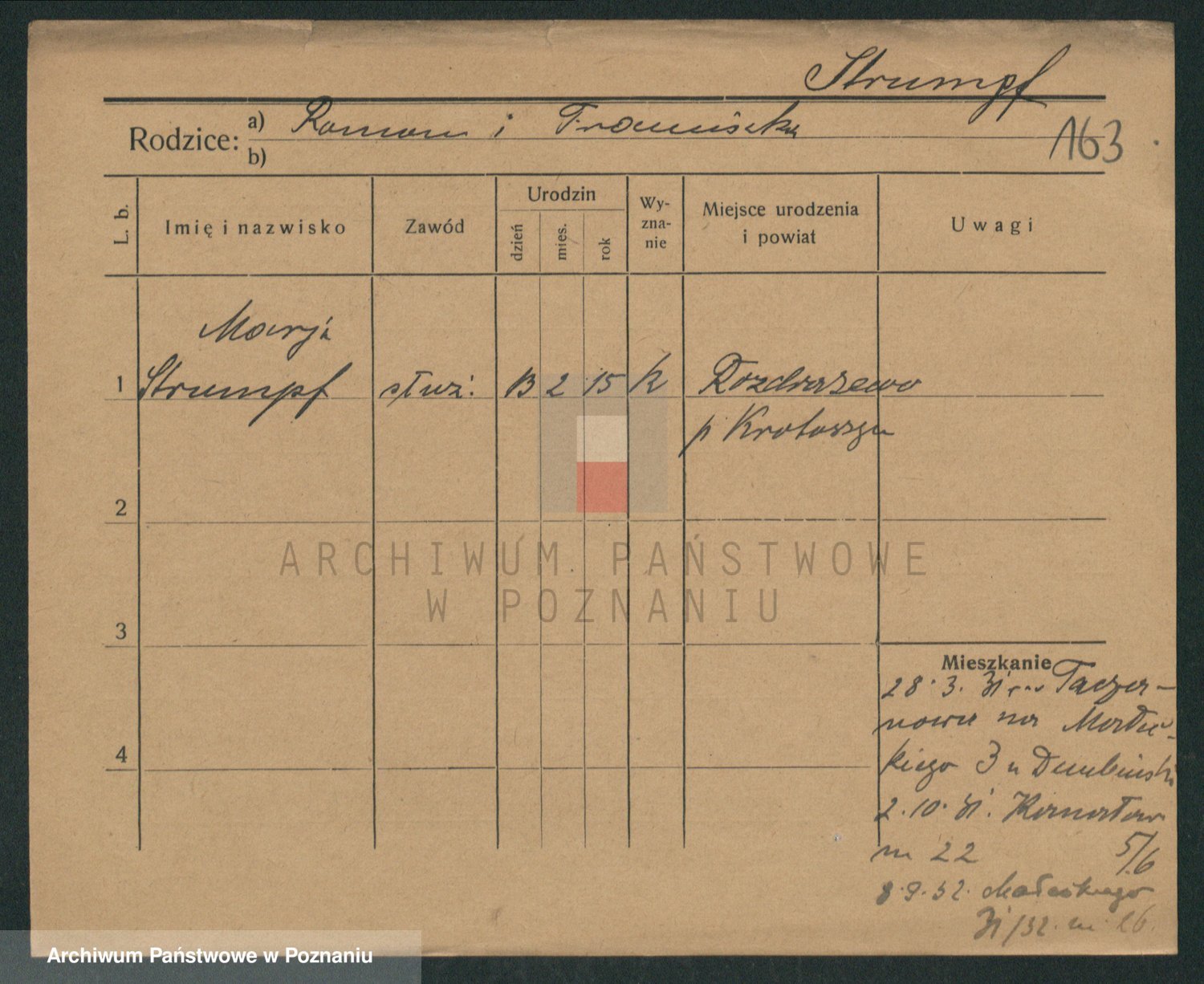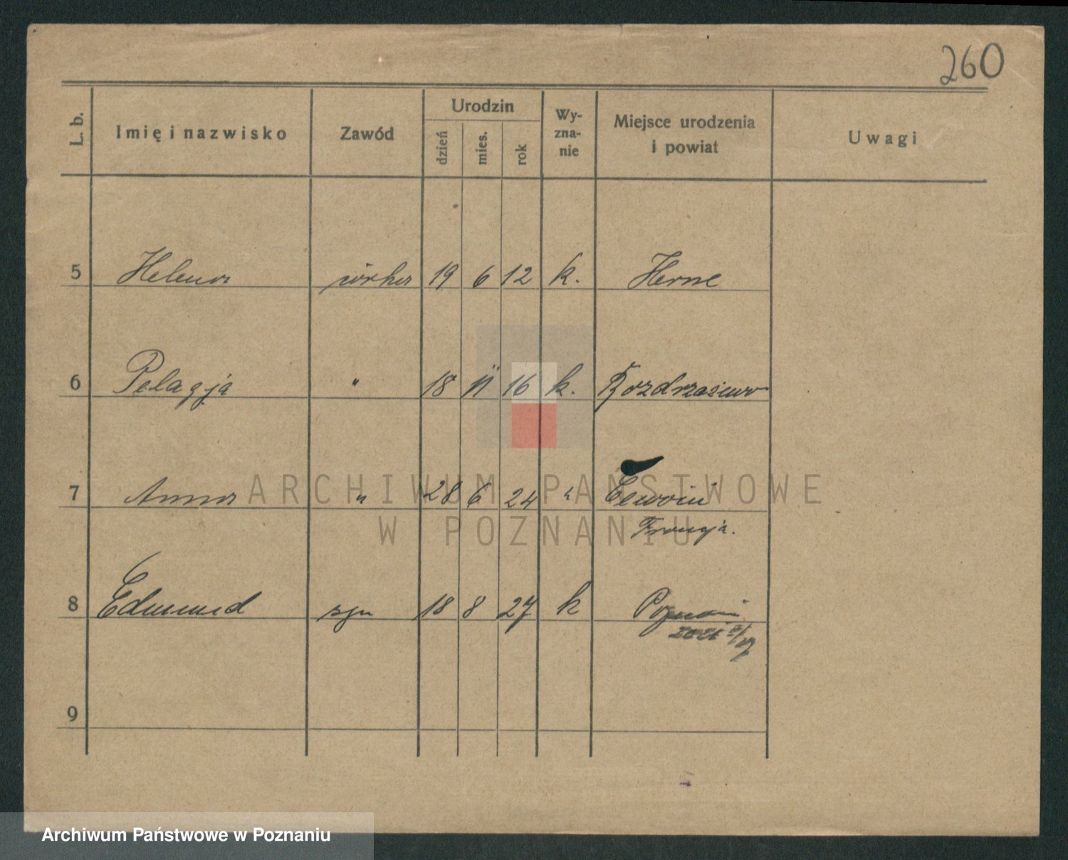 Podgląd karty osobowej dostępny jest po kliknięciu na nazwisko lub ikonkę karty. Można dokonywać powiększenia (ikony na górze) lub przechodzić między kolejnymi skanami (strzałki po bokach).