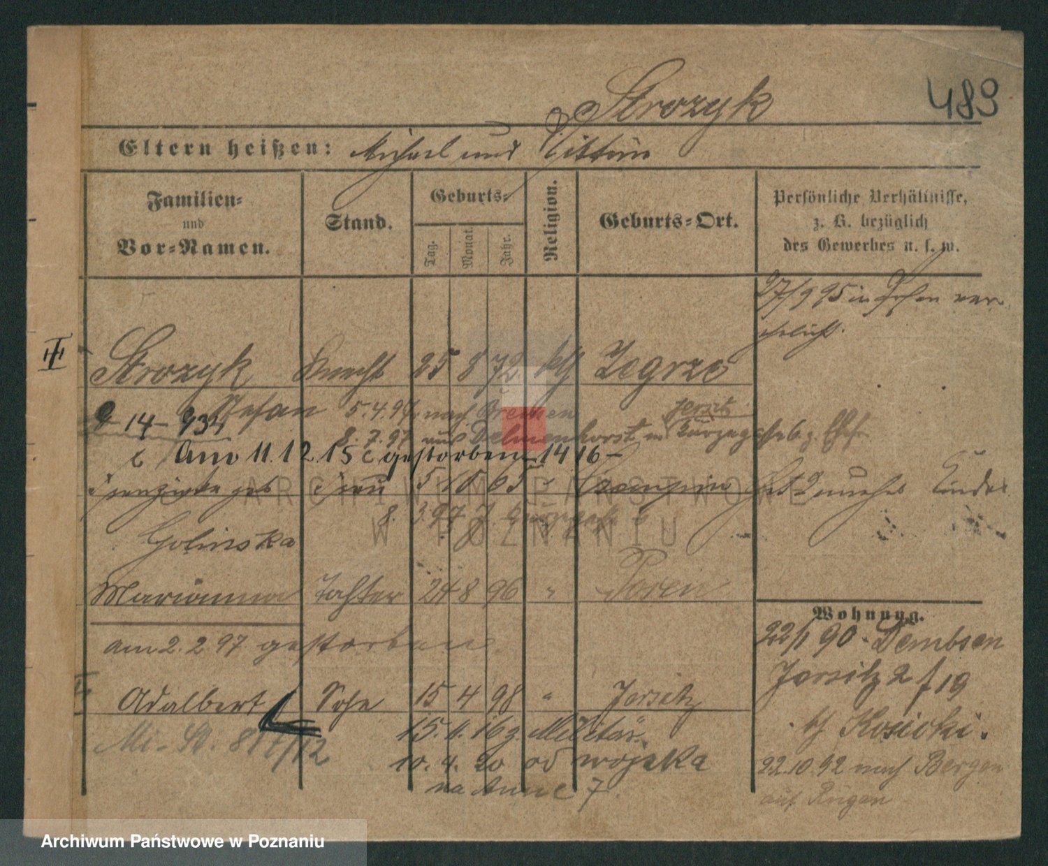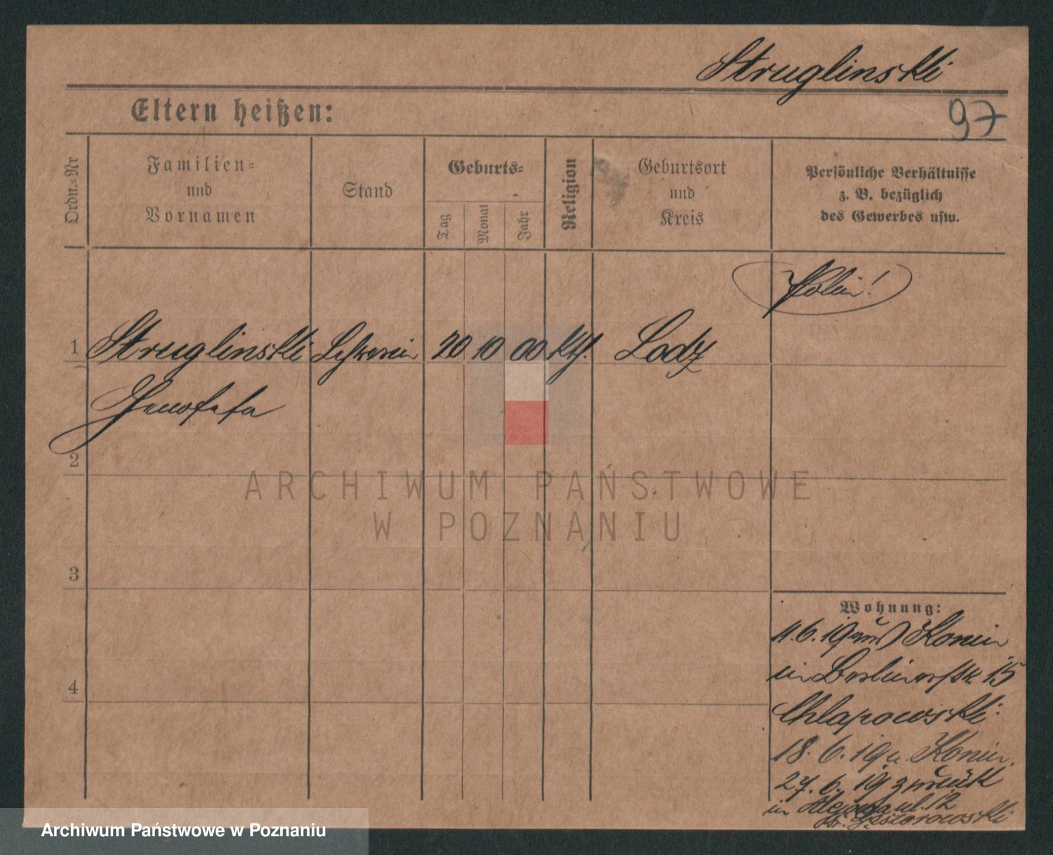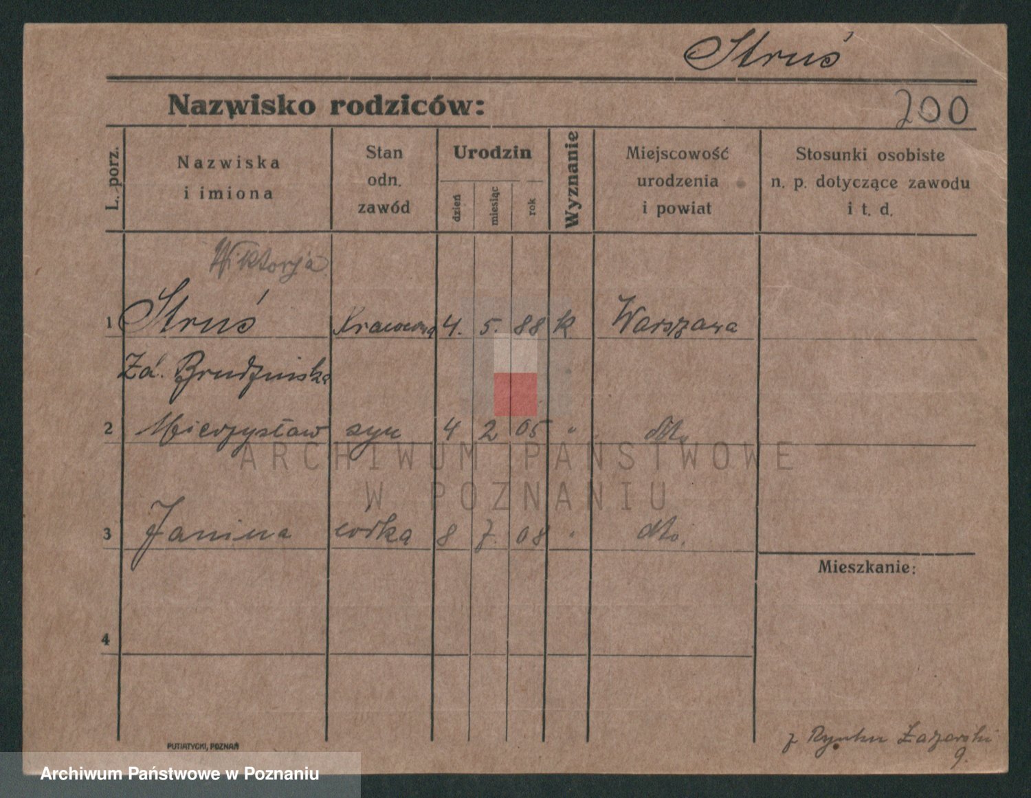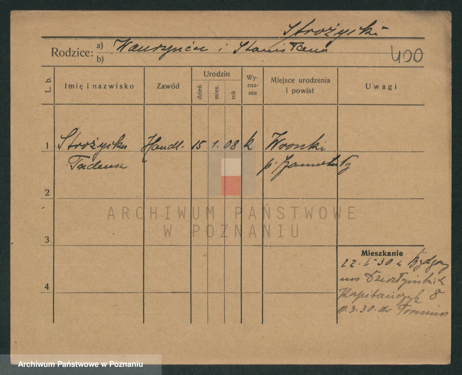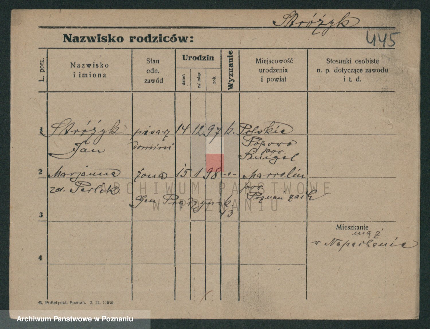 Podgląd karty osobowej dostępny jest po kliknięciu na nazwisko lub ikonkę karty. Można dokonywać powiększenia (ikony na górze) lub przechodzić między kolejnymi skanami (strzałki po bokach).