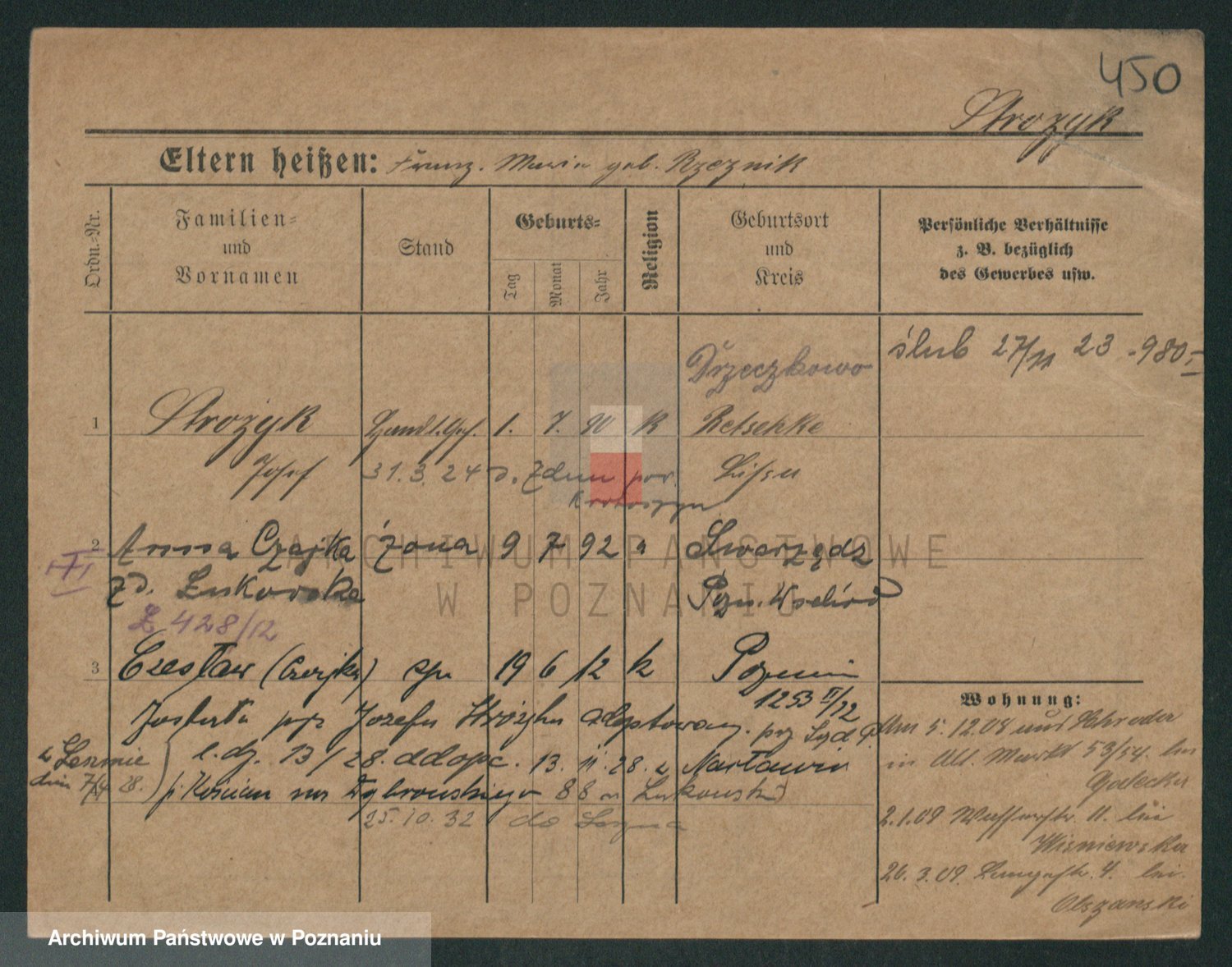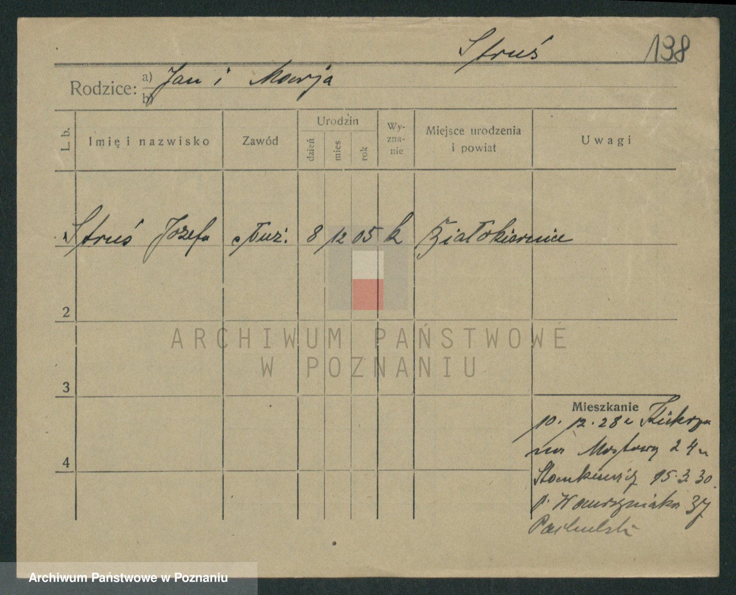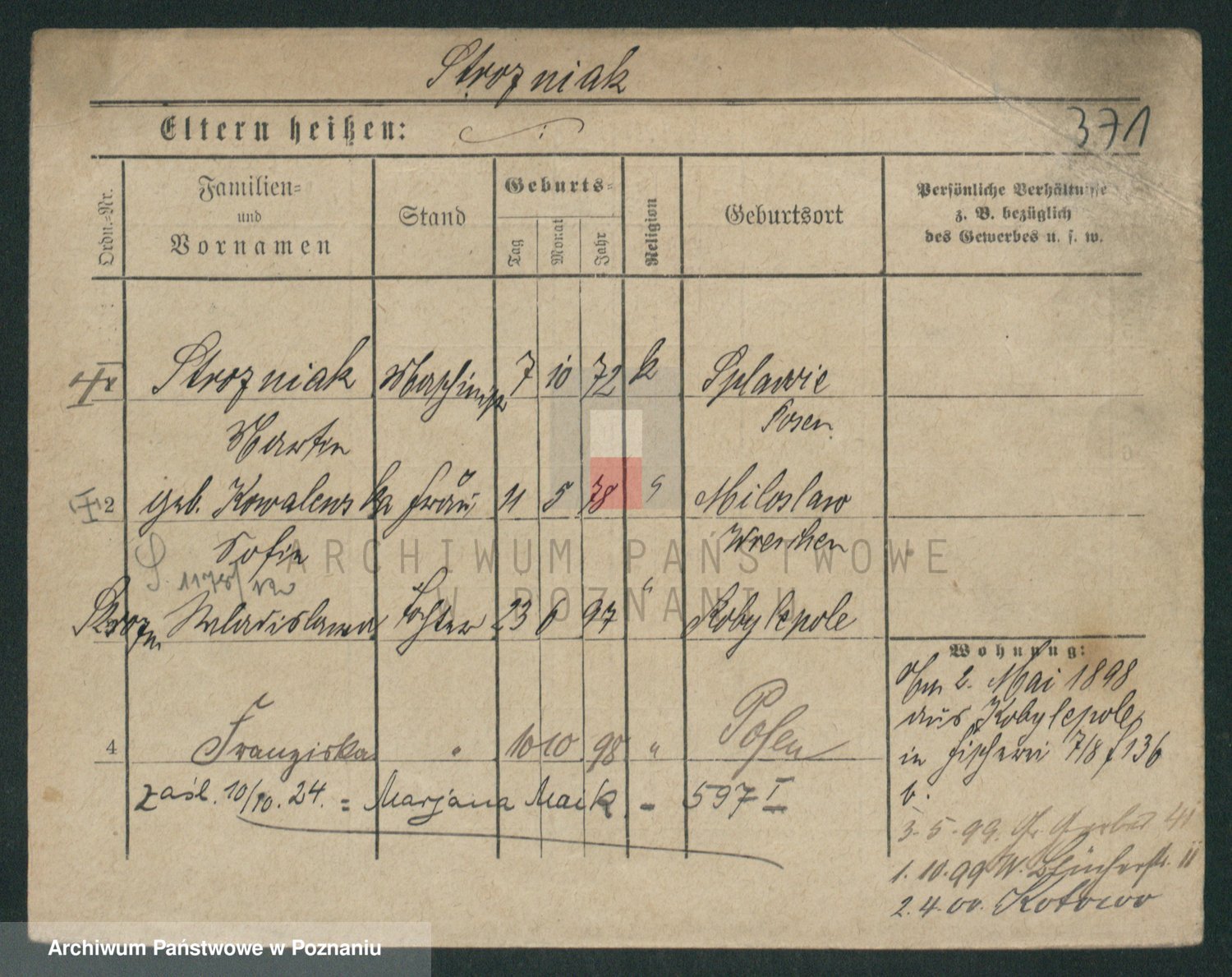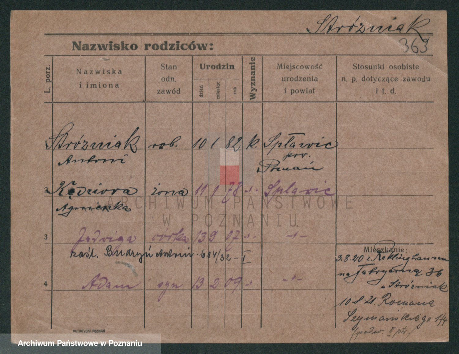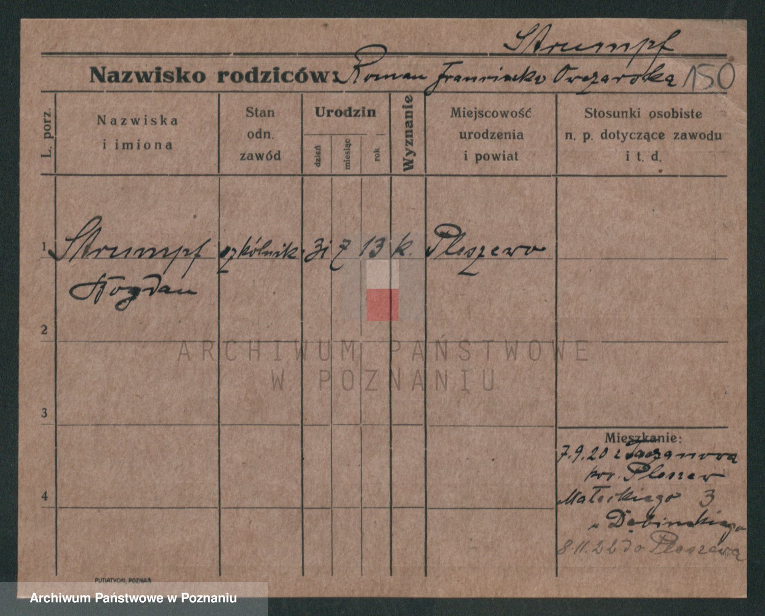 Podgląd karty osobowej dostępny jest po kliknięciu na nazwisko lub ikonkę karty. Można dokonywać powiększenia (ikony na górze) lub przechodzić między kolejnymi skanami (strzałki po bokach).
