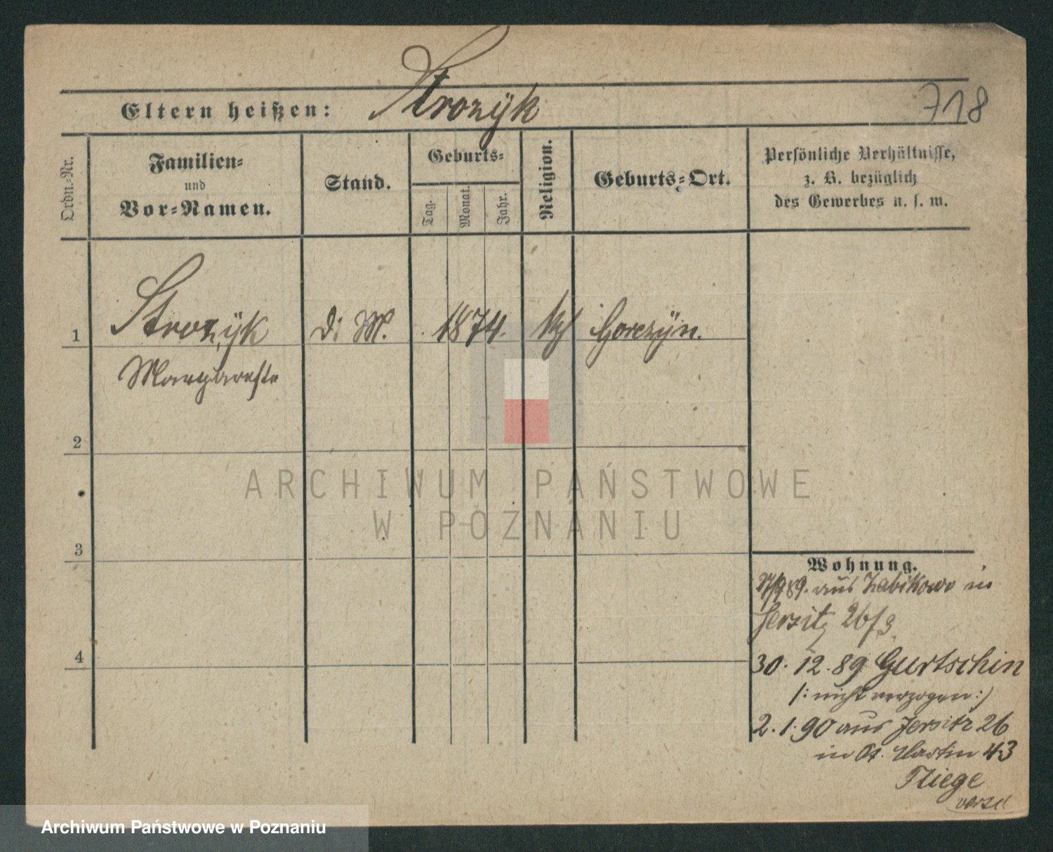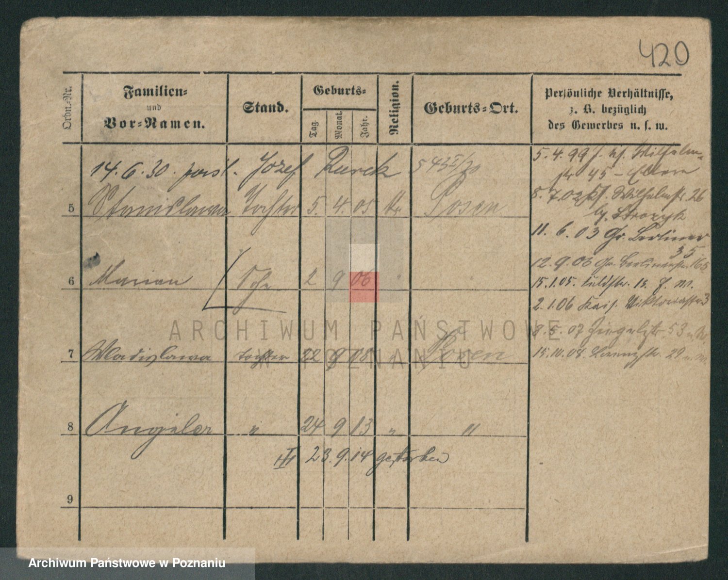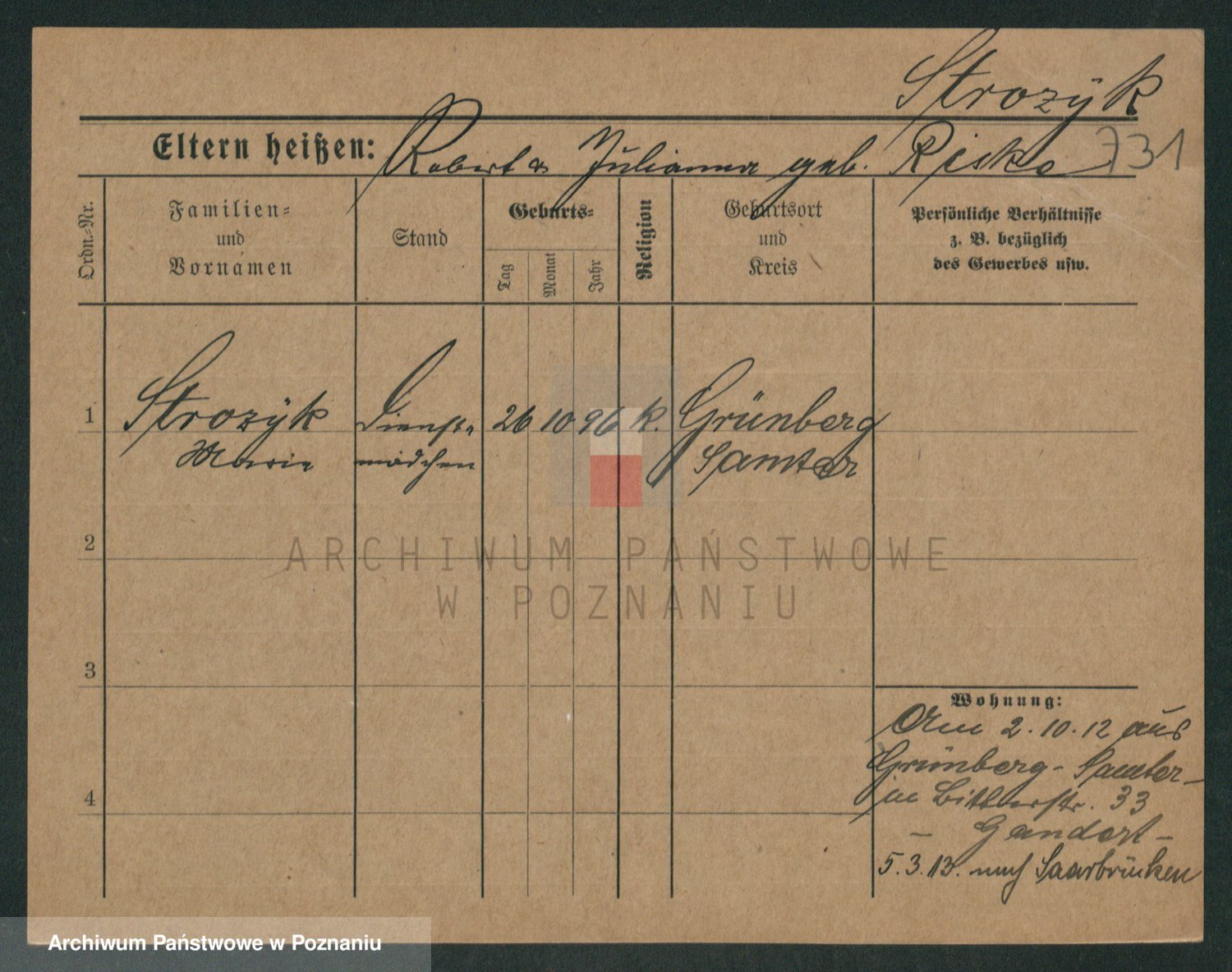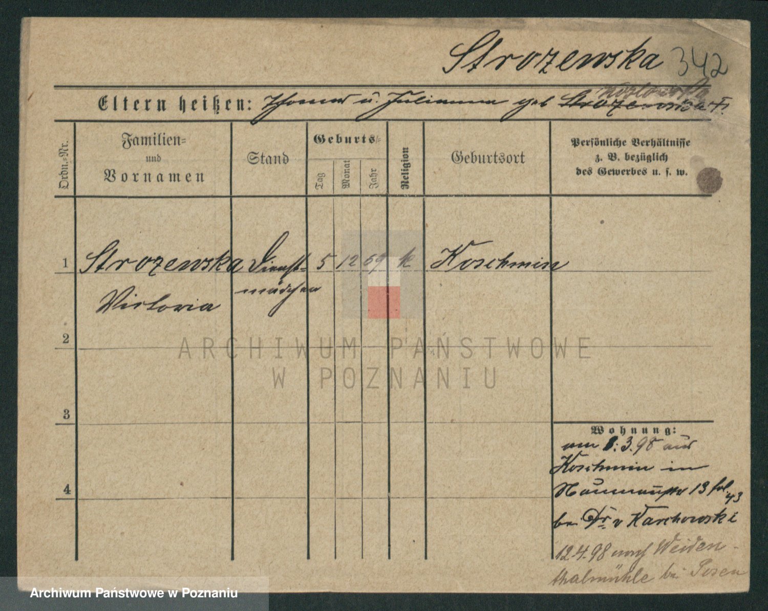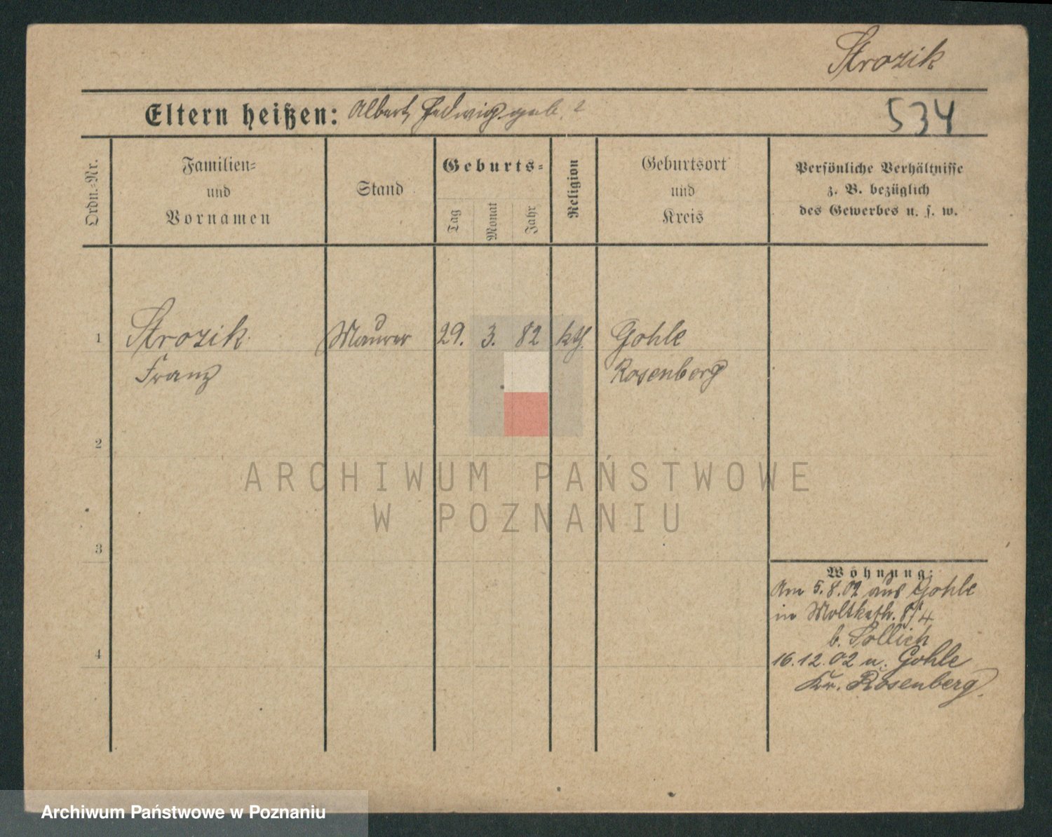 Podgląd karty osobowej dostępny jest po kliknięciu na nazwisko lub ikonkę karty. Można dokonywać powiększenia (ikony na górze) lub przechodzić między kolejnymi skanami (strzałki po bokach).
