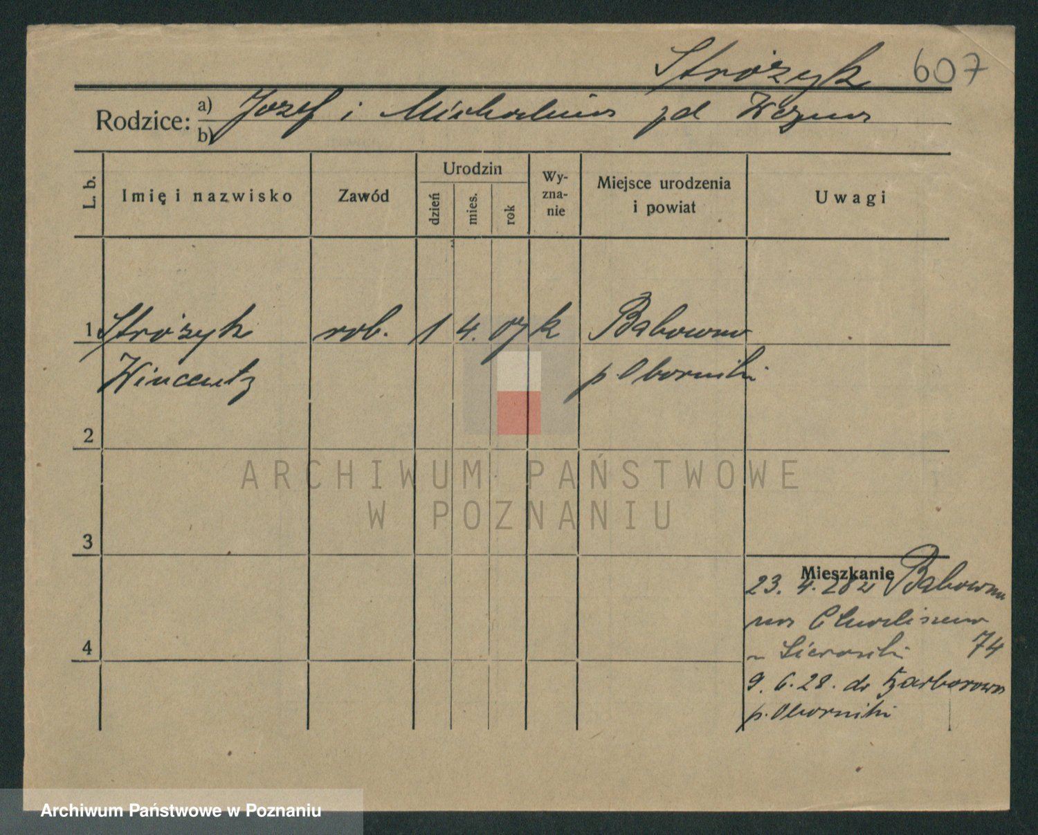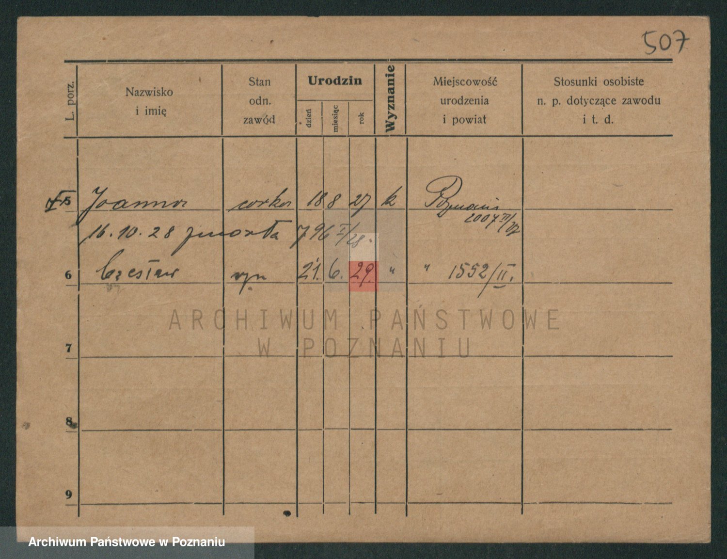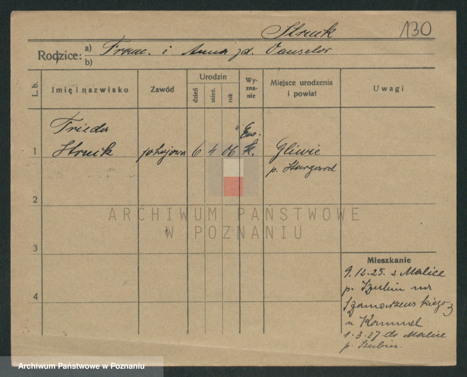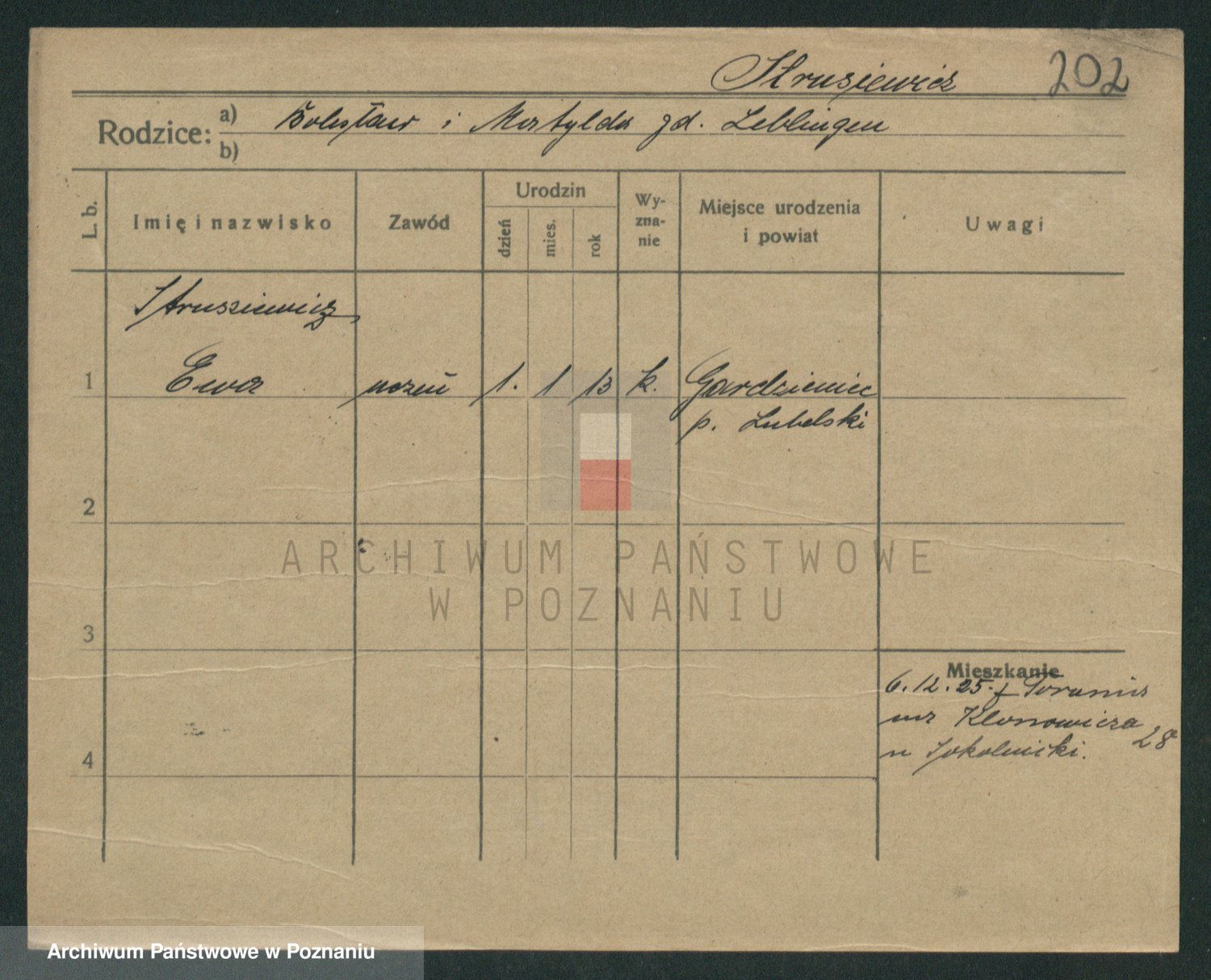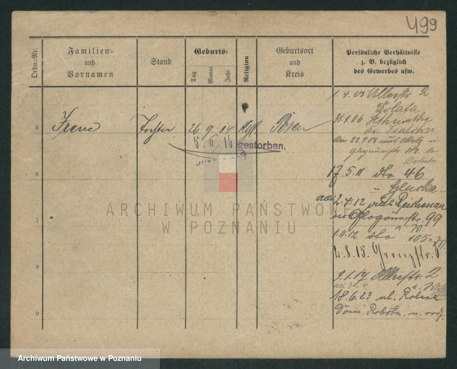 Podgląd karty osobowej dostępny jest po kliknięciu na nazwisko lub ikonkę karty. Można dokonywać powiększenia (ikony na górze) lub przechodzić między kolejnymi skanami (strzałki po bokach).