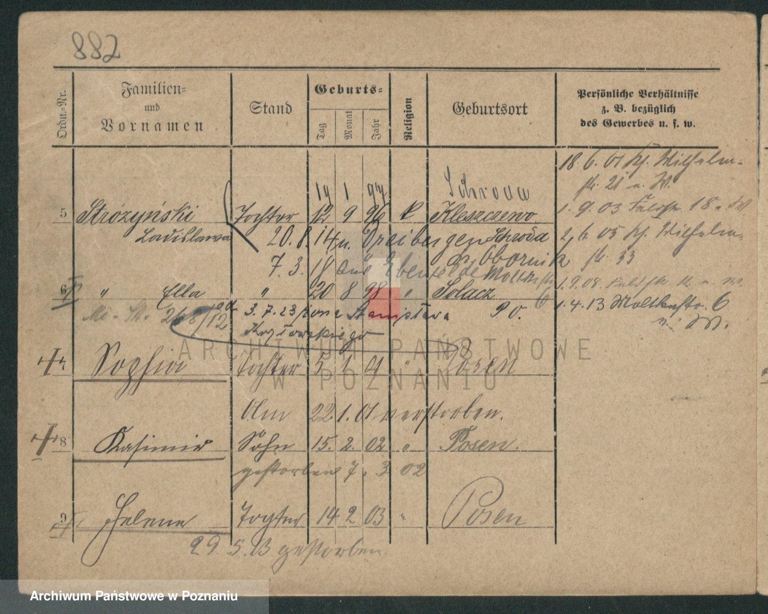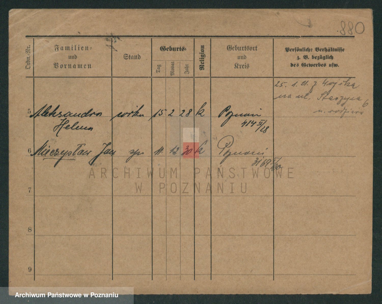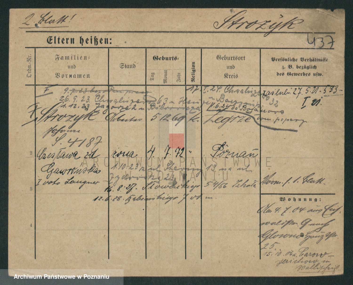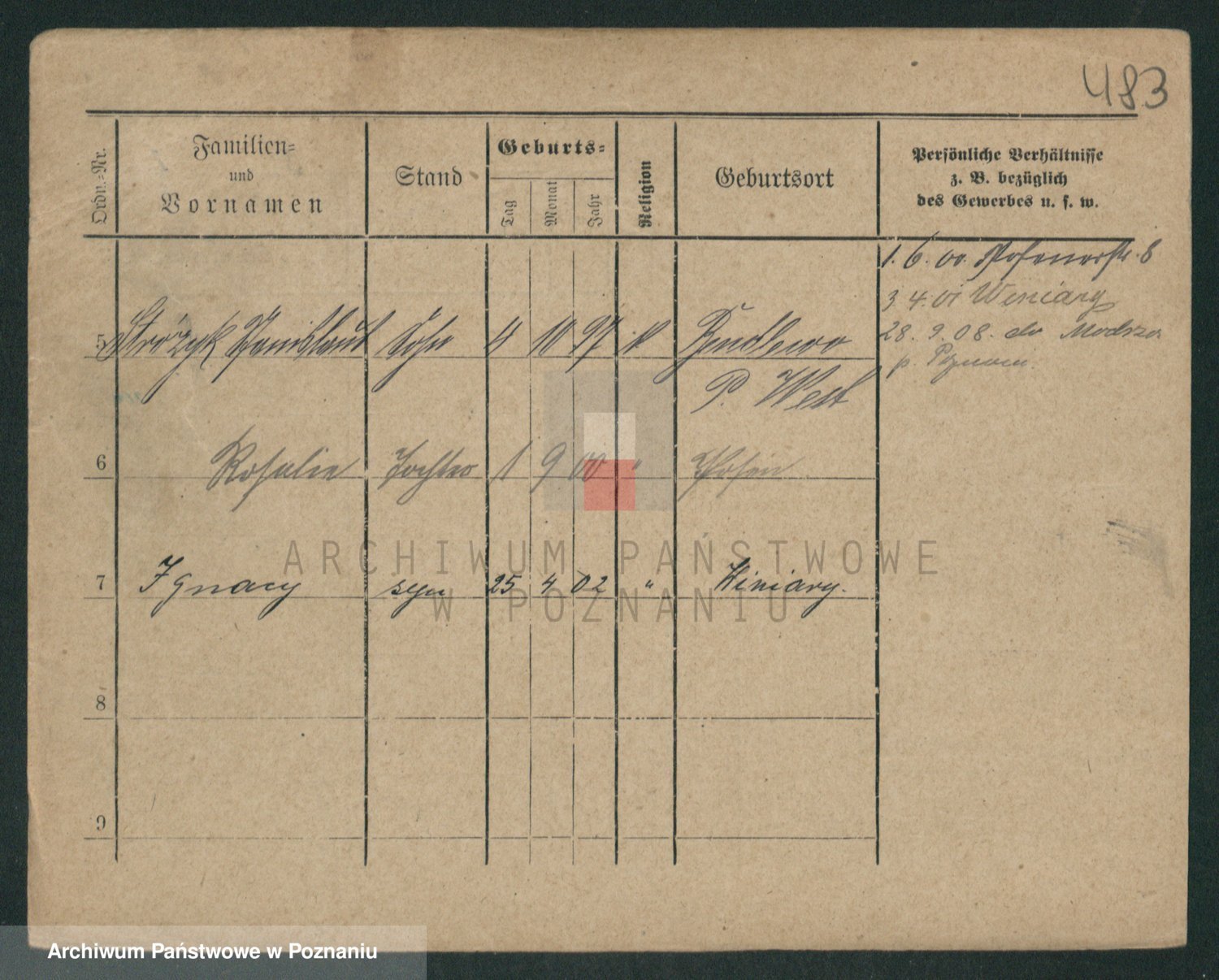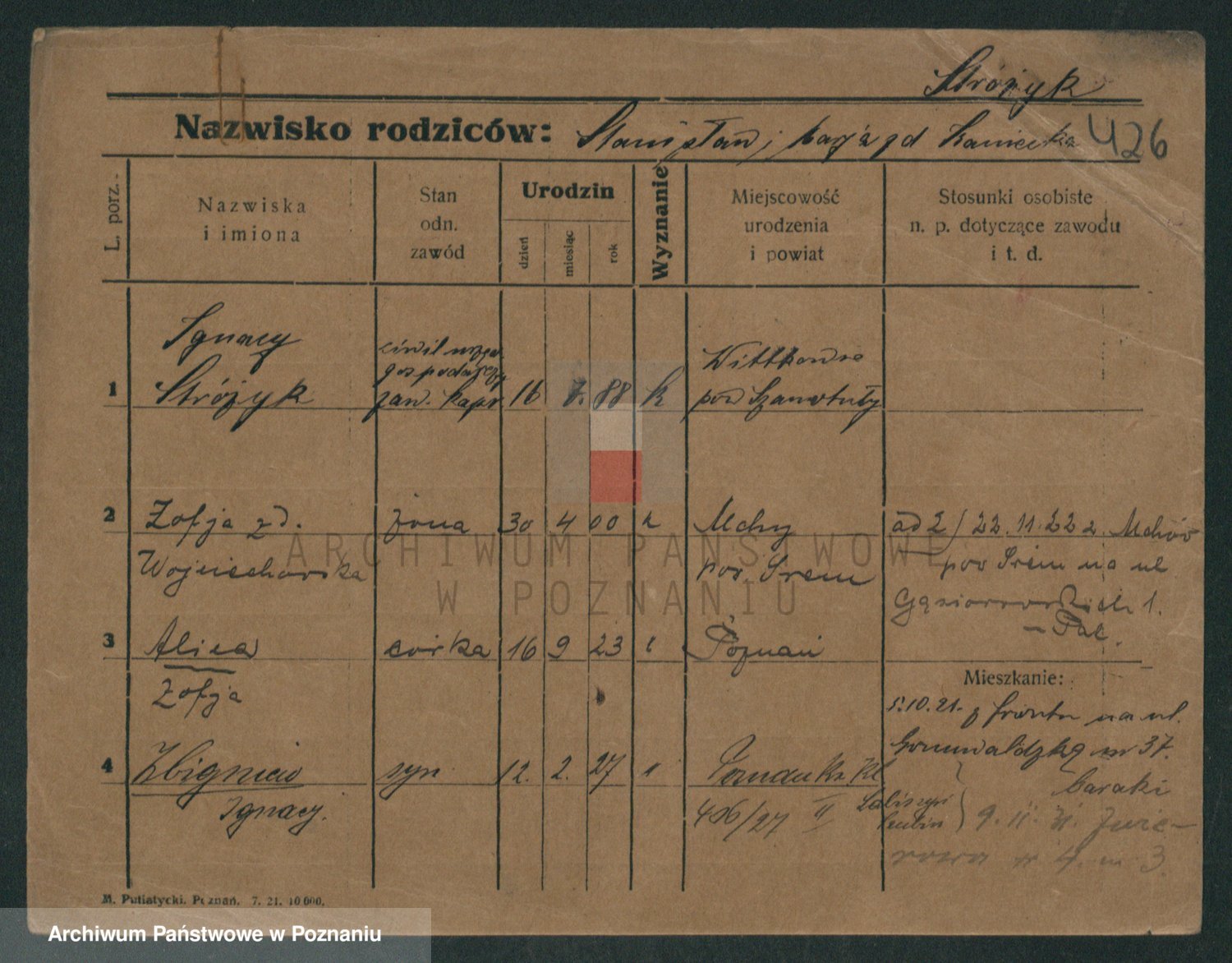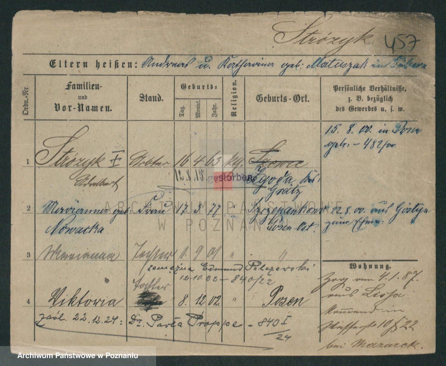 Podgląd karty osobowej dostępny jest po kliknięciu na nazwisko lub ikonkę karty. Można dokonywać powiększenia (ikony na górze) lub przechodzić między kolejnymi skanami (strzałki po bokach).